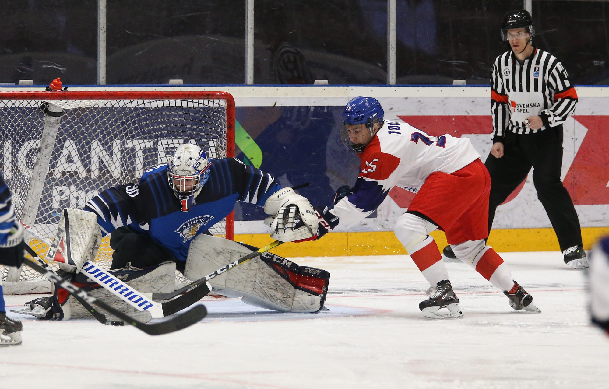 In the third period, pure opportunism was the name of the game on the 3-1 Czech goal. A forechecking Michal Teply fed Jonas Peterek in front of the Finnish net. He stickhandled in and then sent a short, cheeky forehand pass to Toman, who fired it home at 9:53.