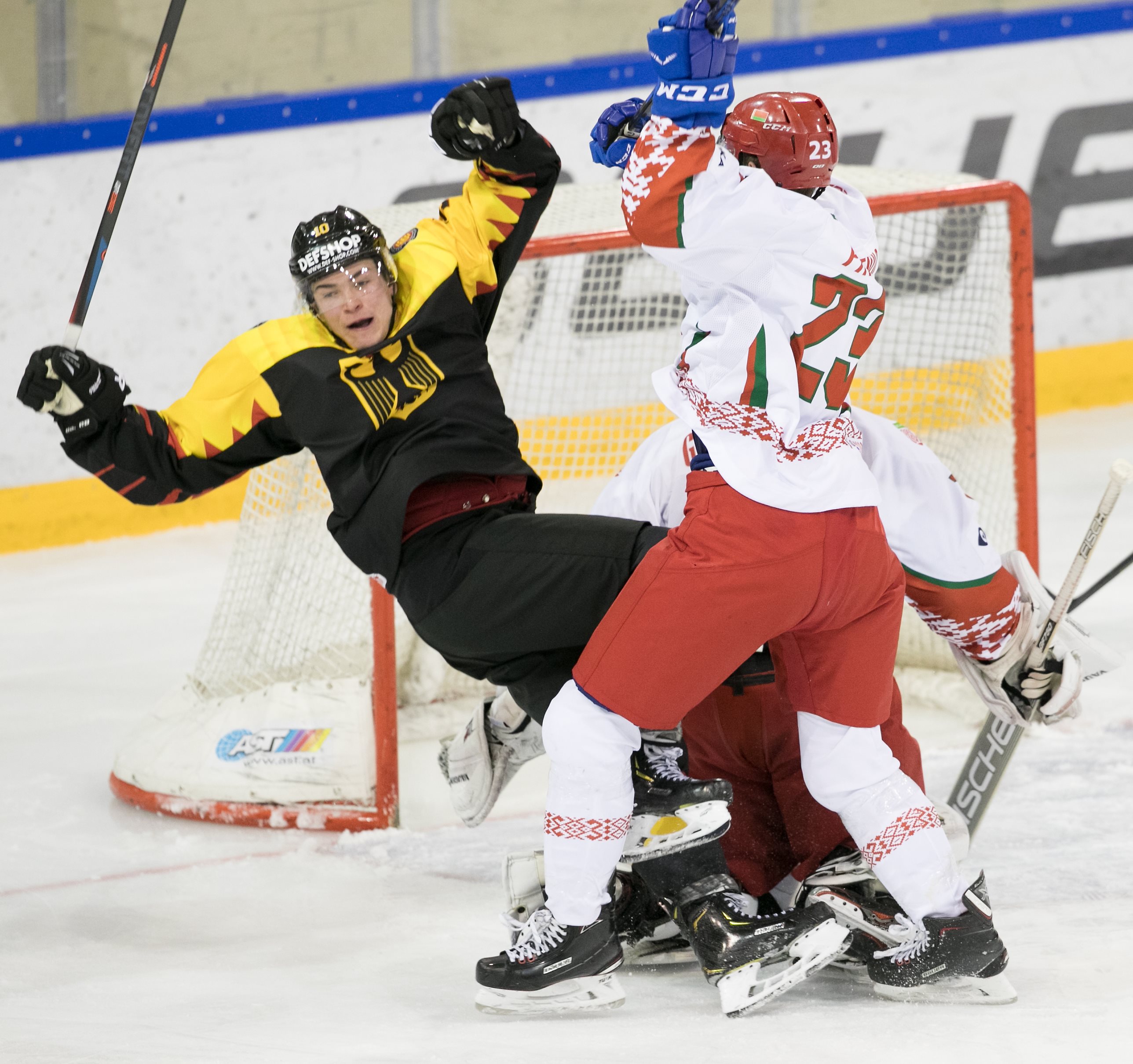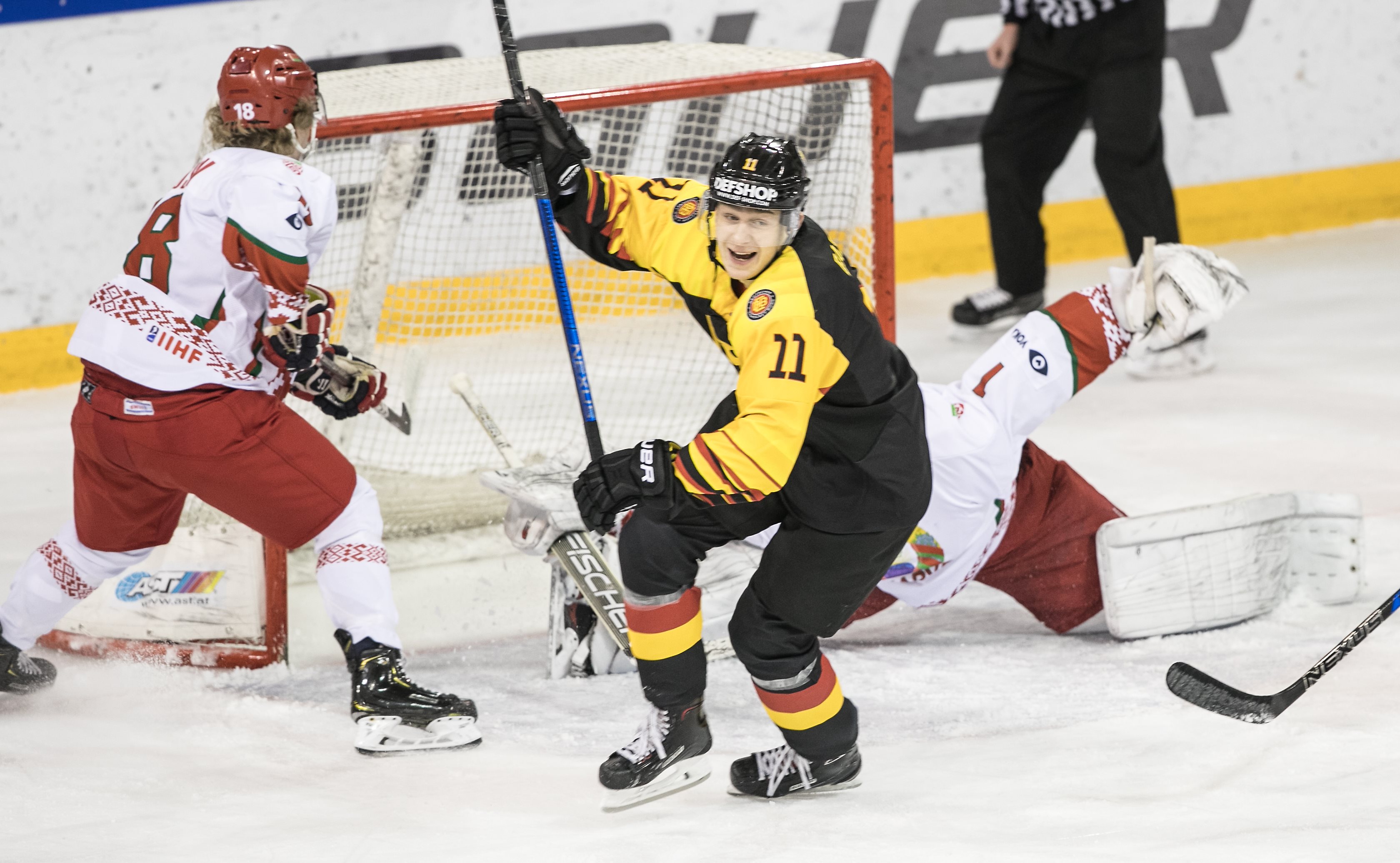 This promotion was largely made possible by Thursday’s tilt against Belarus, both teams having entered the game knowing that a regulation loss to the other team would all but end its chances of moving up to the world’s elite group. Eventual silver medallist Belarus had won its first three games in regulation while Germany had done the same, albeit the first one was a 3-2 shootout victory over arch rival Austria to kick off the tournament.In light of the dominance Belarus had shown to date, it was all that much more surprising that Germany was able to take a commanding 3-0 lead within the first 12 minutes of the game thanks to goals by Justin Schutz, Marco Bassler, and Tim Wohlgemuth. They almost ended the period with another goal on top of that, but Tim Brunnhuber failed to capitalize on a shorthanded breakaway in which he beat goaltender Nikita Tolopilo, who had just replaced starting goaltender Andrei Grishenko, but then missed the wide-open net with his shot.