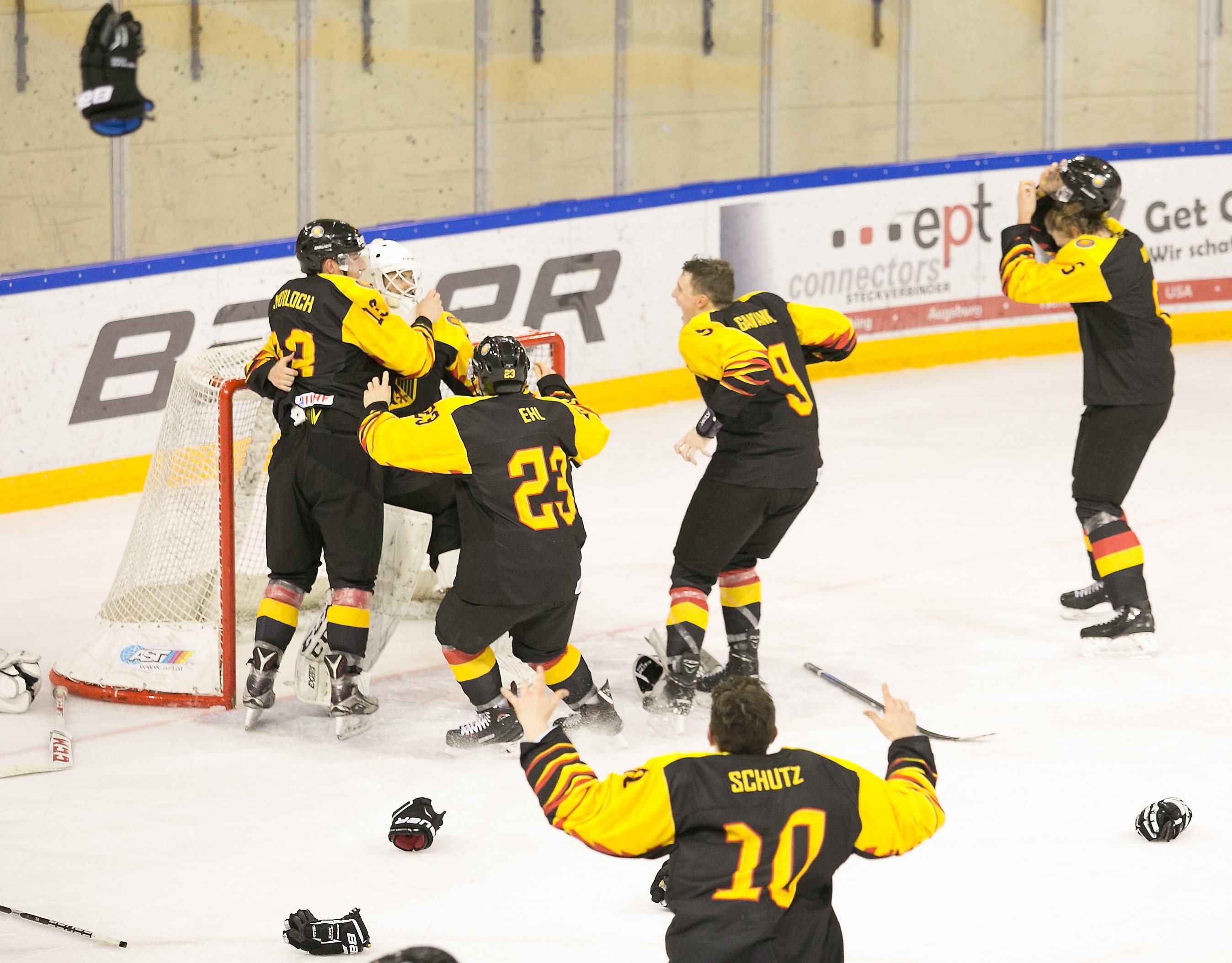 Aufstieg! Germany’s U20 national team celebrates promotion to the 2020 IIHF World Junior Championship in the Czech Republic.