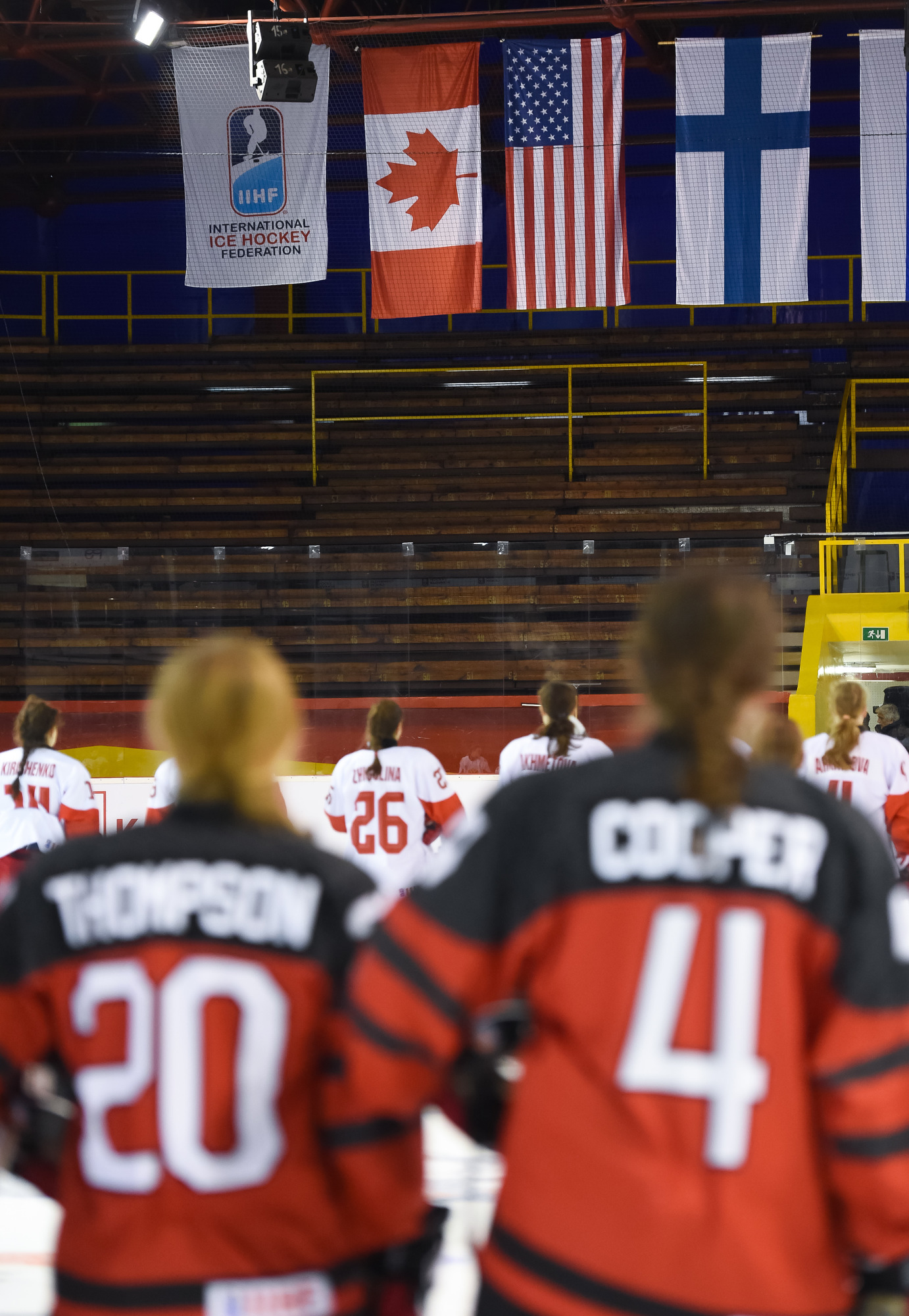 Canada deserved its lead; Russia was unable to get a shot on Eve Gascon’s net in the opening frame despite its hard work in slowing Canada’s offence. The Russians did get an uninterrupted two-minute power play after 15 minutes, prompting chants of ‘ROS-SI-YA!’ from the crowd, but the offence faltered in the face of a disciplined Canadian penalty kill and failed to threaten the goal.
