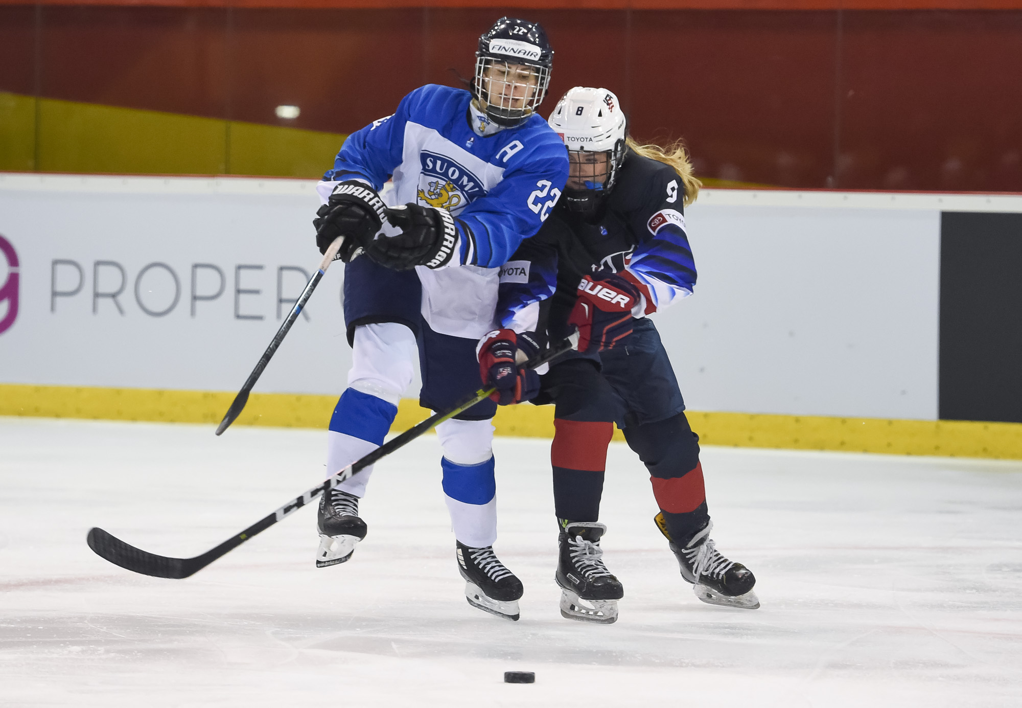 However, it didn’t take long for Finland to reply. Seconds after taking the lead, the Americans were on the penalty kill and Kiira Yrjanen chased the puck down behind the net. Goalie Skylar Vetter was rushed into a clearance, Yrjanen intercepted and exchanged passes with Sofia Nuutinen before shooting home.