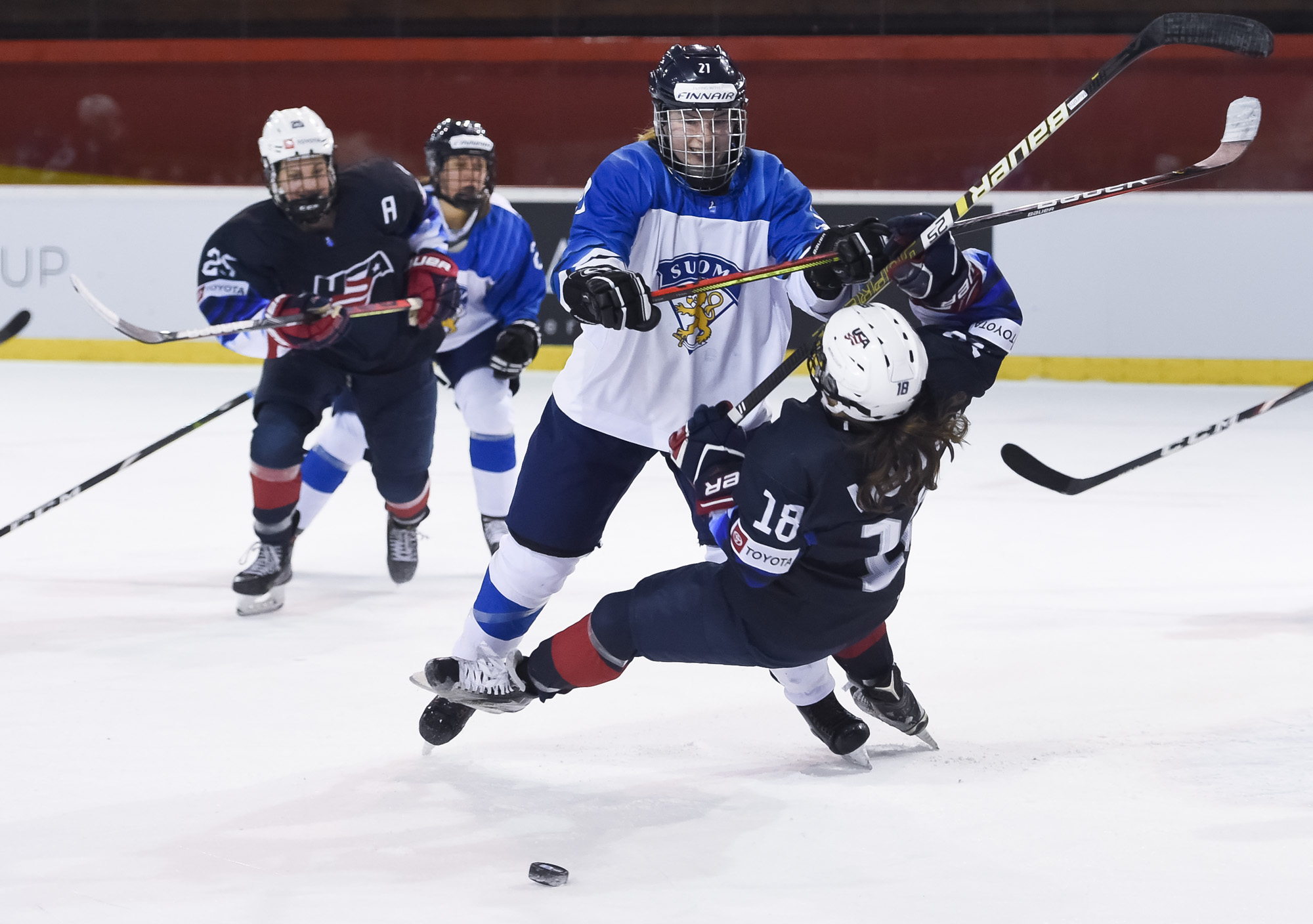 As is often the case in games between North American teams and their European counterparts at this level, a strong goaltender was crucial for the Finns in the first period. Team USA dominated the play, boasting a 15-3 advantage on the shot count. However, Aino Laitinen came up with most of the answers. The 17-year-old made her World Championship debut at last year’s tournament and was entrusted with the start here; she produced a solid show in the first period, beaten just once when the American power play broke the deadlock midway through the opening session.