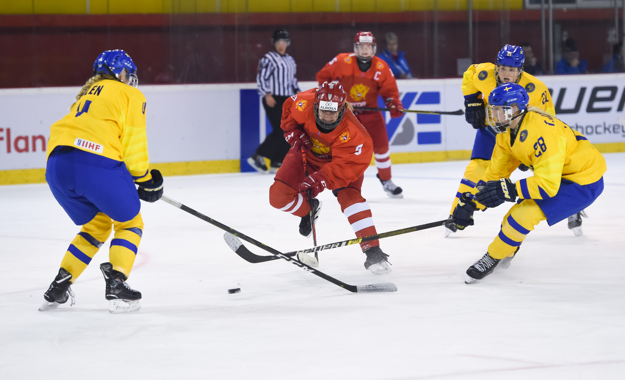 At the start of the third, though, the Russians took the game away from Sweden. The impressive first line was at it again, with Luchnikova sliding a pass through the legs of a Swedish defenceman to set Shashkina through on goal. She made no mistake to claim her fourth goal of the tournament.