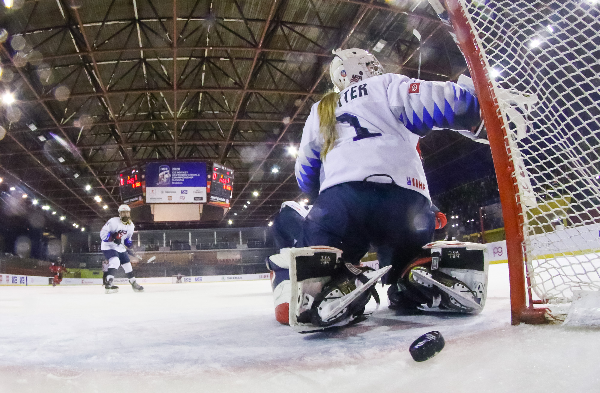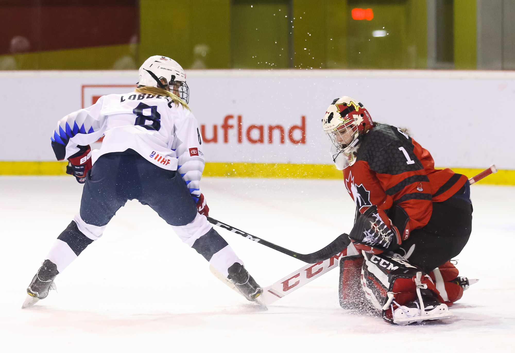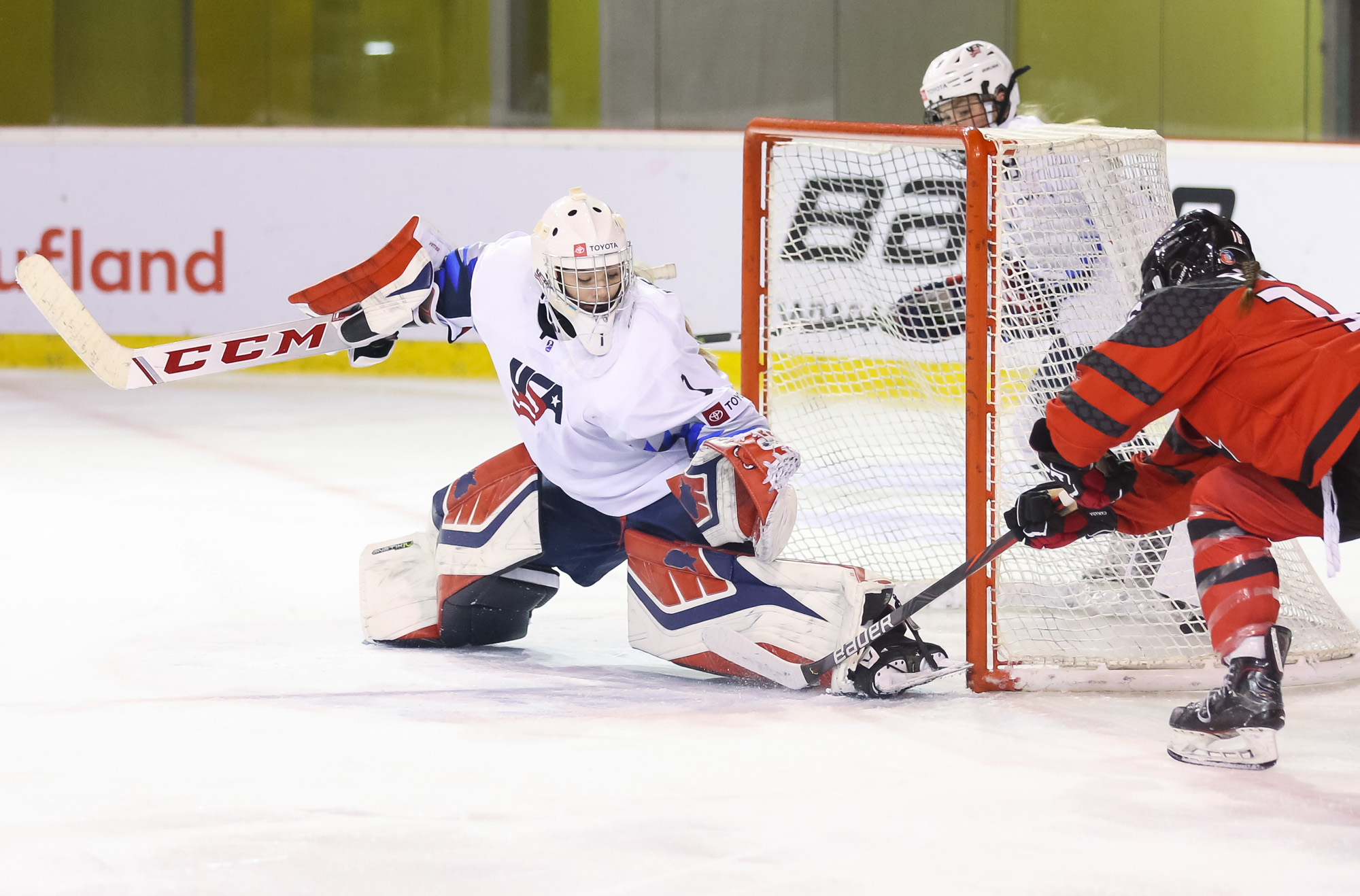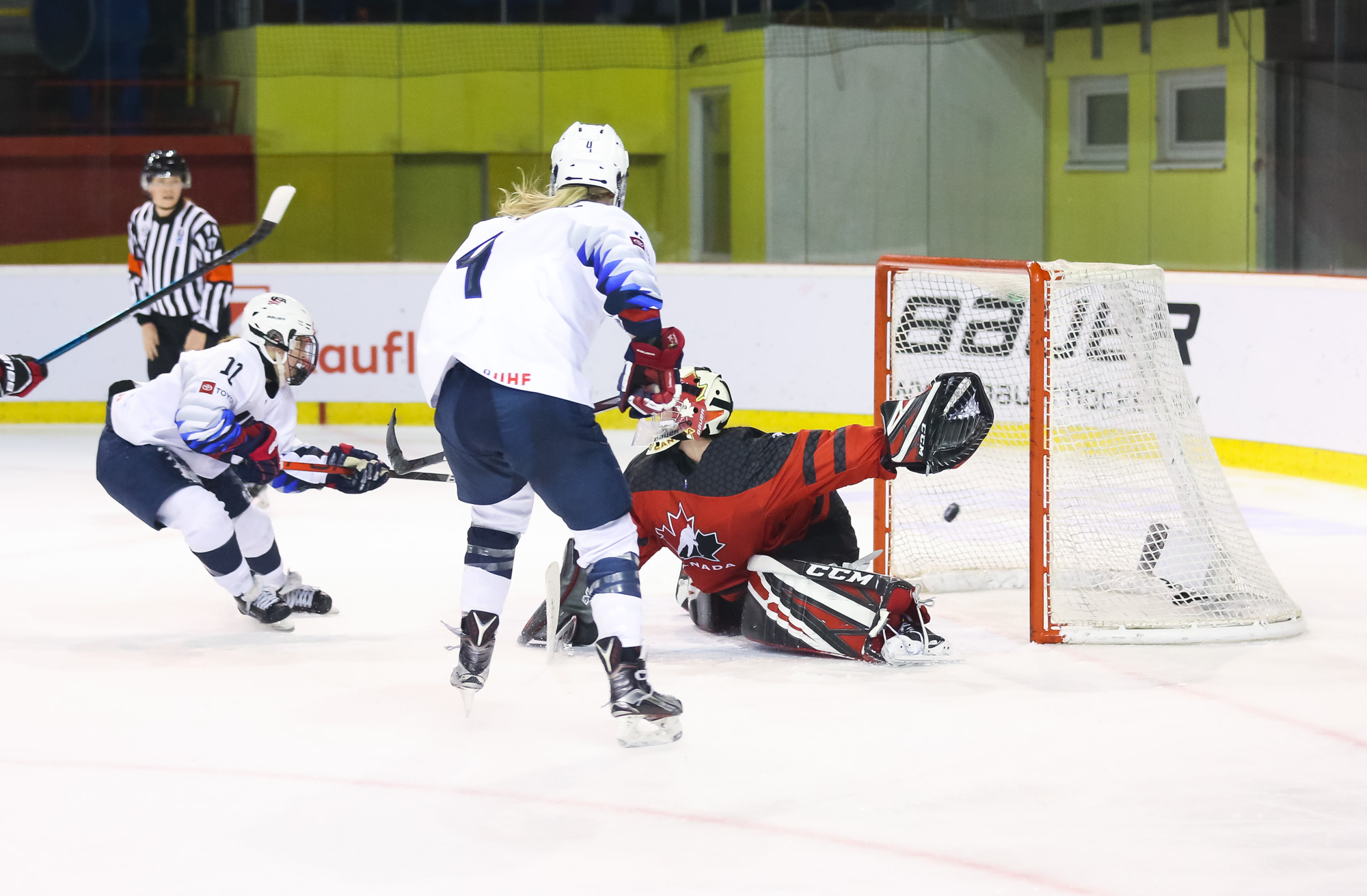Just that happened when a U.S. shot in the 13th minute during a short 2-on-0 situation in front of the net hit the post and was followed by a Canadian breakaway, which Vetter was able to get a piece of, deflecting it up to the glass.