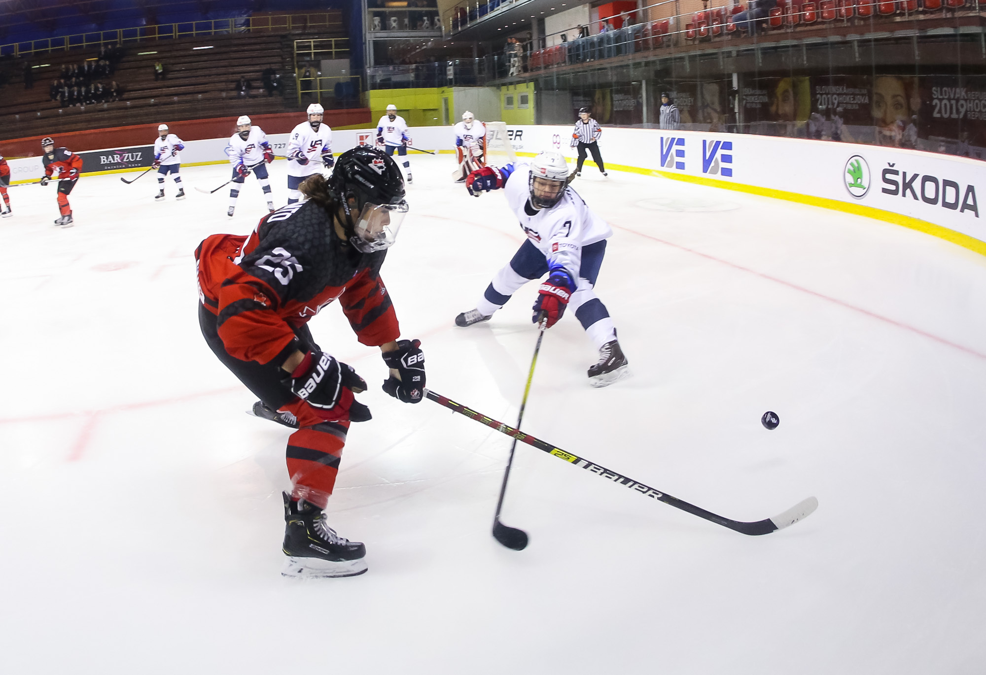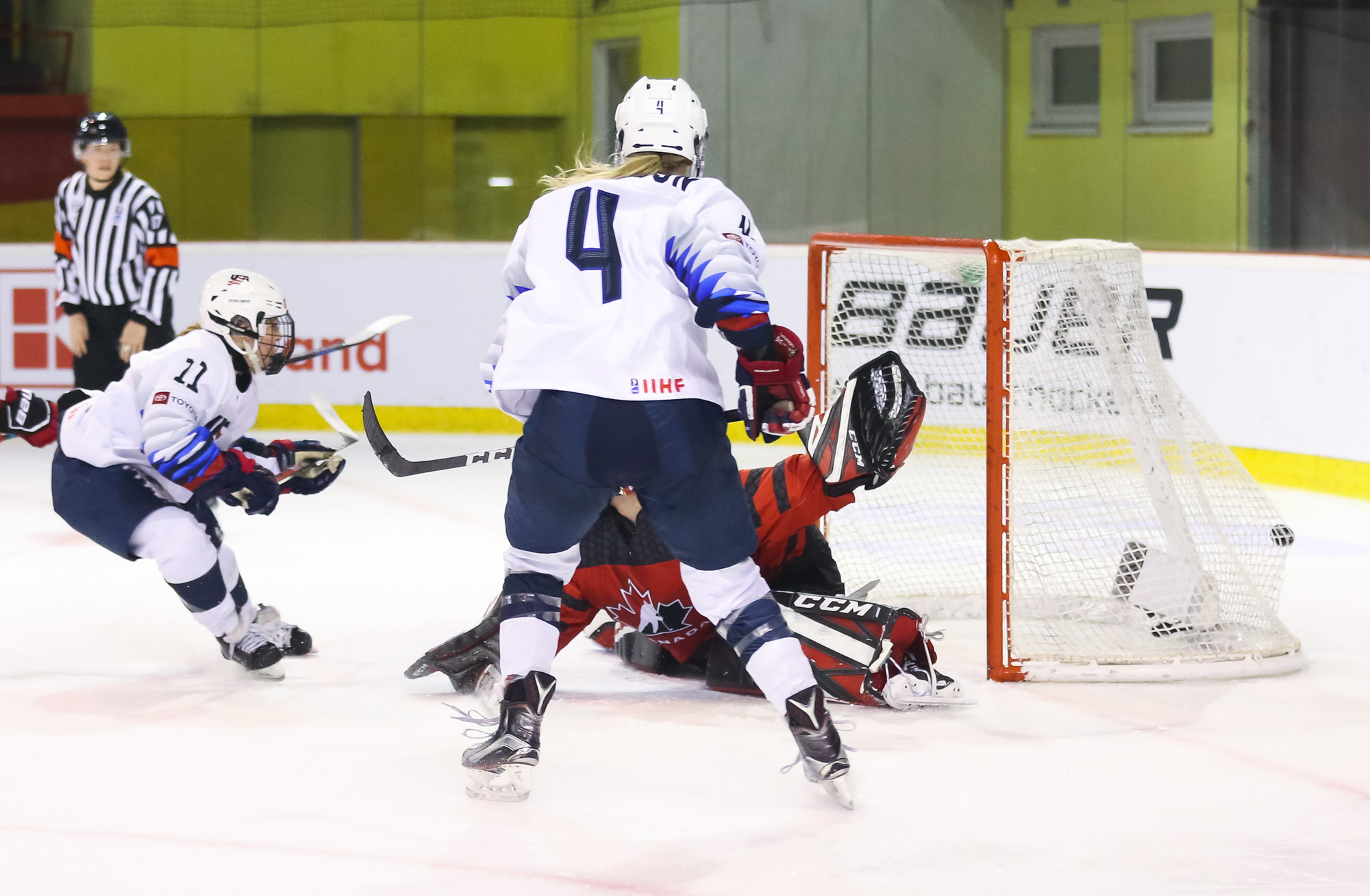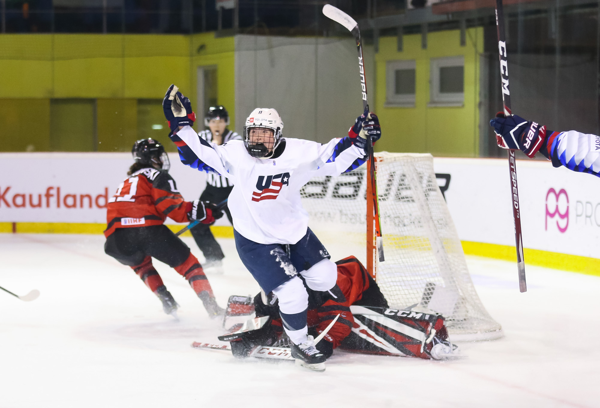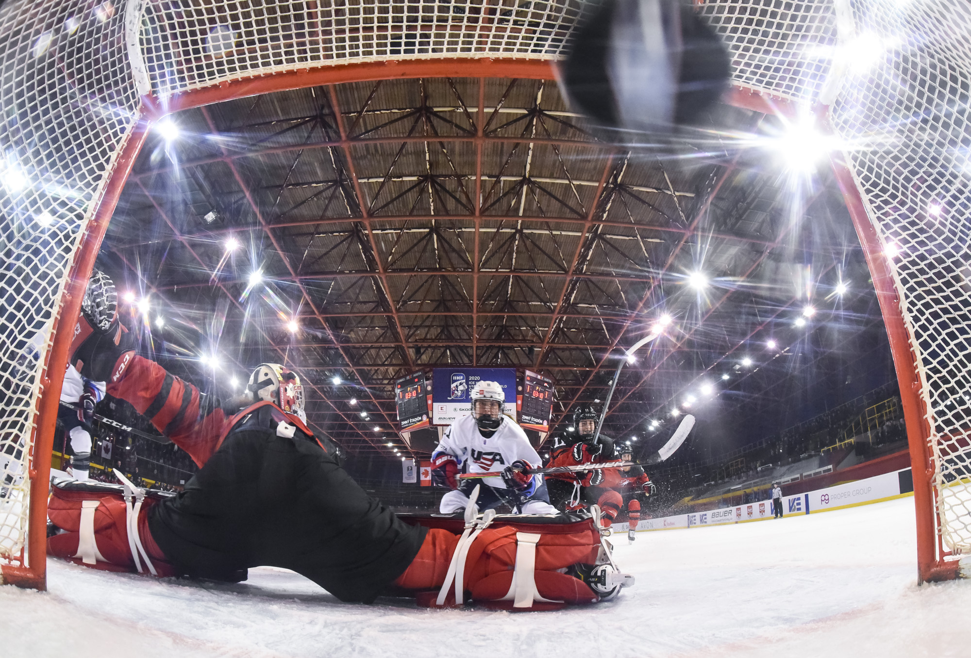 Just that happened when a U.S. shot in the 13th minute during a short 2-on-0 situation in front of the net hit the post and was followed by a Canadian breakaway, which Vetter was able to get a piece of, deflecting it up to the glass.