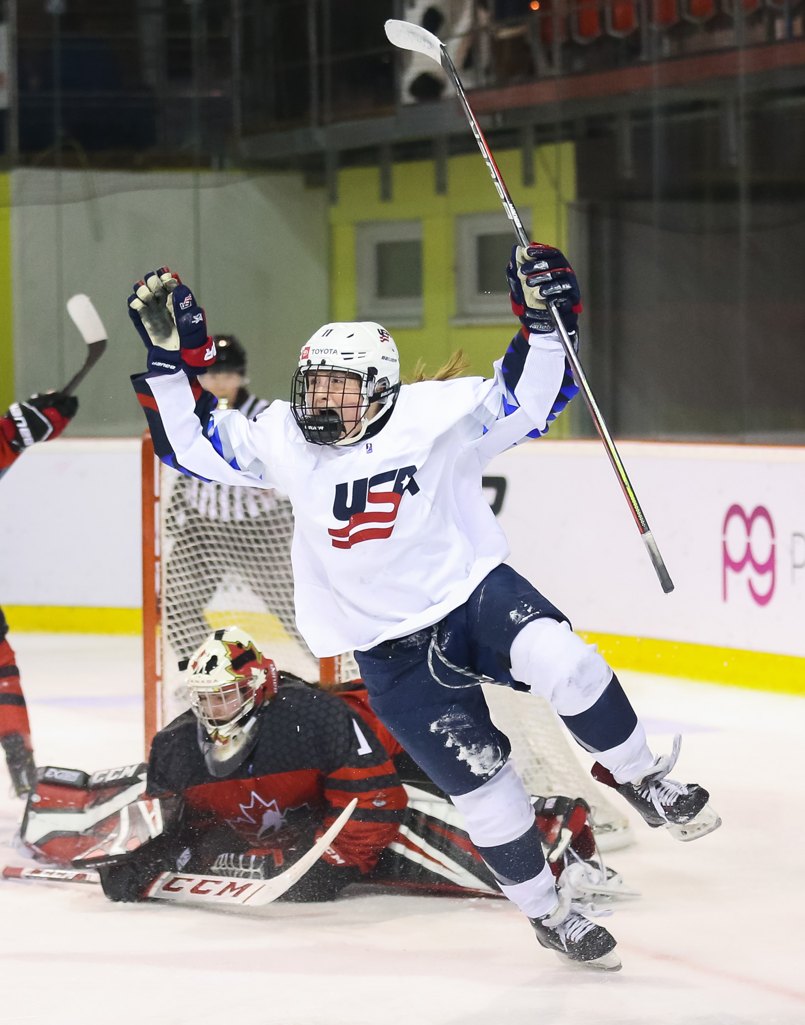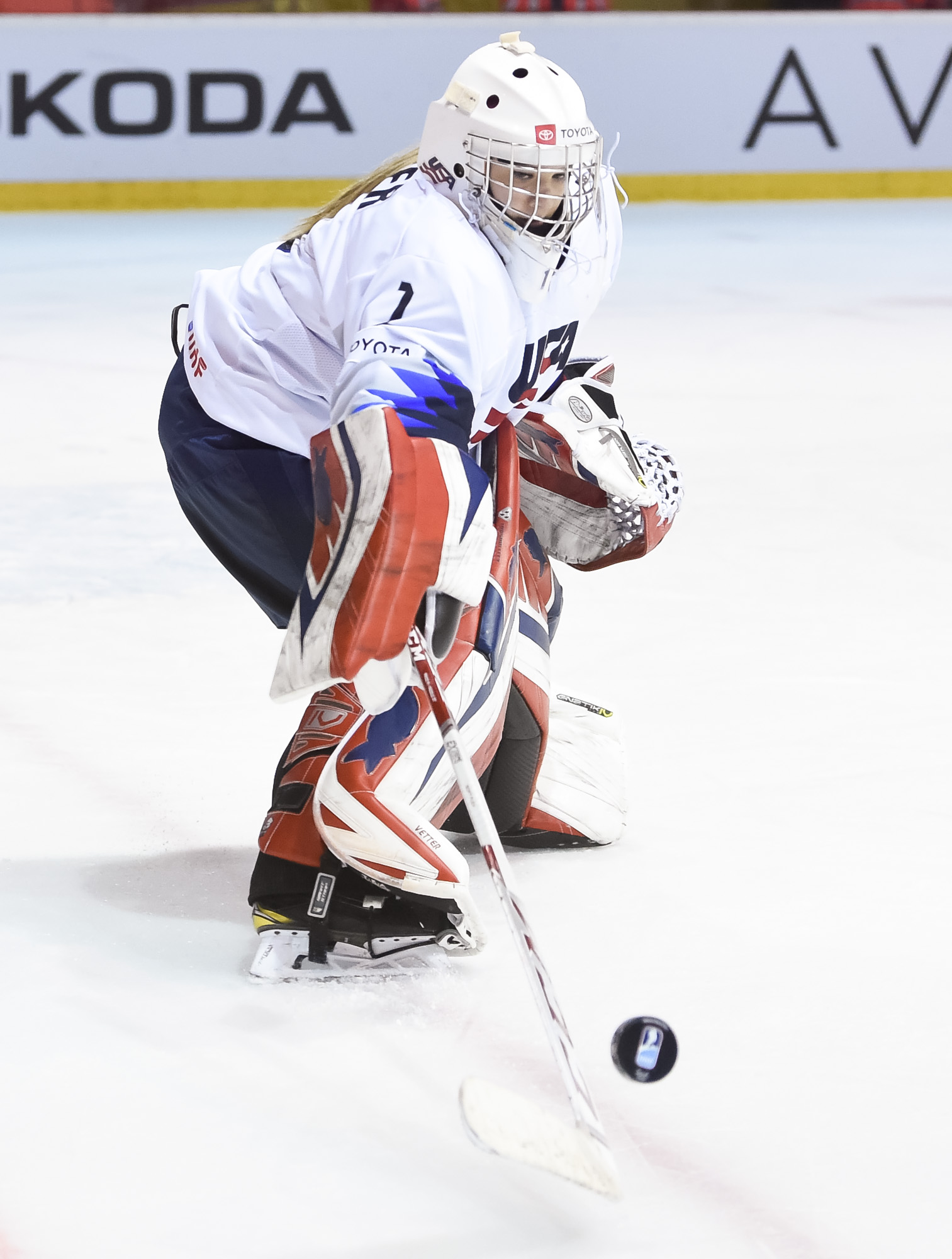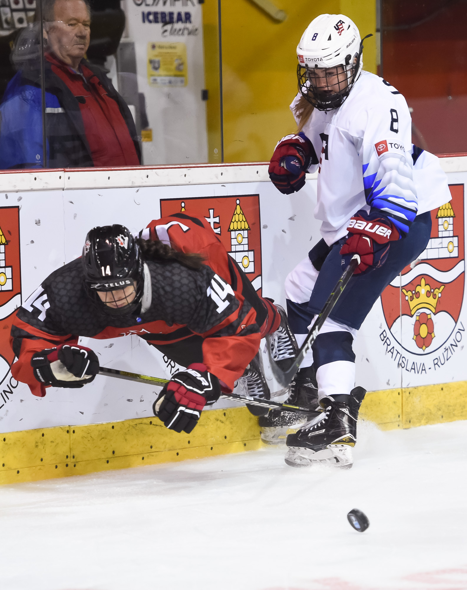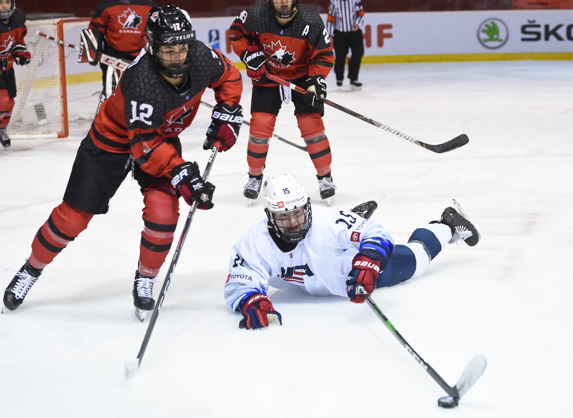 Just that happened when a U.S. shot in the 13th minute during a short 2-on-0 situation in front of the net hit the post and was followed by a Canadian breakaway, which Vetter was able to get a piece of, deflecting it up to the glass.