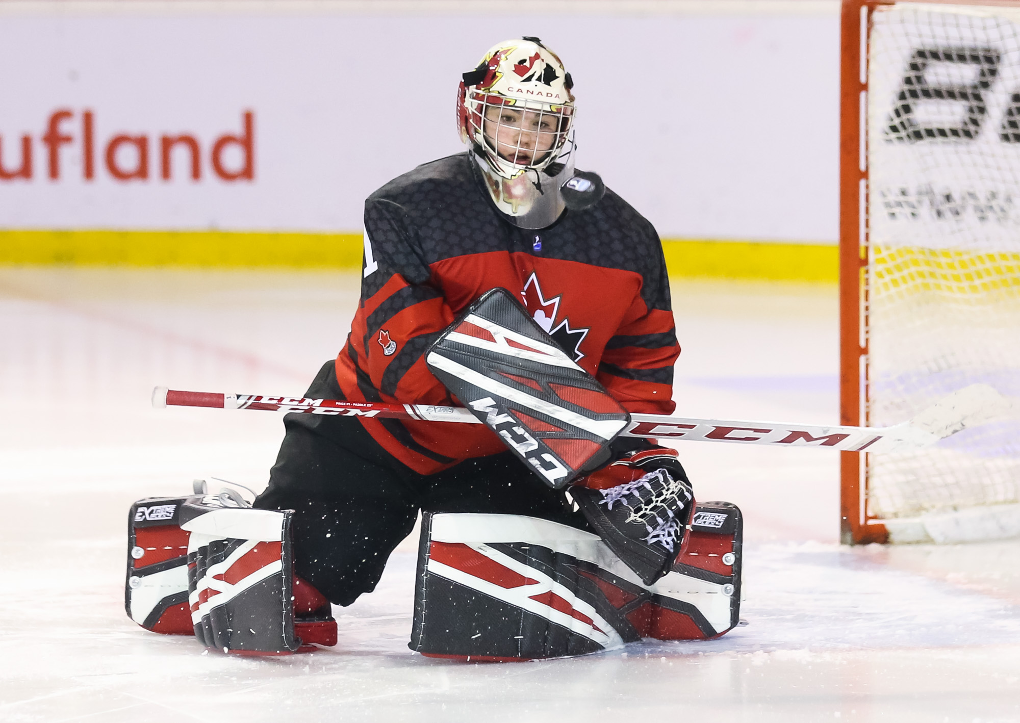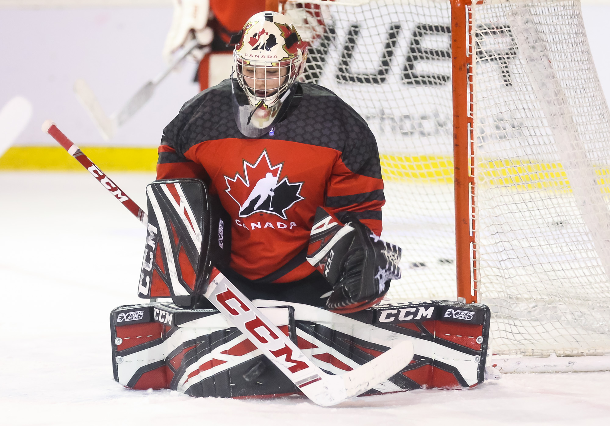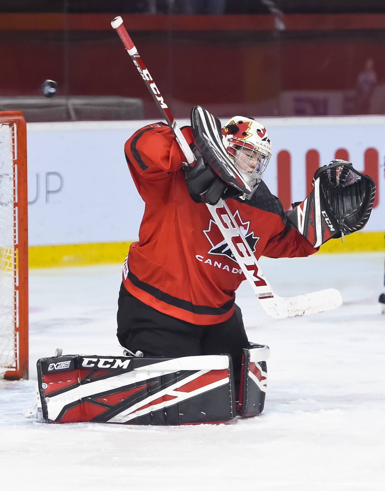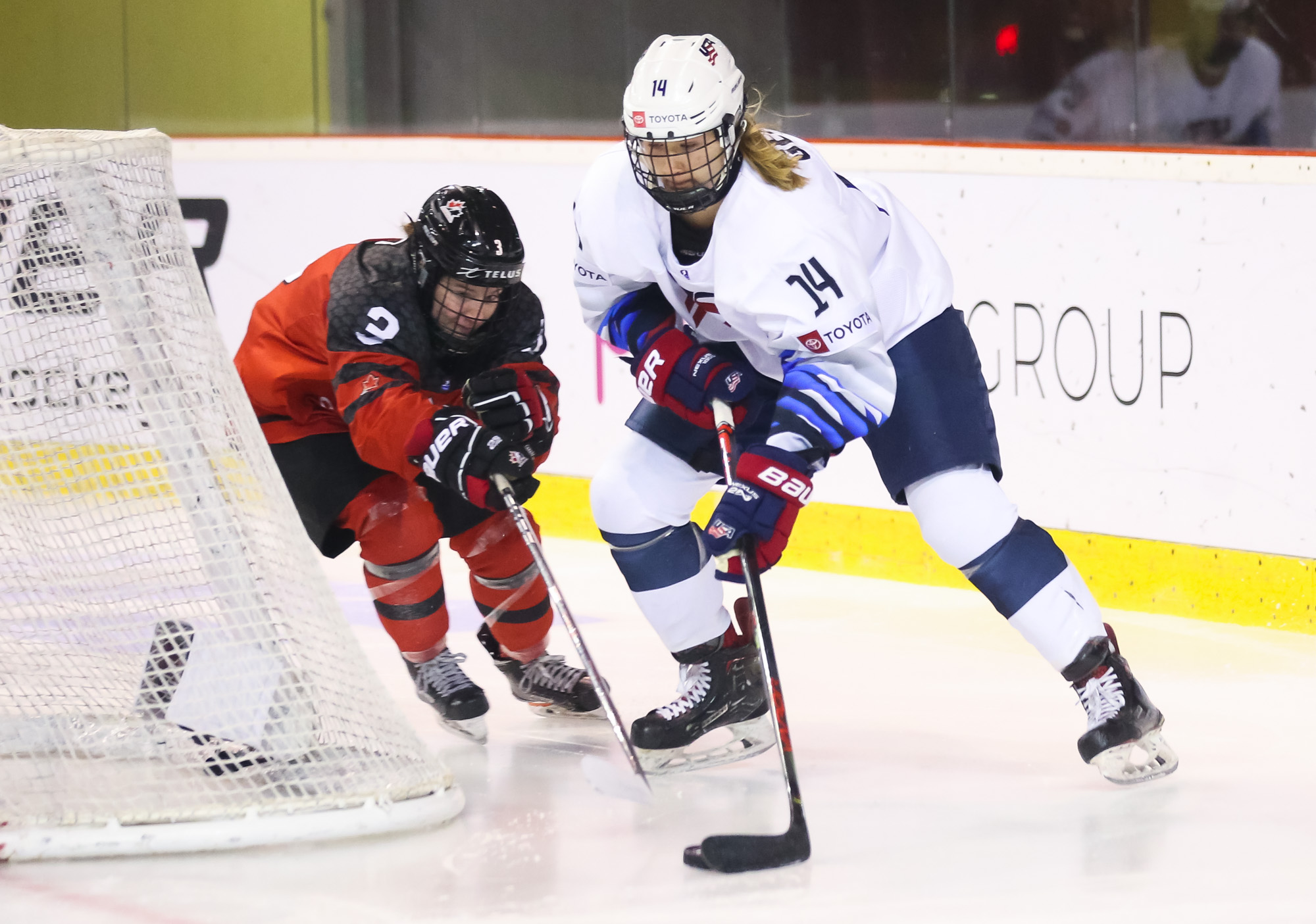 Just that happened when a U.S. shot in the 13th minute during a short 2-on-0 situation in front of the net hit the post and was followed by a Canadian breakaway, which Vetter was able to get a piece of, deflecting it up to the glass.