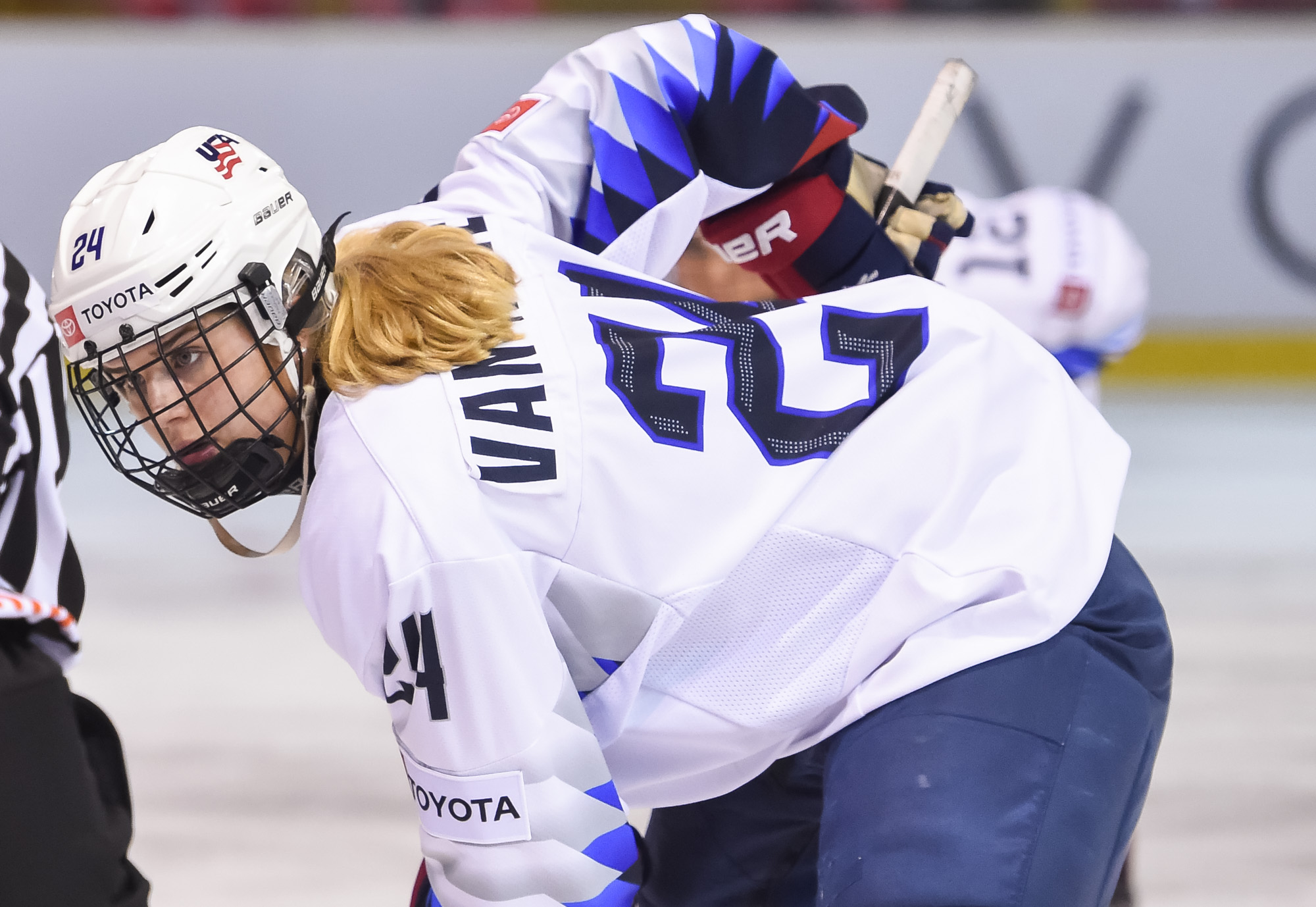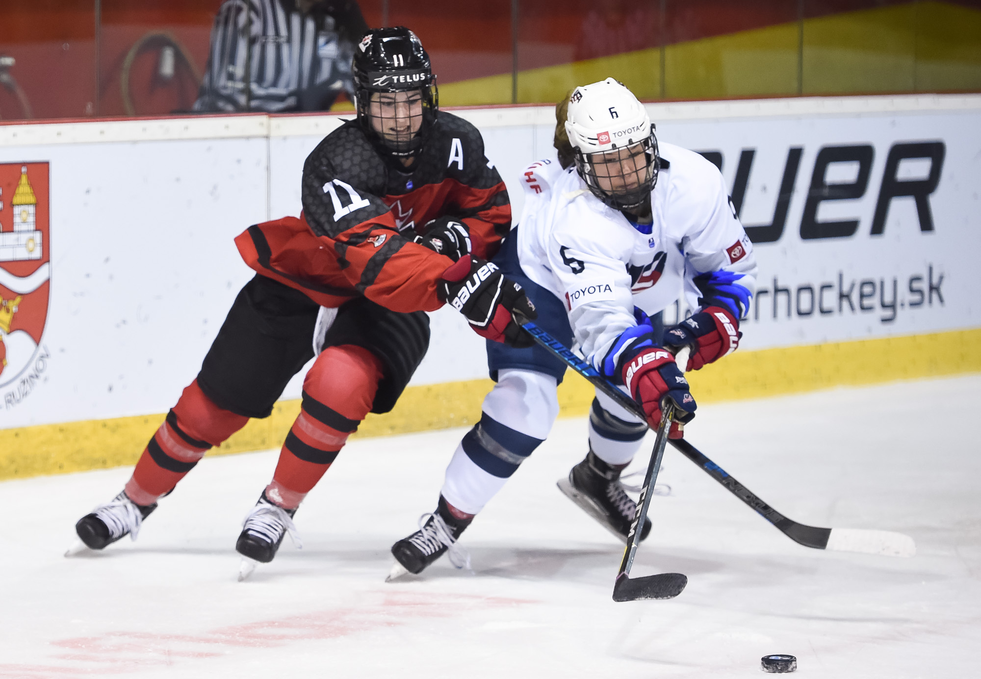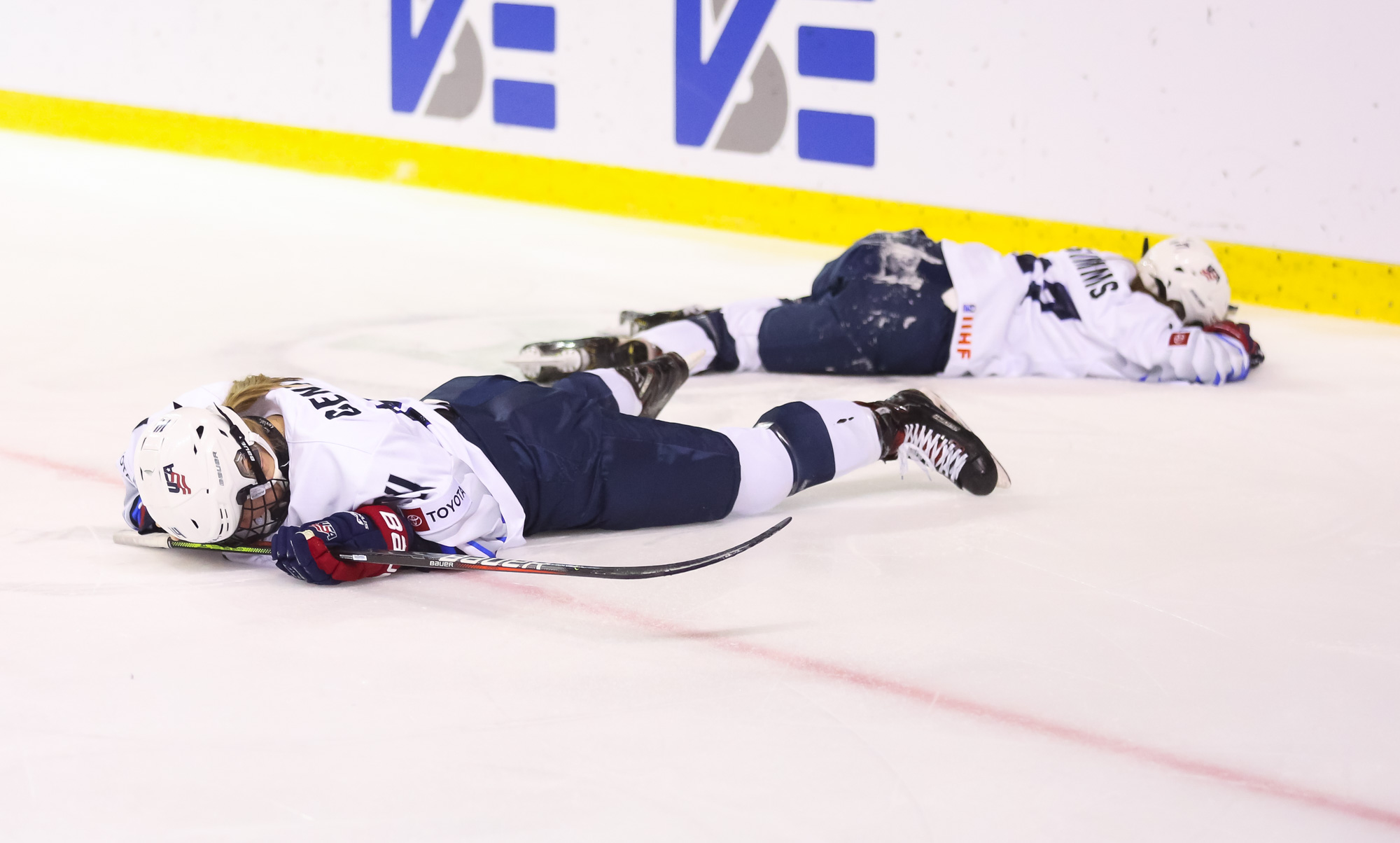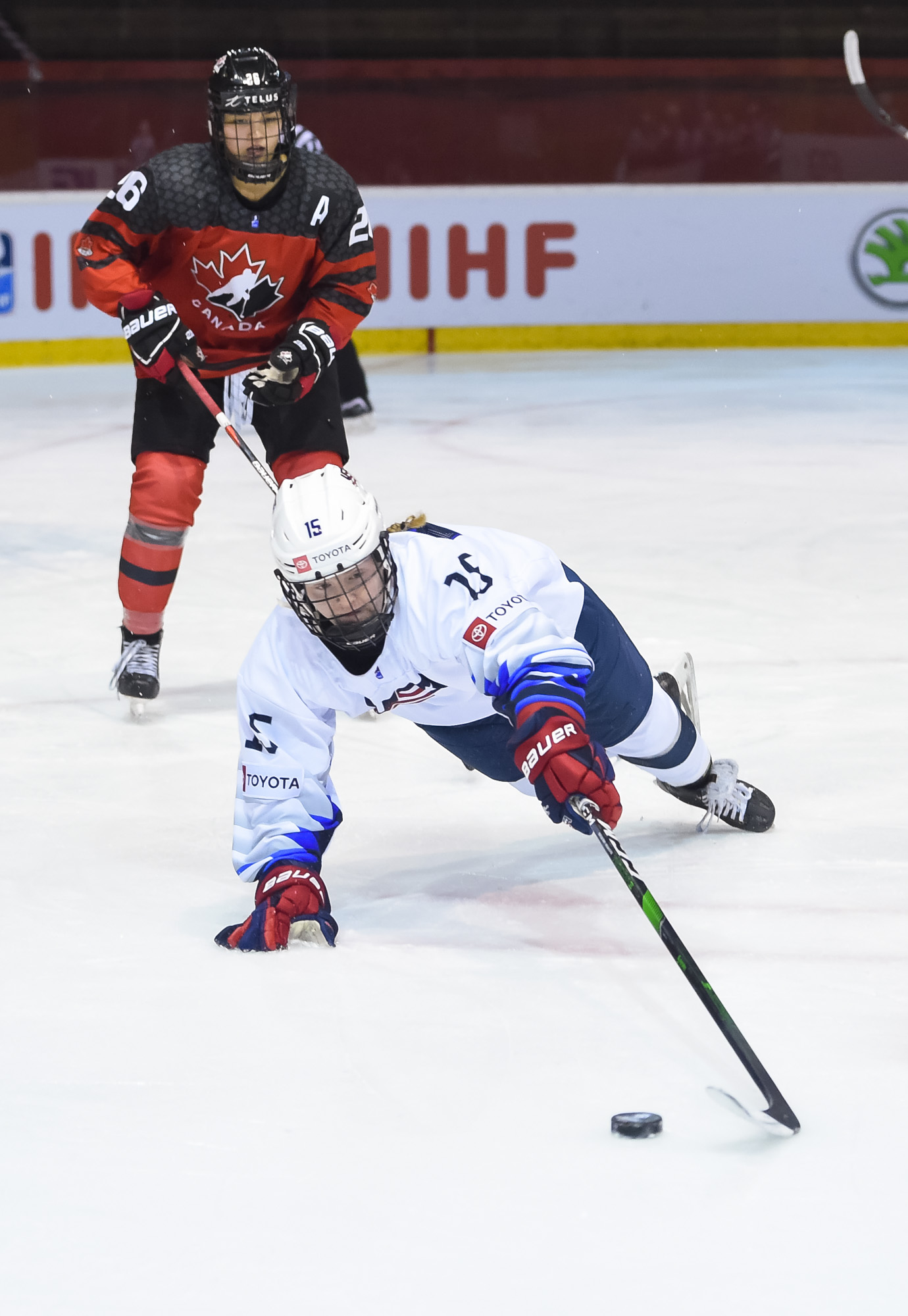 Intense first period play continued until a stoppage was needed after two U.S. players inadvertently collided at top speed in Canada’s zone, both needing a while to be able to get up. Emma Gentry, one of the heroes in the semi-final victory over Russia, took the brunt of the collision, effectively taking her out of play for most of the night.