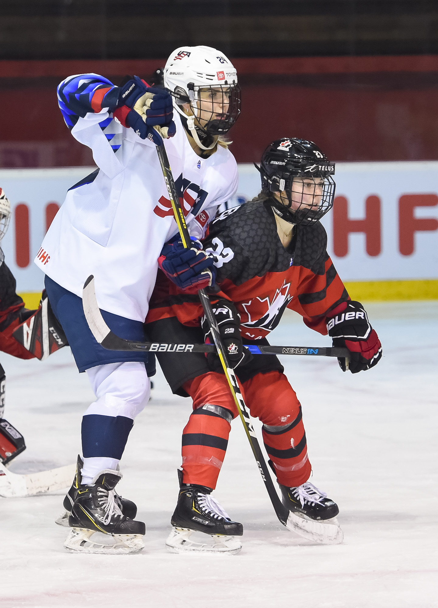 From the first drop of the puck, the arch rivals fought for every centimetre of ice with the USA creating the bulk of the sustained pressure while Canada had the upper hand in odd-woman rushes, none more glaring than when U.S. defender Mia Biotti unintentionally lost the puck in her own zone while looking for passing options, giving Canada a breakaway just nine minutes into the game, but U.S. goalie Skylar Vetter was up to the task with a strong stick save. It would become one of many.