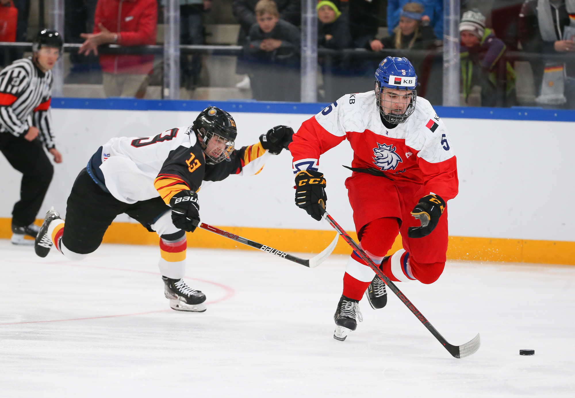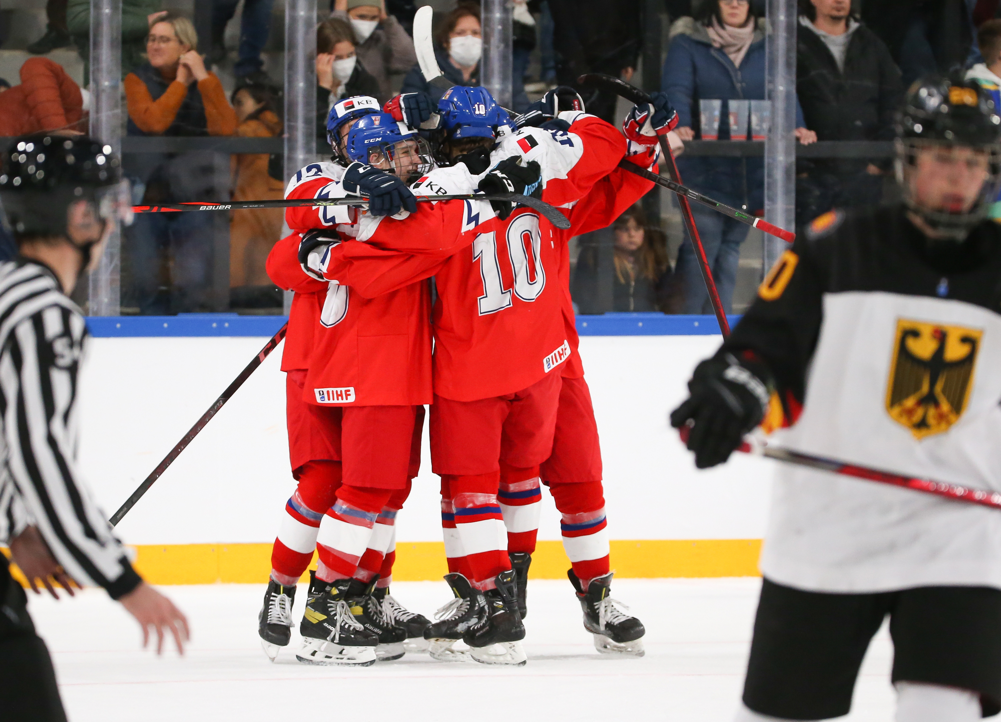 In the opening game of Group A of the 2022 IIHF Ice Hockey U18 World Championship, the host Germans took leads of 1-0 and 2-1 but couldn’t handle the powerful Czech power play, which struck three times in the last half of the second period, powering Czechia to a 4-2 win. Leading the way were captain Jiri Kulich with two goals and 2005-born Eduard Sale with three assists.