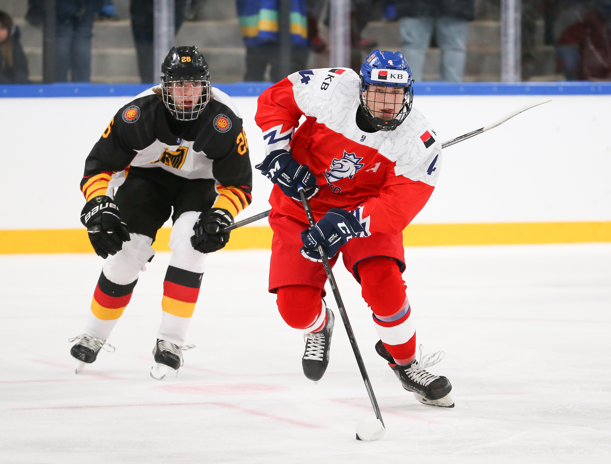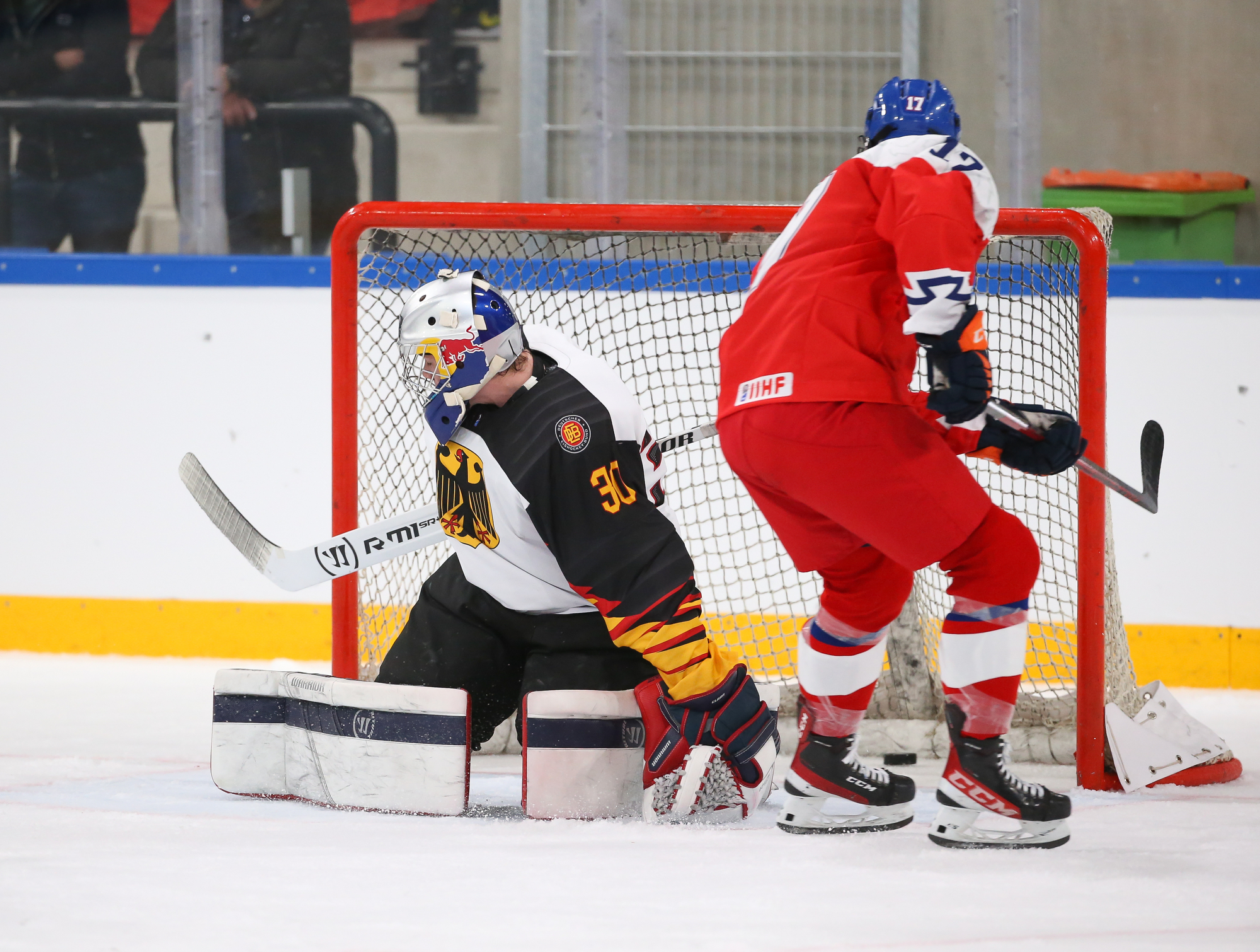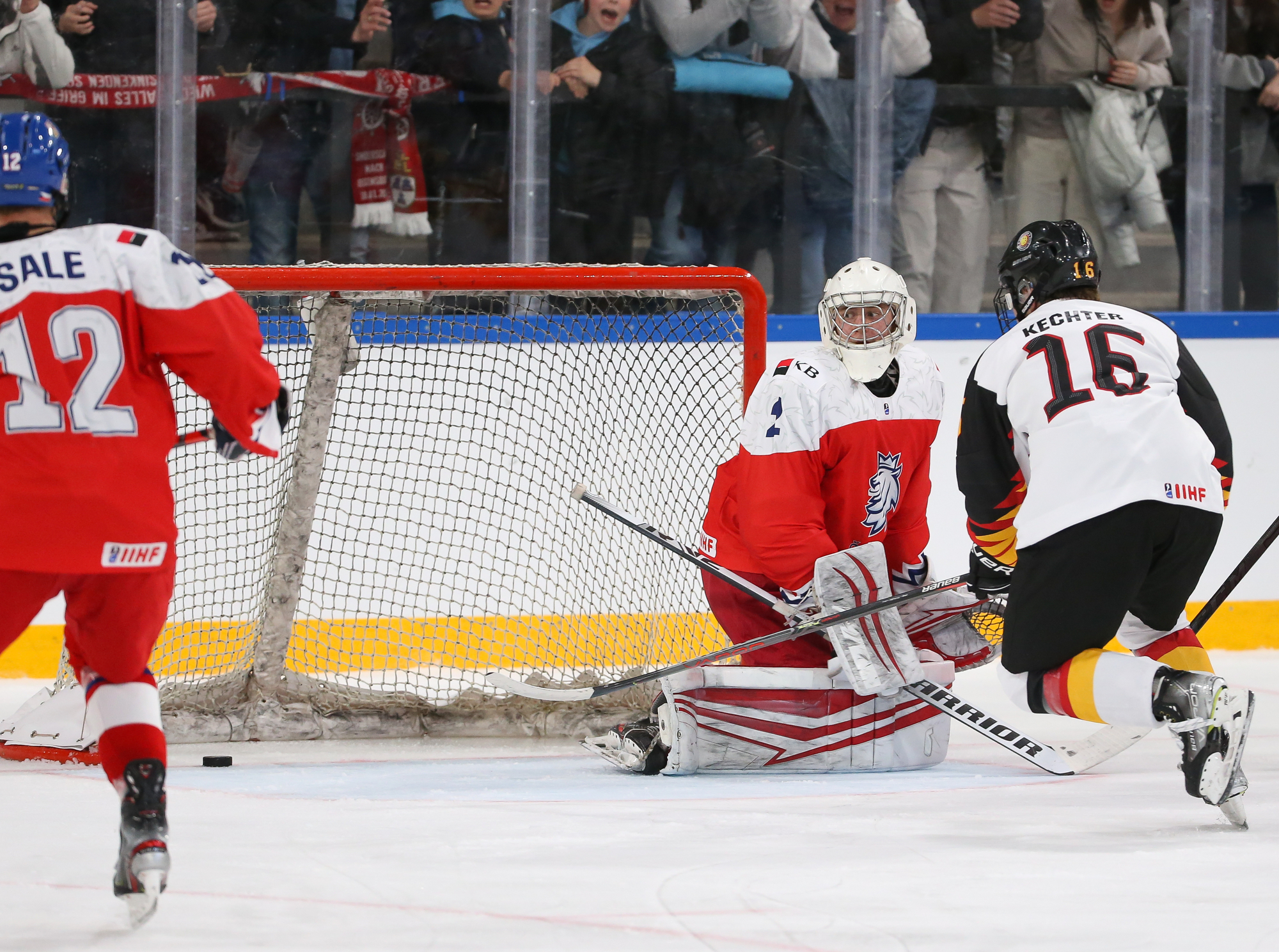The Germans opened the scoring right off an attacking-zone faceoff in the seventh minute when Julian Lutz’s quick shot got through Jan Spunar’s pads and just sat in the crease, where captain Roman Kechter just had to tap it in.