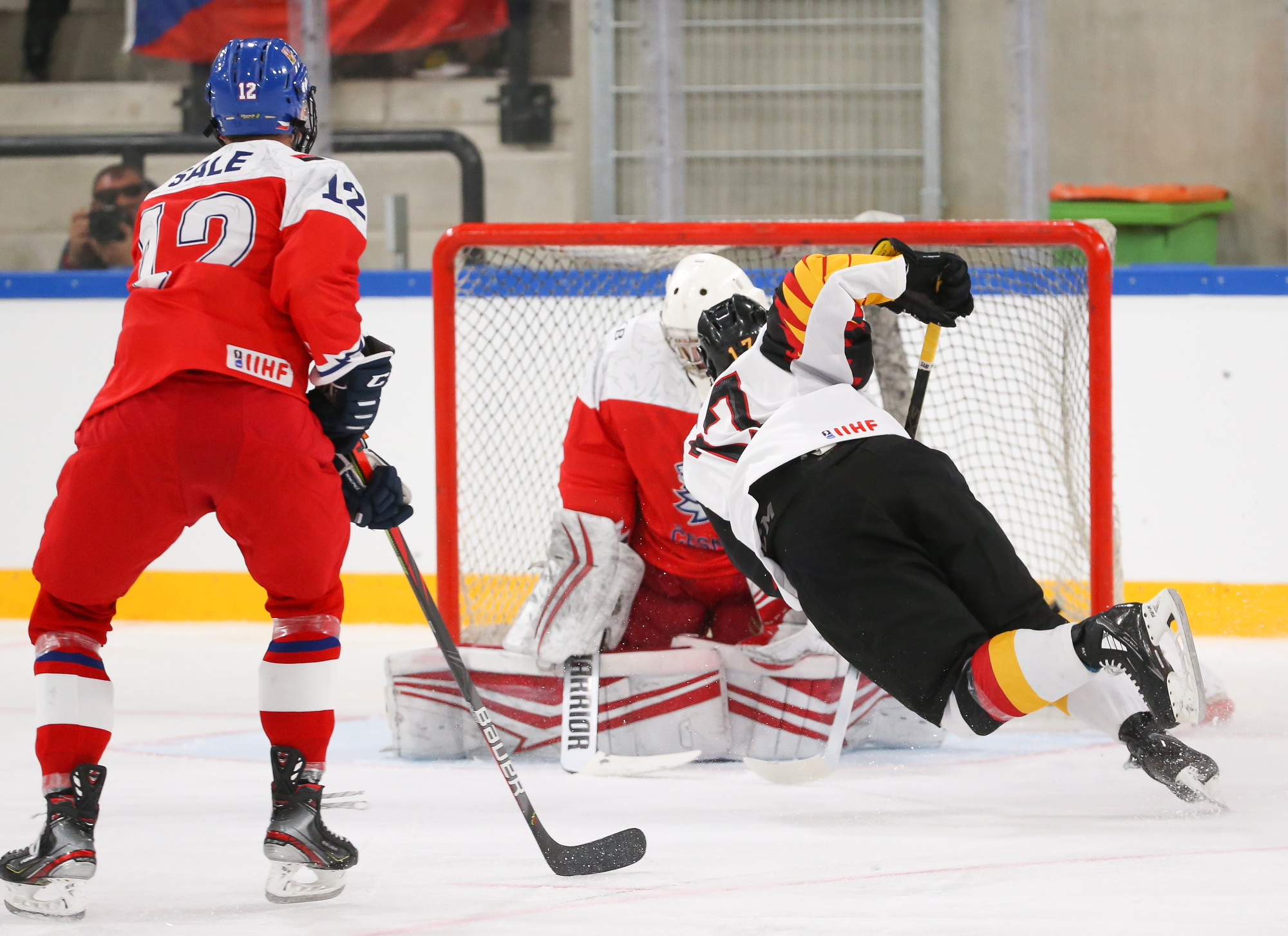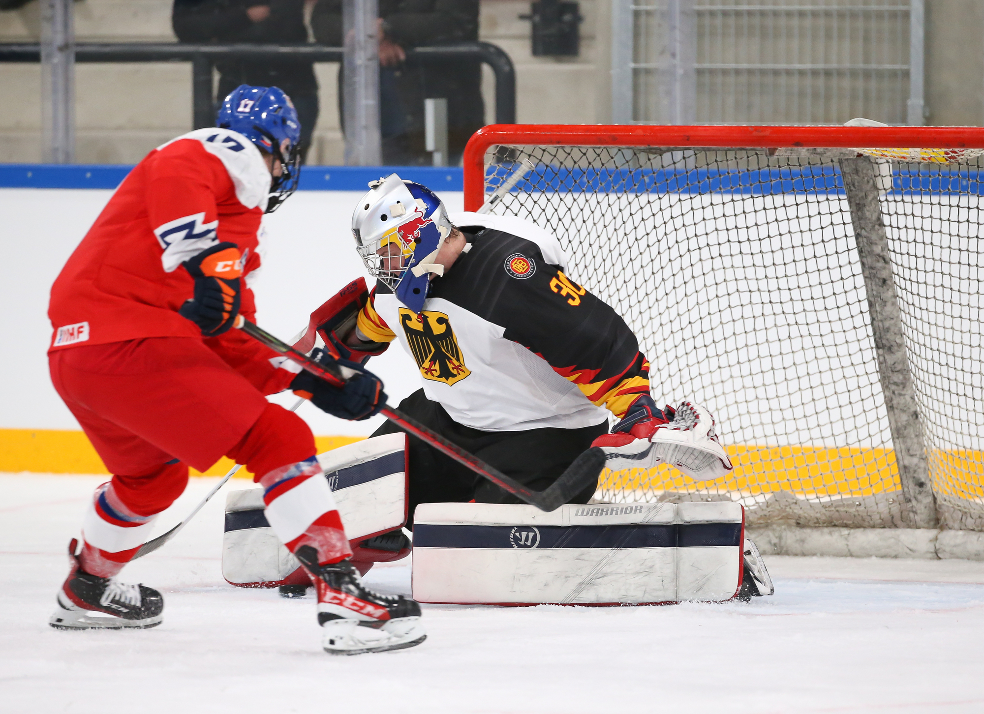 The Czechs turned the pressure back on in the last five minutes of the period when Matej Prcik got a couple of great chances but couldn’t beat Wolf. The Czechs finally put the puck past the German goalie with 1:53 to play in the period but not legally. Wolf stopped Frantisek Nemec’s initial shot but the rebound popped up into the air where Nemec, driving to the net, punched the puck in the net with a closed fist. After a brief video review, it was indeed confirmed to be no goal.