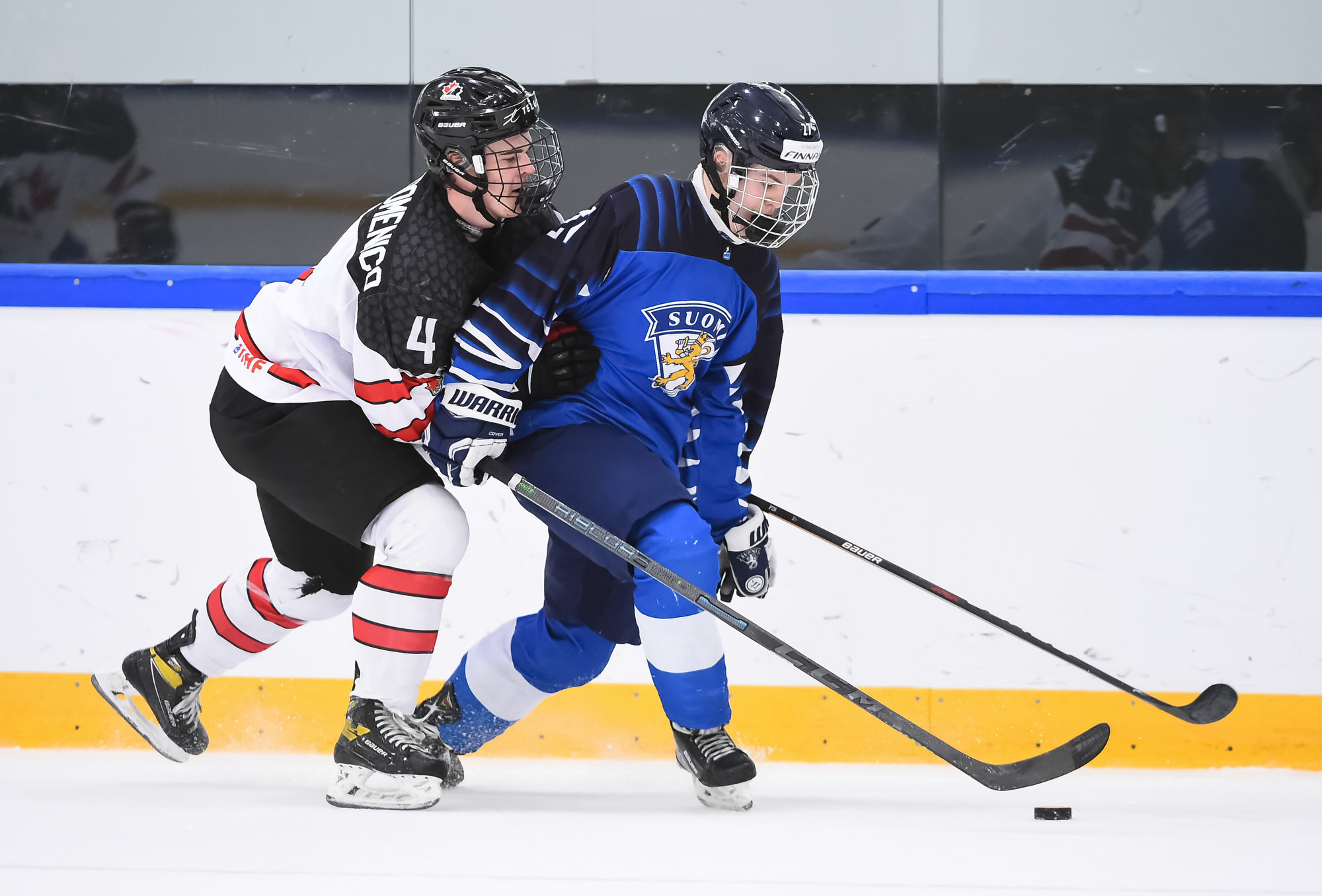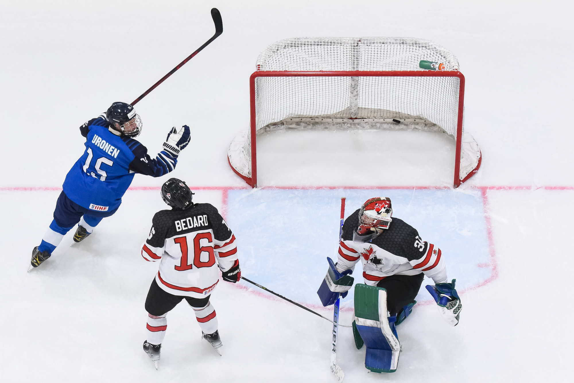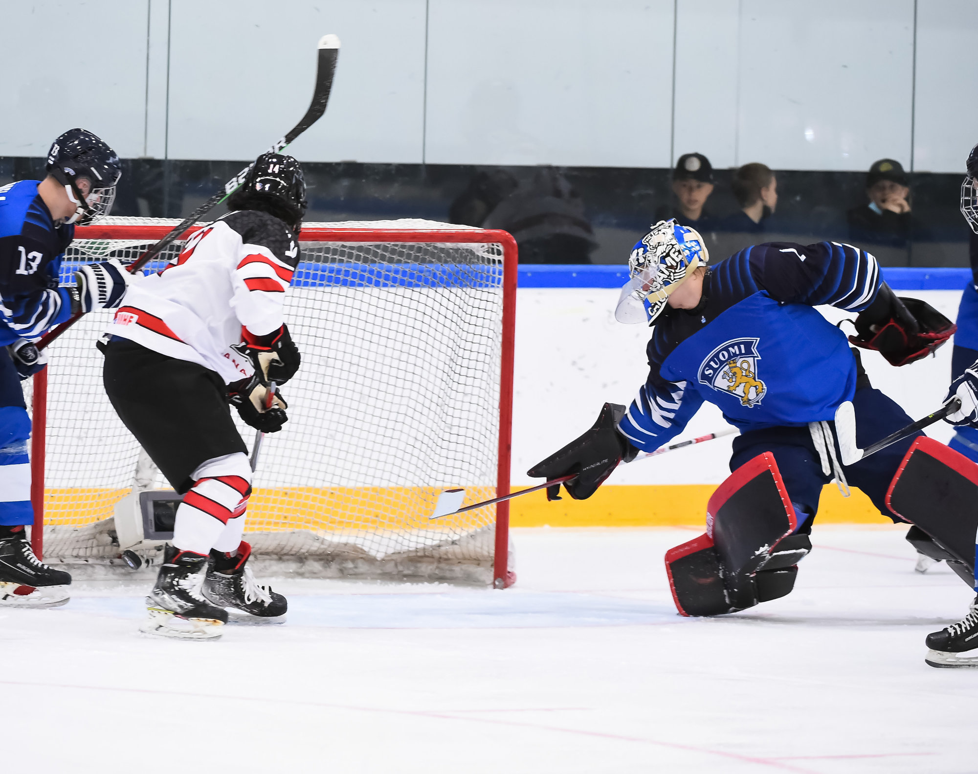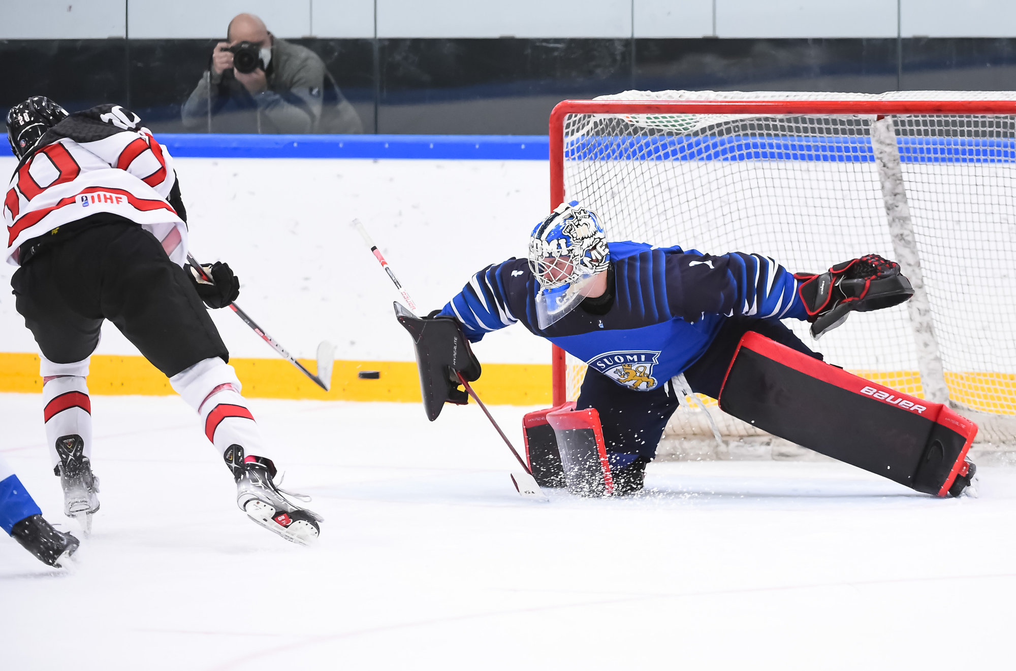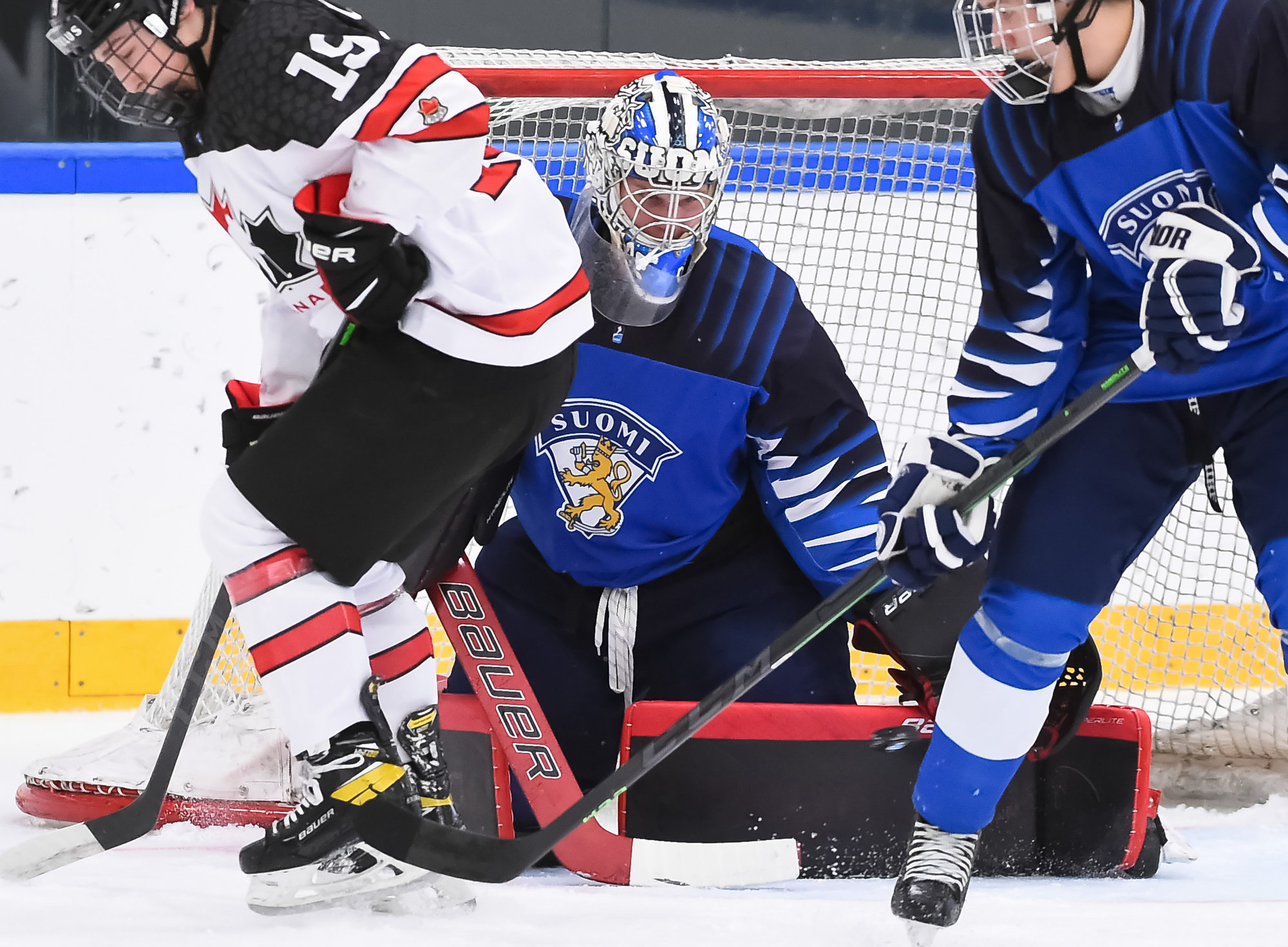 Canada jumped into a two-goal lead early in the second, again thanks to good fortune and quick hands in front of the Finnish goal. Nicholas Moldenhauer made a pass from behind the goal that bounced off the skate of Kasper Kulonummi, right onto the stick of Brayden Schuurman, and he swatted the puck in from close range at 5:25.