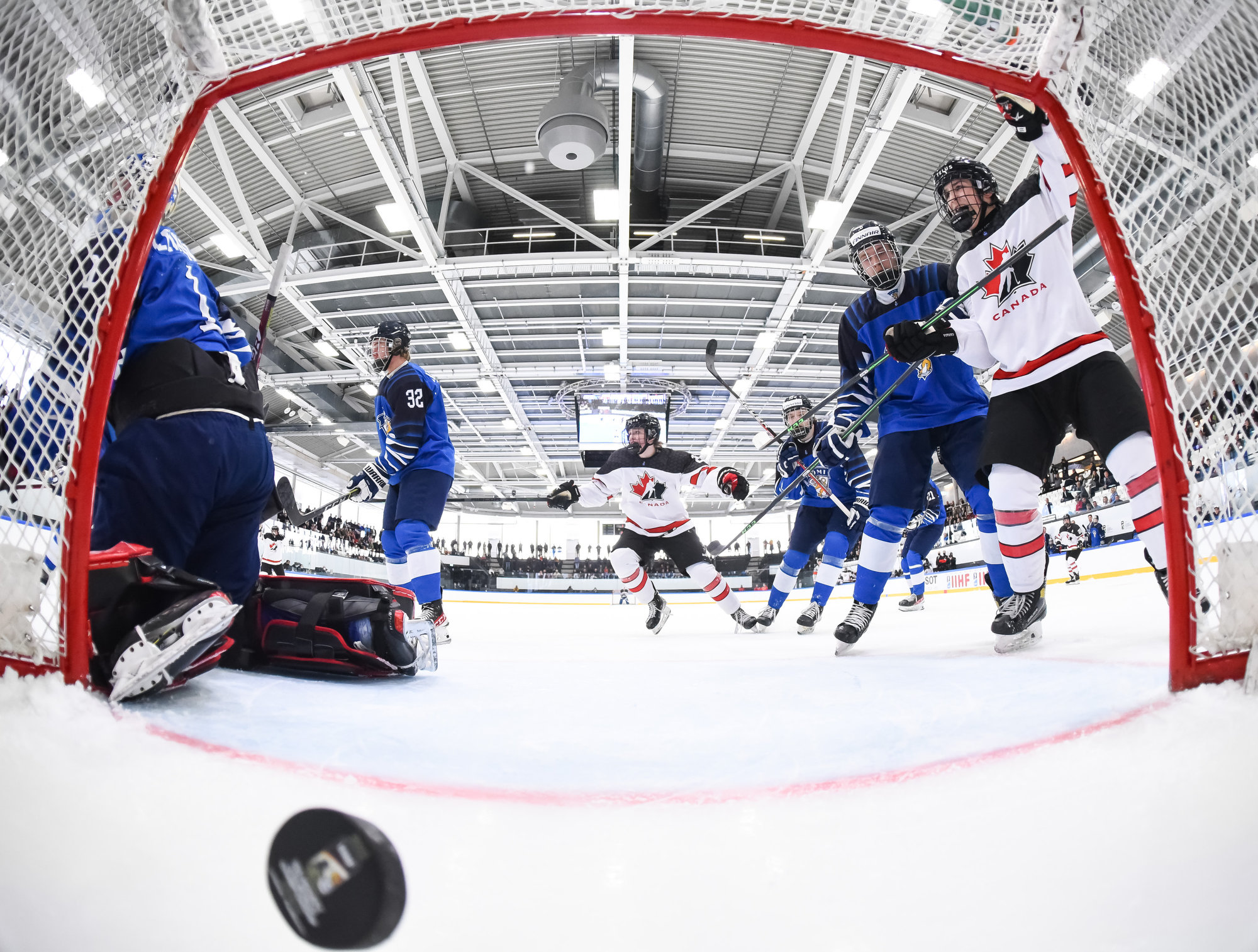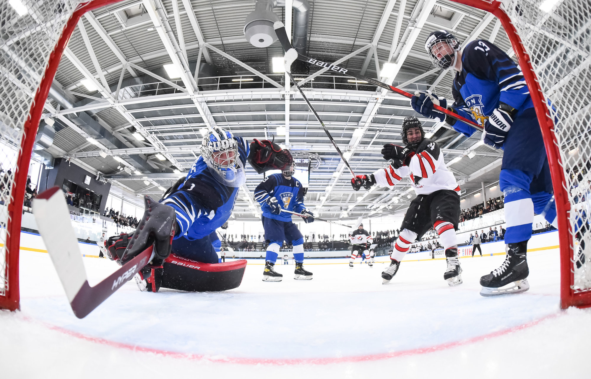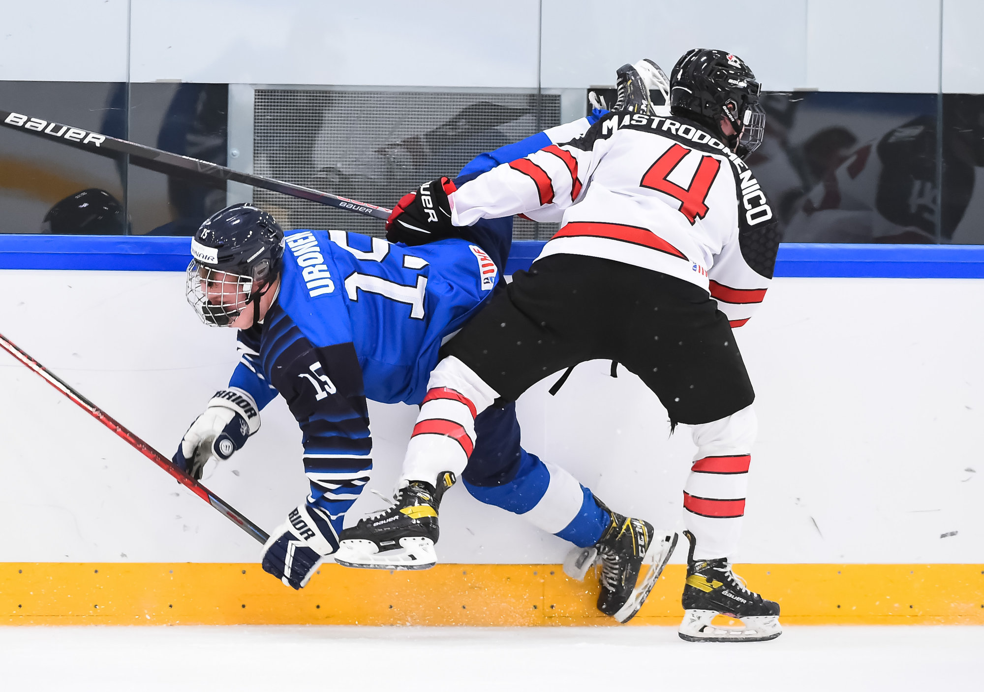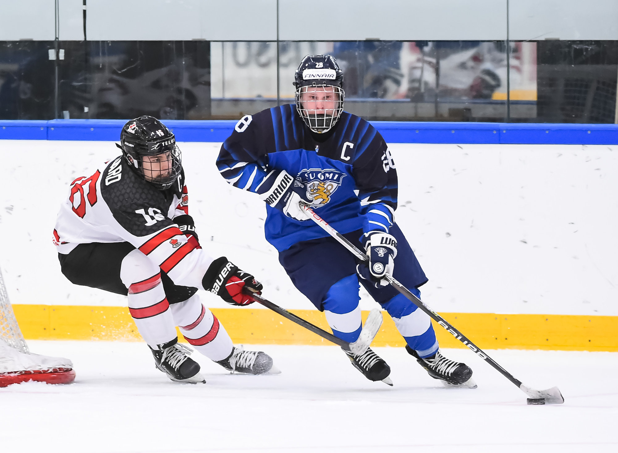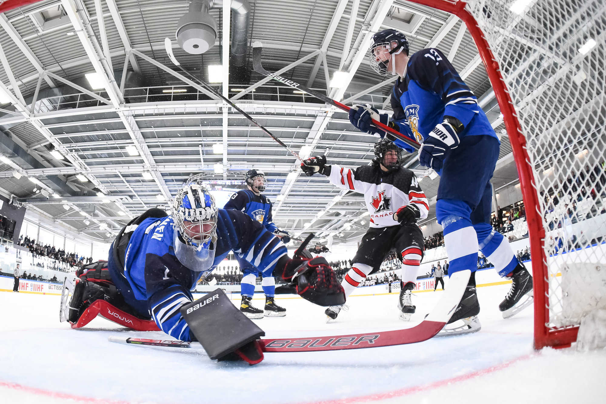 Canada jumped into a two-goal lead early in the second, again thanks to good fortune and quick hands in front of the Finnish goal. Nicholas Moldenhauer made a pass from behind the goal that bounced off the skate of Kasper Kulonummi, right onto the stick of Brayden Schuurman, and he swatted the puck in from close range at 5:25.