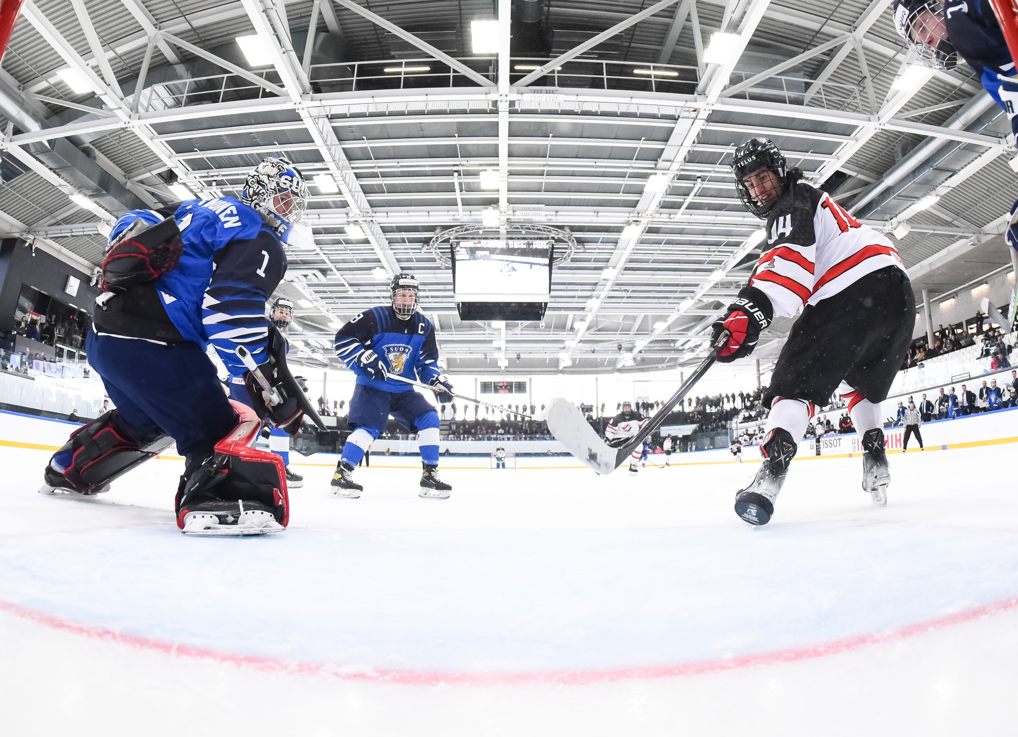 Canada continued to press and was rewarded again with good net presence. This time Spencer Sova’s shot was blocked in front, but it landed on the stick of Connor Hvidson who roofed a nice backhand over Leinonen for his first goal of the tournament, giving Canada a 2-1 lead.