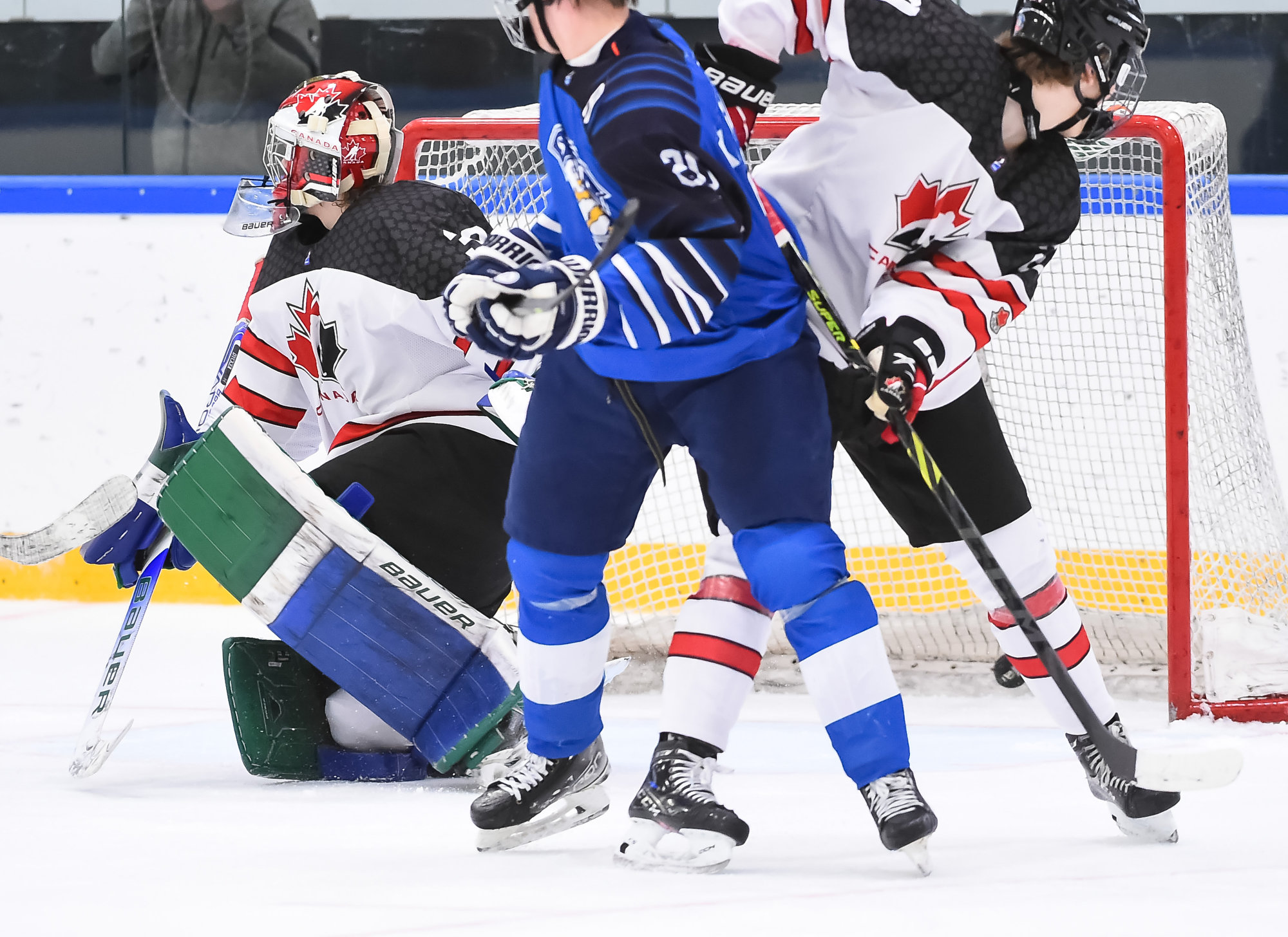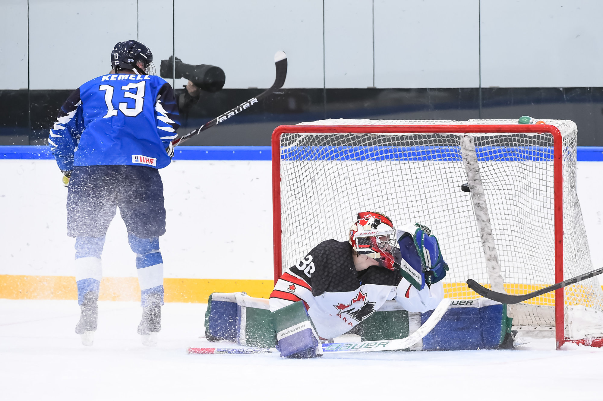 Just four minutes later, though, Michael Mastrodomenico took a holding penalty, and 24 seconds later it was a 2-2 game. Predictably, Kemell was the sniper, from the other side of the ice, beating Dyck over the shoulder to the far side. It was a psychological goal as much as anything for Canada, a team clearly lacking all confidence killing penalties.