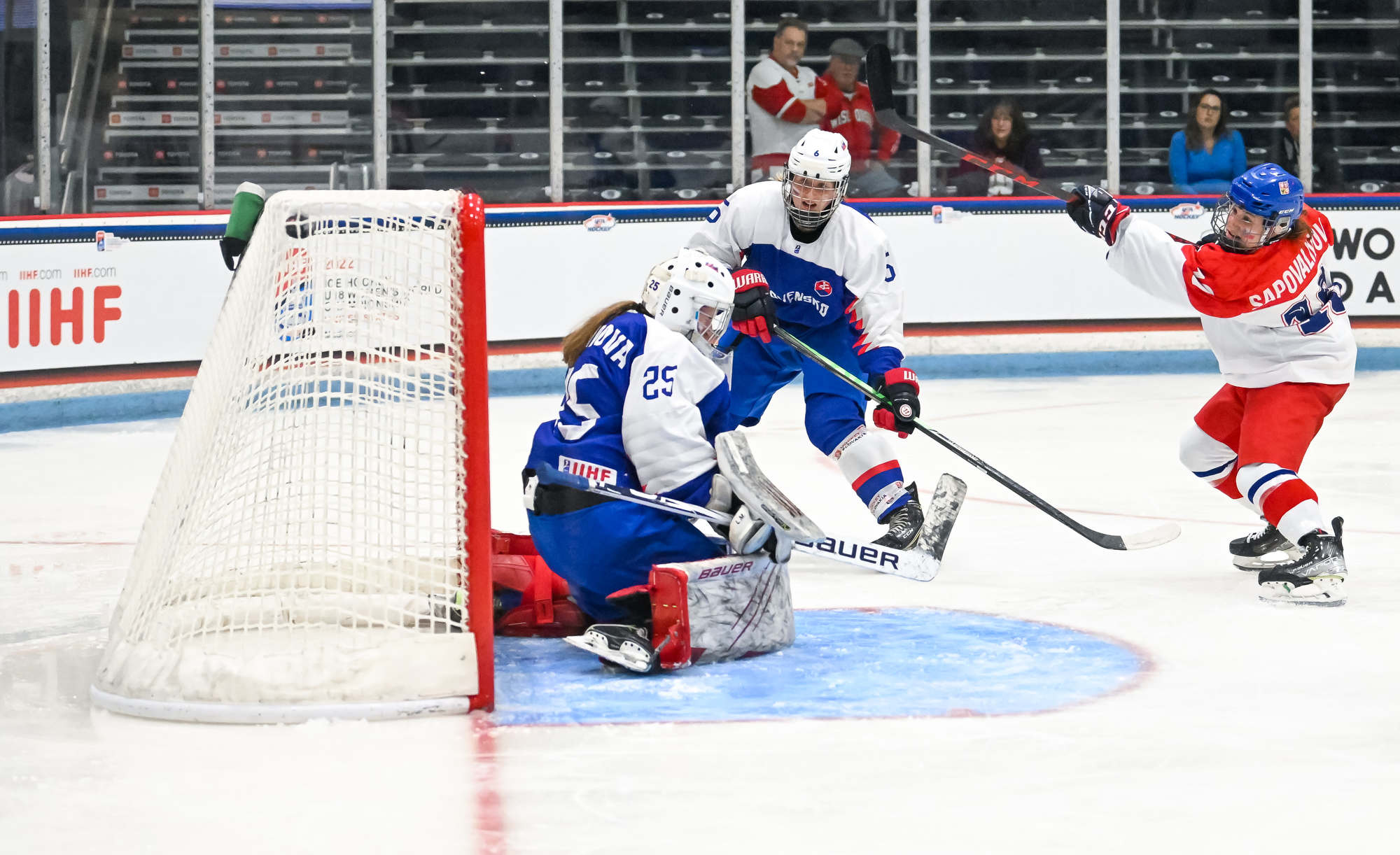 After a scoreless first period in which Czechia survived three penalties including a 5-on-3, Sapovalivova broke the deadlock 5:31 into the second. The 16-year-old drove to the right side of the net and lifted a backhand over the shoulder of Slovakian netminder Laura Medvidova.