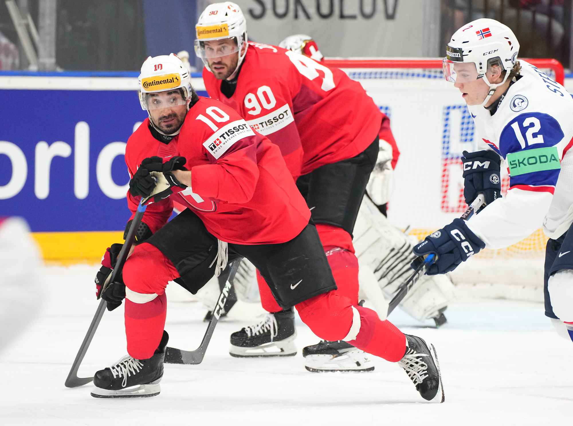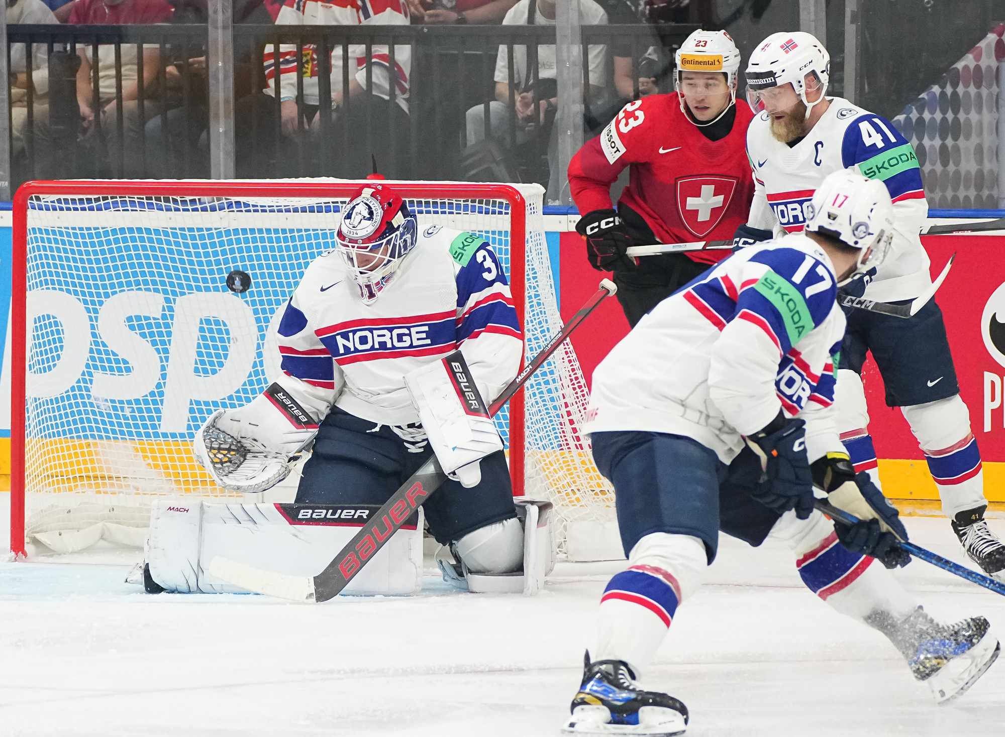 In the middle frame, Switzerland turned its puck possession into goals. Four minutes in, Romain Loeffel unleashed a shot from centre point. His effort evaded Thomas Berg-Paulson’s attempted block and dinged the post on its way into the top corner. The Swiss D-man then made a key intervention at the other end, getting in front of a shot from Stian Solberg as the young defender dithered when well placed.