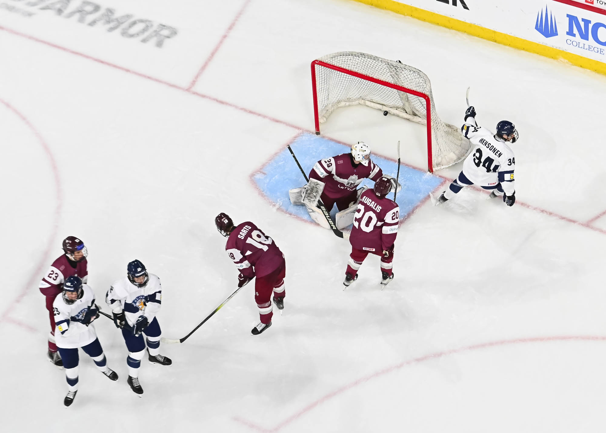 Finland burst out to a 6-2 lead after one period and coasted to a 10-2 win over Latvia this afternoon in Allen, Texas. The win shoots the Finns into first place over idle Canada with a 2-0-1-0 record for seven points. Latvia drops to 0-1-0-2 and remains in fourth spot.