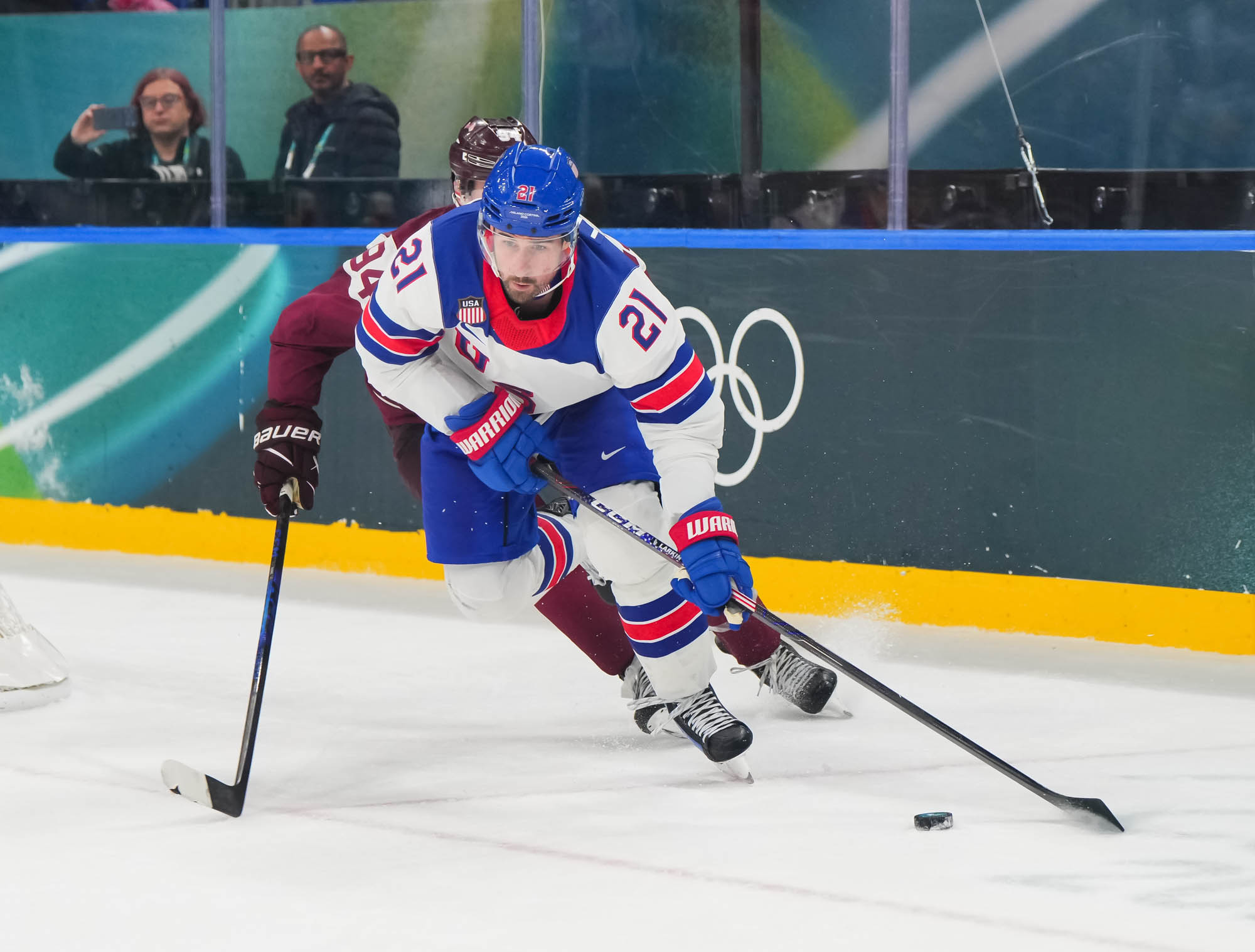 A two-goal night for forward Brock Nelson (#29) sparked the U.S. men to a 5-1 opening win over Latvia at the 2026 Olympics in Milan.