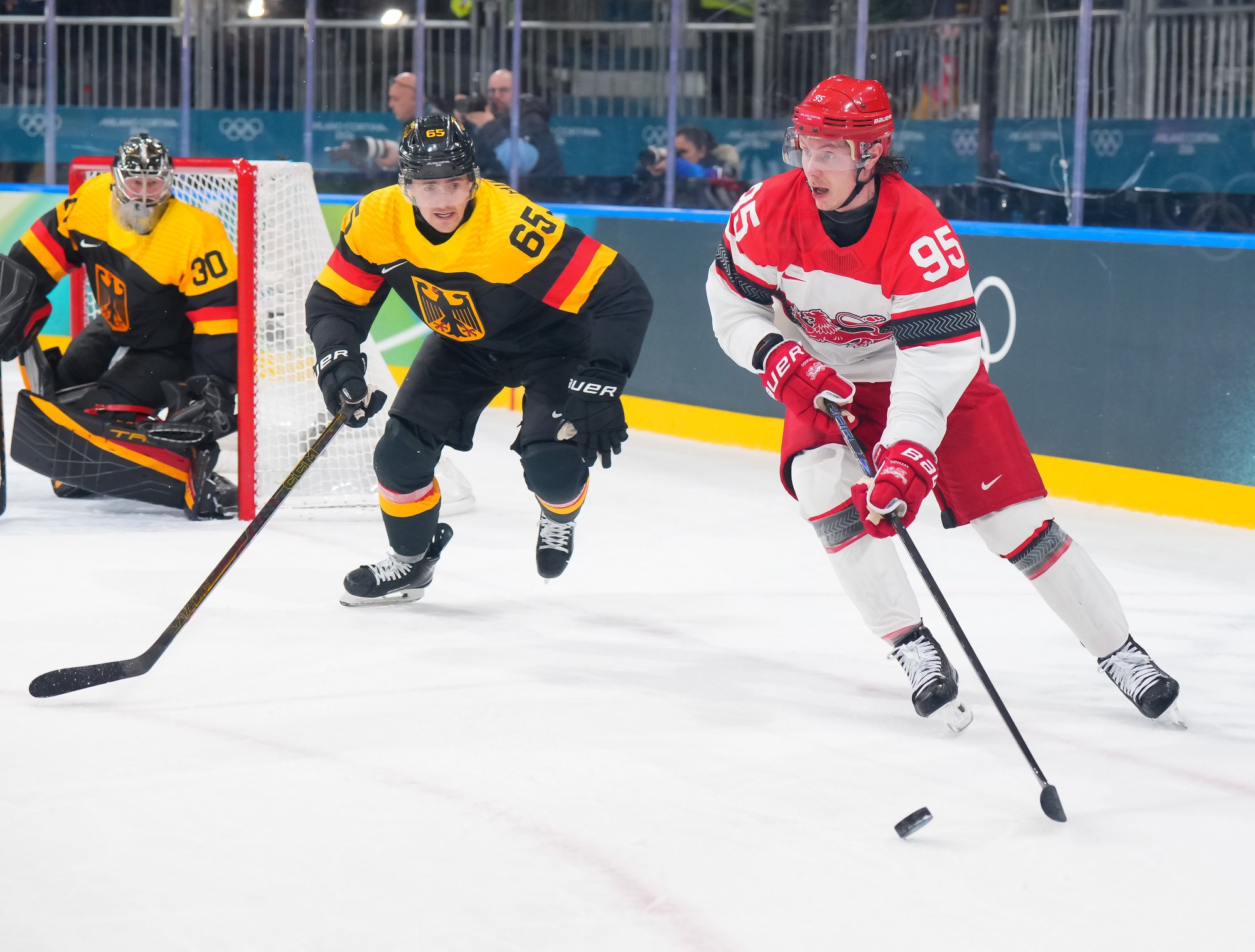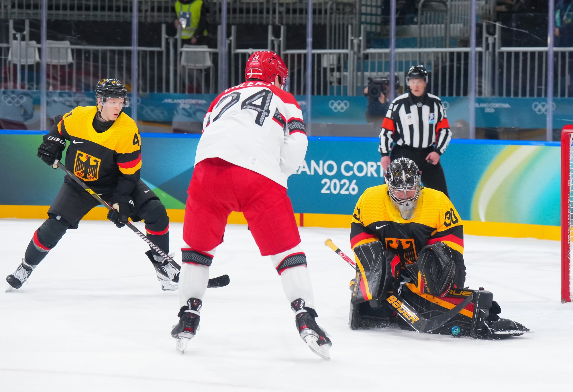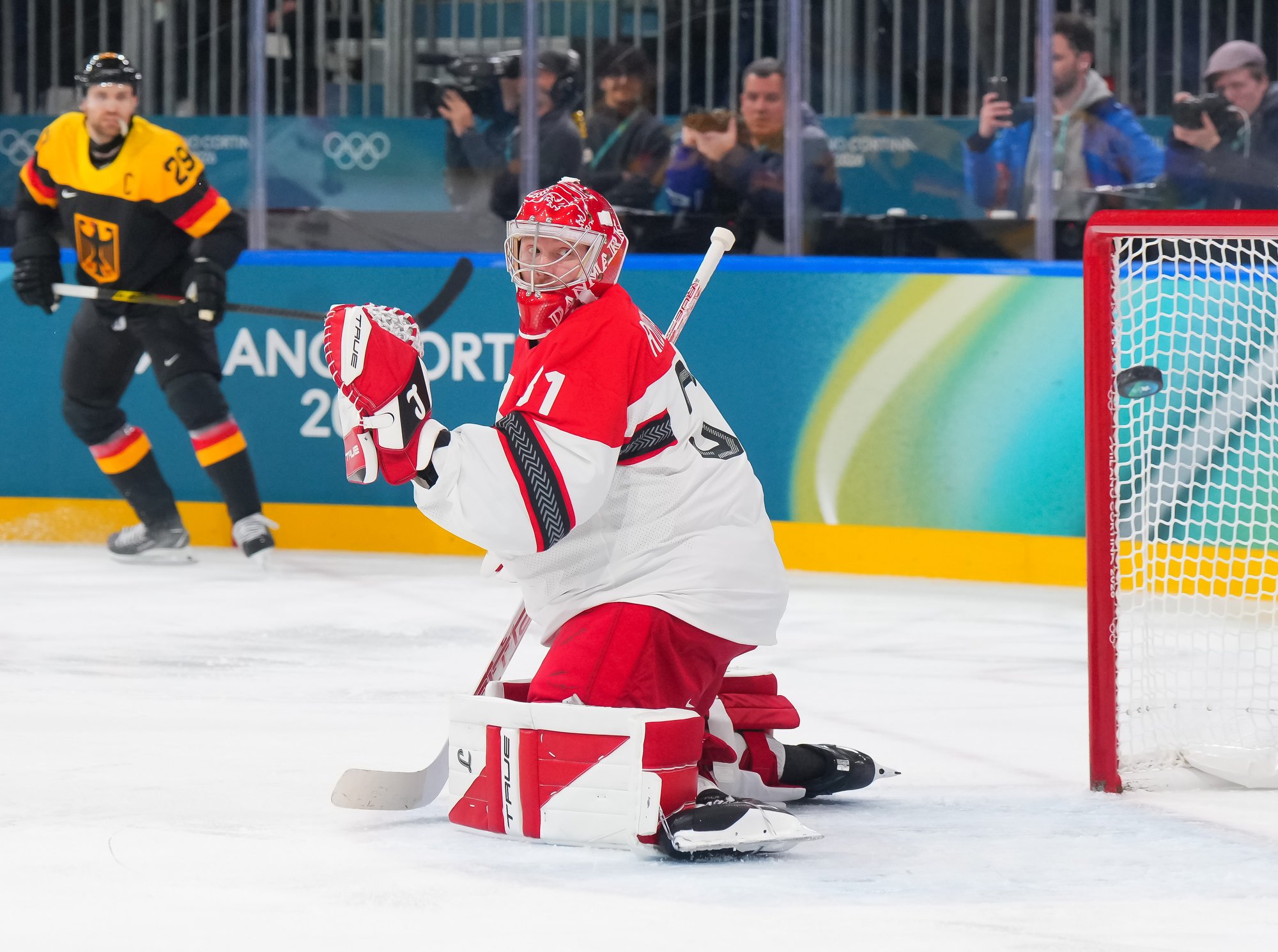 Denmark's best chance of the third came when Frederik Storm had a point-blank shot, but Grubauer kicked out the left pad to maintain the German lead. Later, Draisaitl had a clear break but was stopped by Andersen. Coach Mikael Gath pulled Andersen with nearly four minutes remaining, but despite good puck possession they managed few decent scoring chances to rally.
