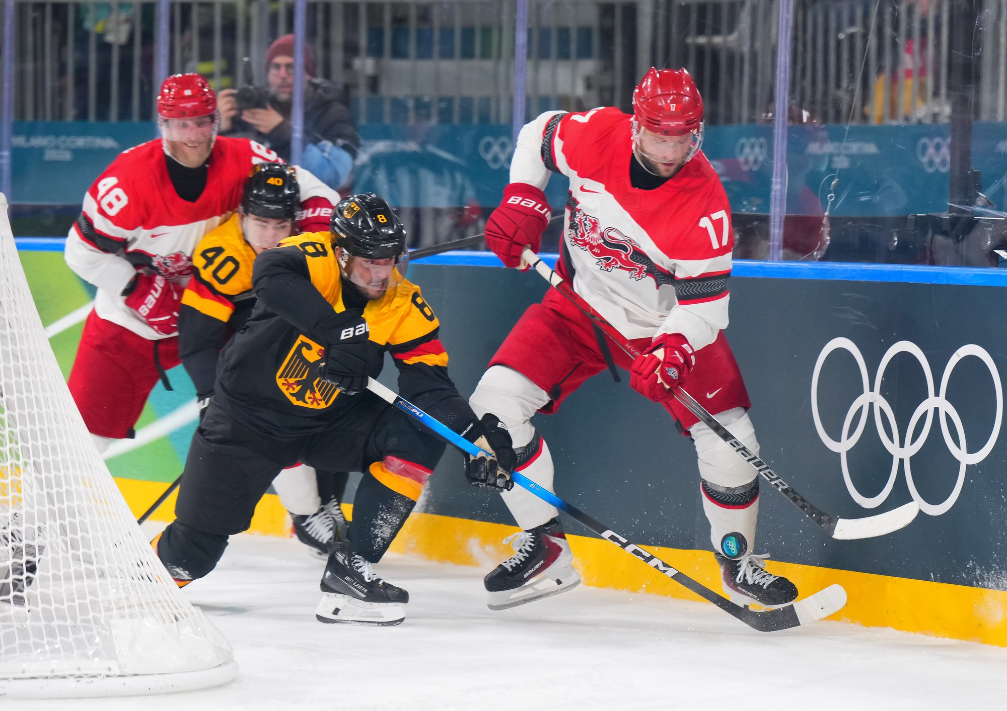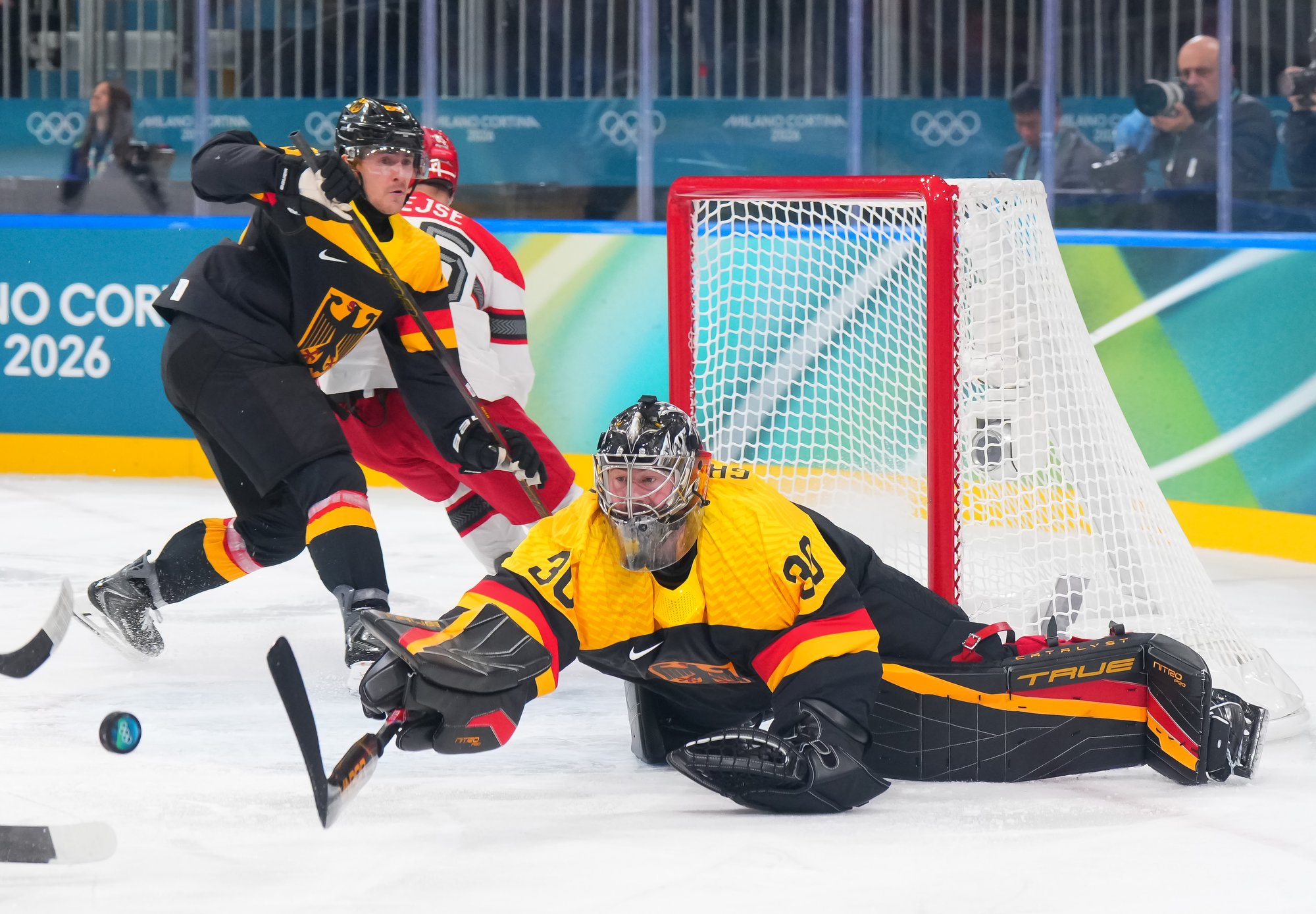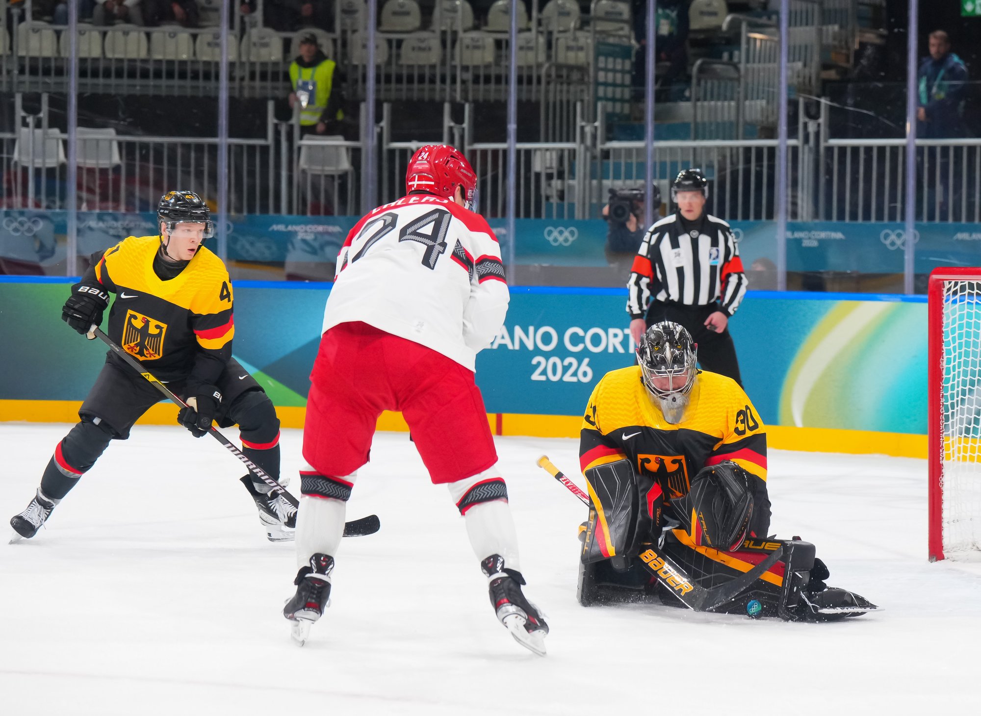 Denmark's best chance of the third came when Frederik Storm had a point-blank shot, but Grubauer kicked out the left pad to maintain the German lead. Later, Draisaitl had a clear break but was stopped by Andersen. Coach Mikael Gath pulled Andersen with nearly four minutes remaining, but despite good puck possession they managed few decent scoring chances to rally.