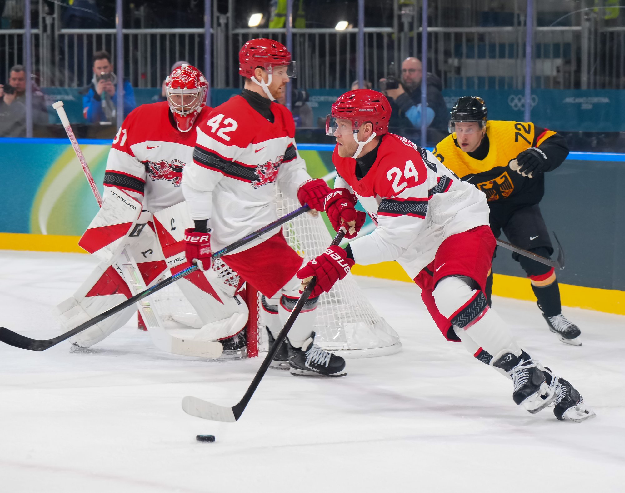 "I thought it was a pretty even game," offered Nicklas Jensen from Denmark. "I thought we maybe believed we could hold onto it a little longer. We're maybe playing sometimes too simple of a game, but any Germany-Denmark game can go 50-50. We had great star power, but they have a guy who's a difference maker every time he steps on the ice, best-on-best. He showed up pretty quickly today. There are a lot of positives we can take from this, but we also have to learn."