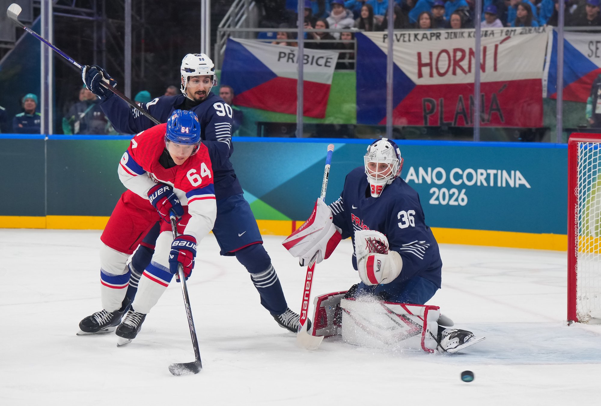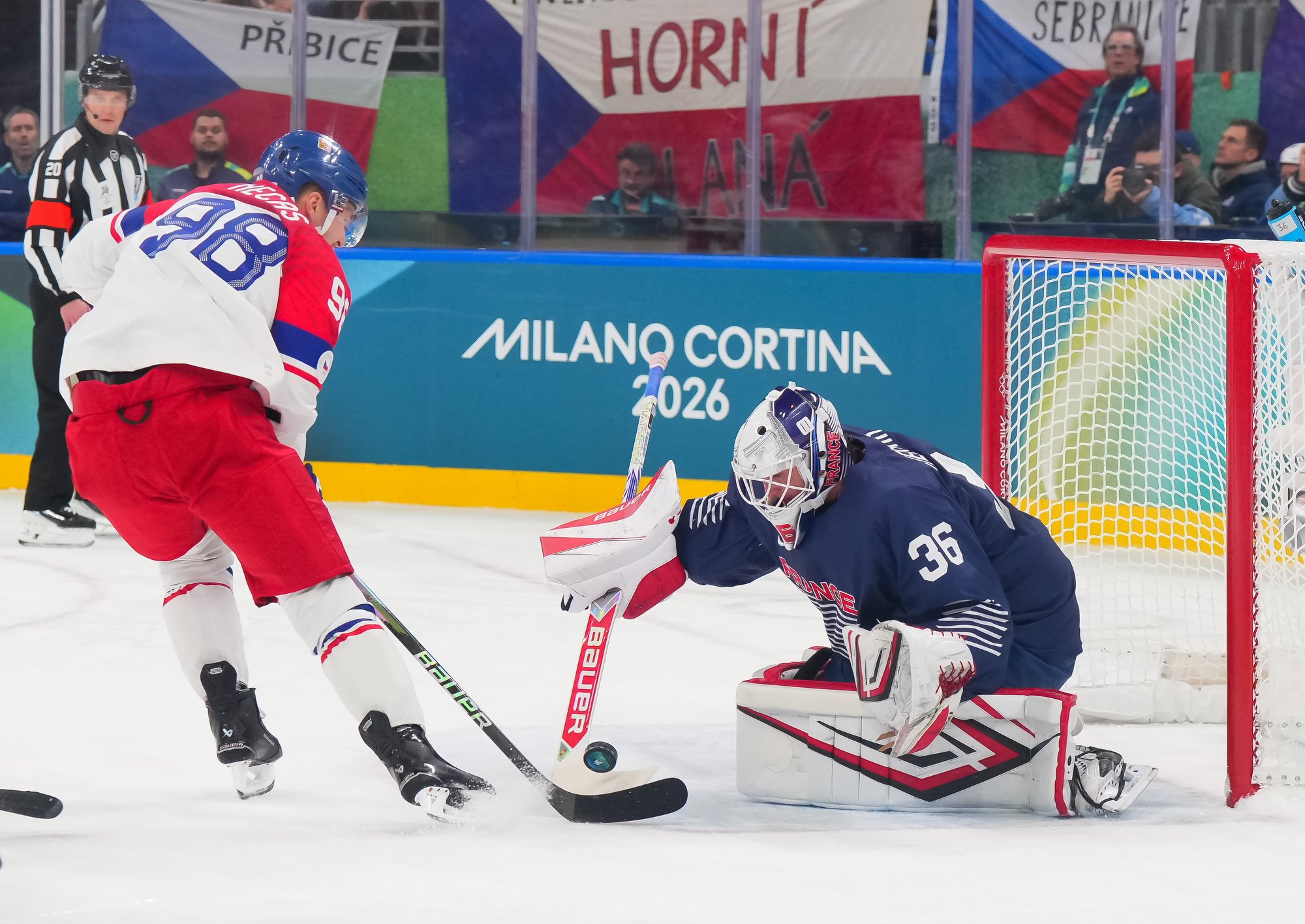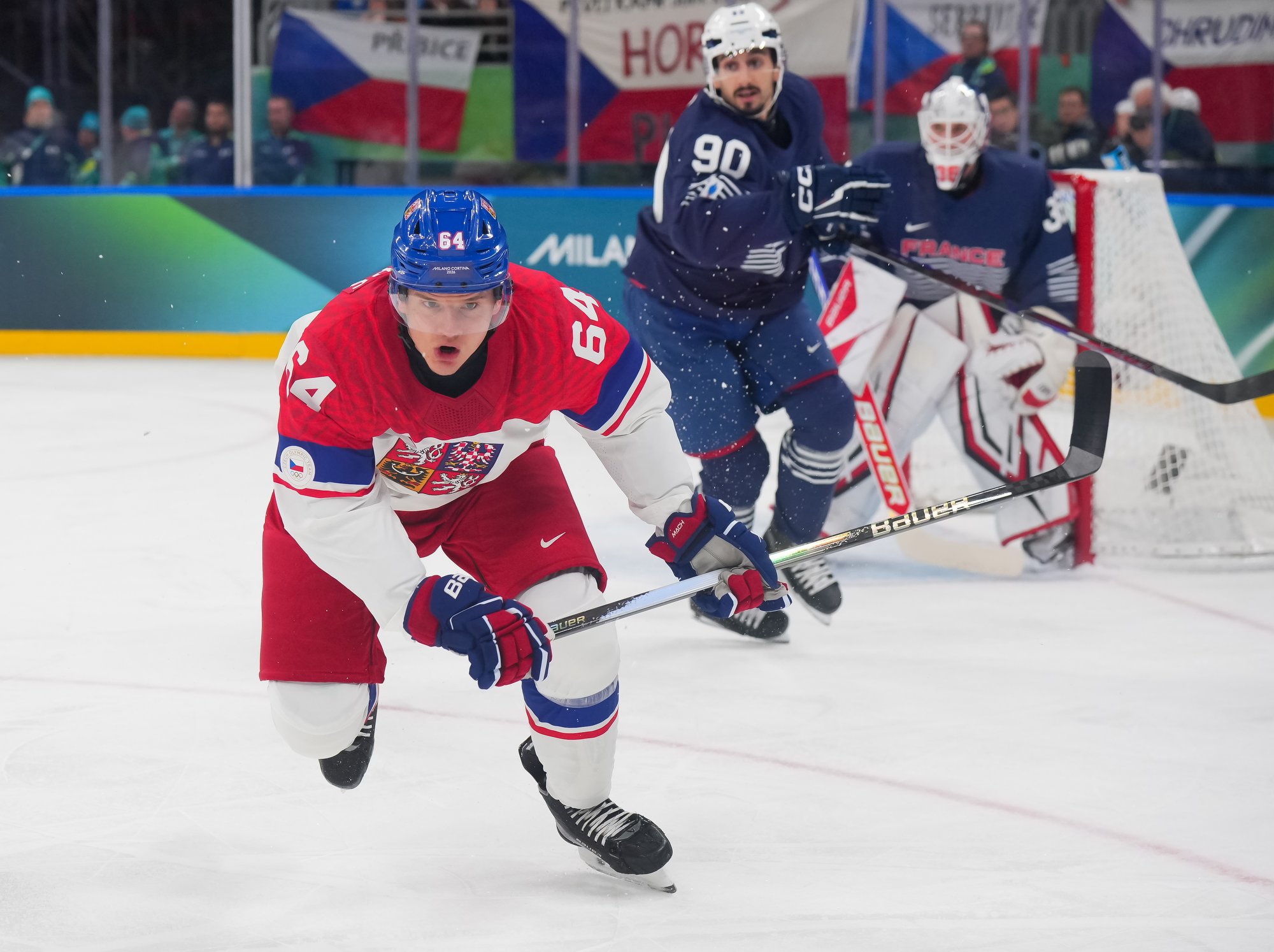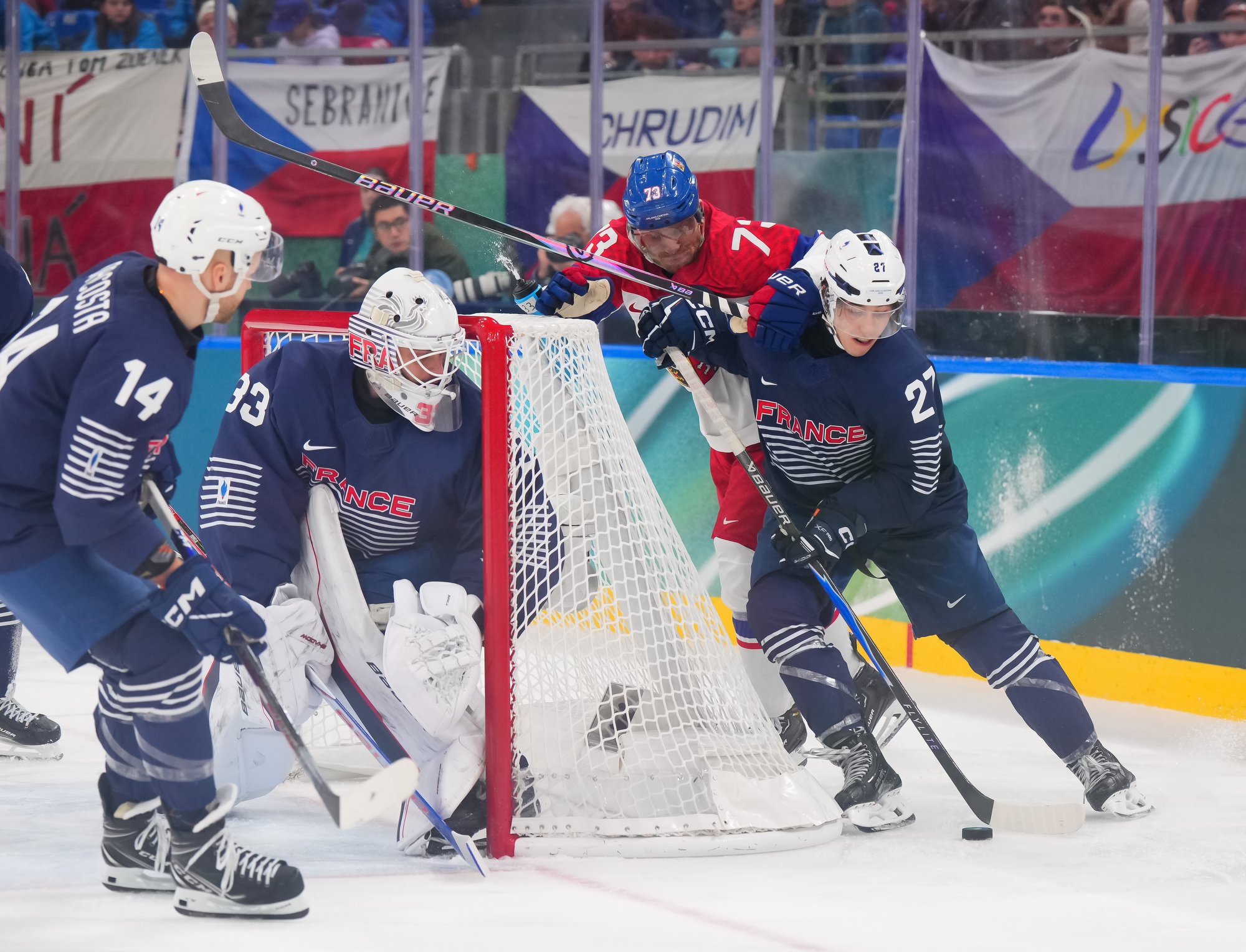 Despite the dominant opening period, the Czechs were ill-prepared for the start the French produced in the second. They scored their first goal of the tournament at 1:01 on a power play when Louis Bourdon converted a rebound from in close and goalie Daniel Vladar was without his stick.