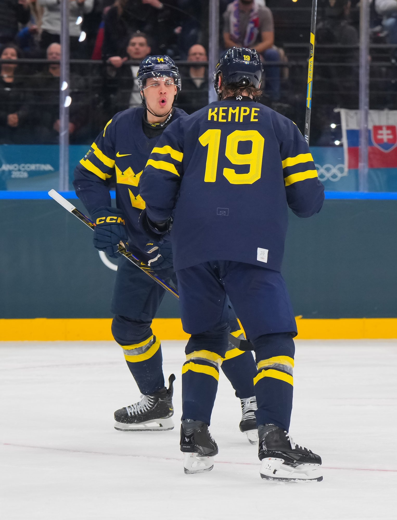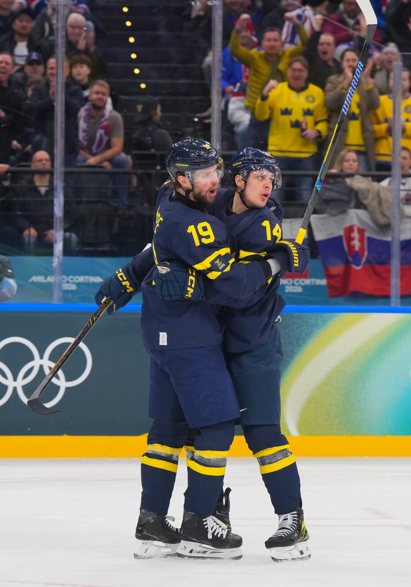 Sweden's Joel Eriksson Ek (#14) celebrates with Adrian Kempe (#19) after drawing first blood in a 5-3 preliminary-round win over Slovakia in Group B action at the 2026 Olympics.