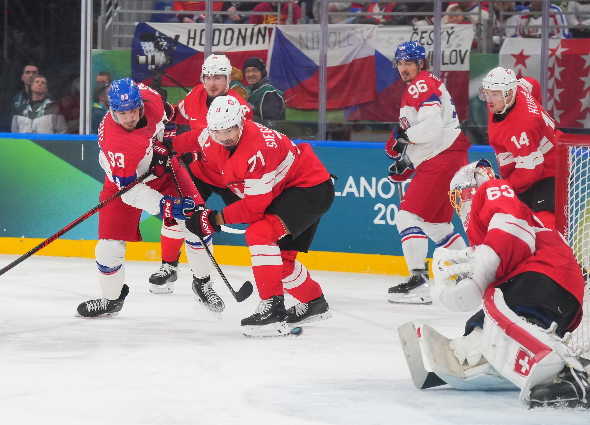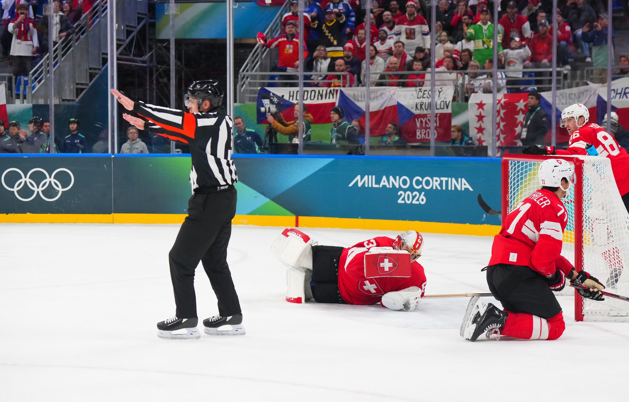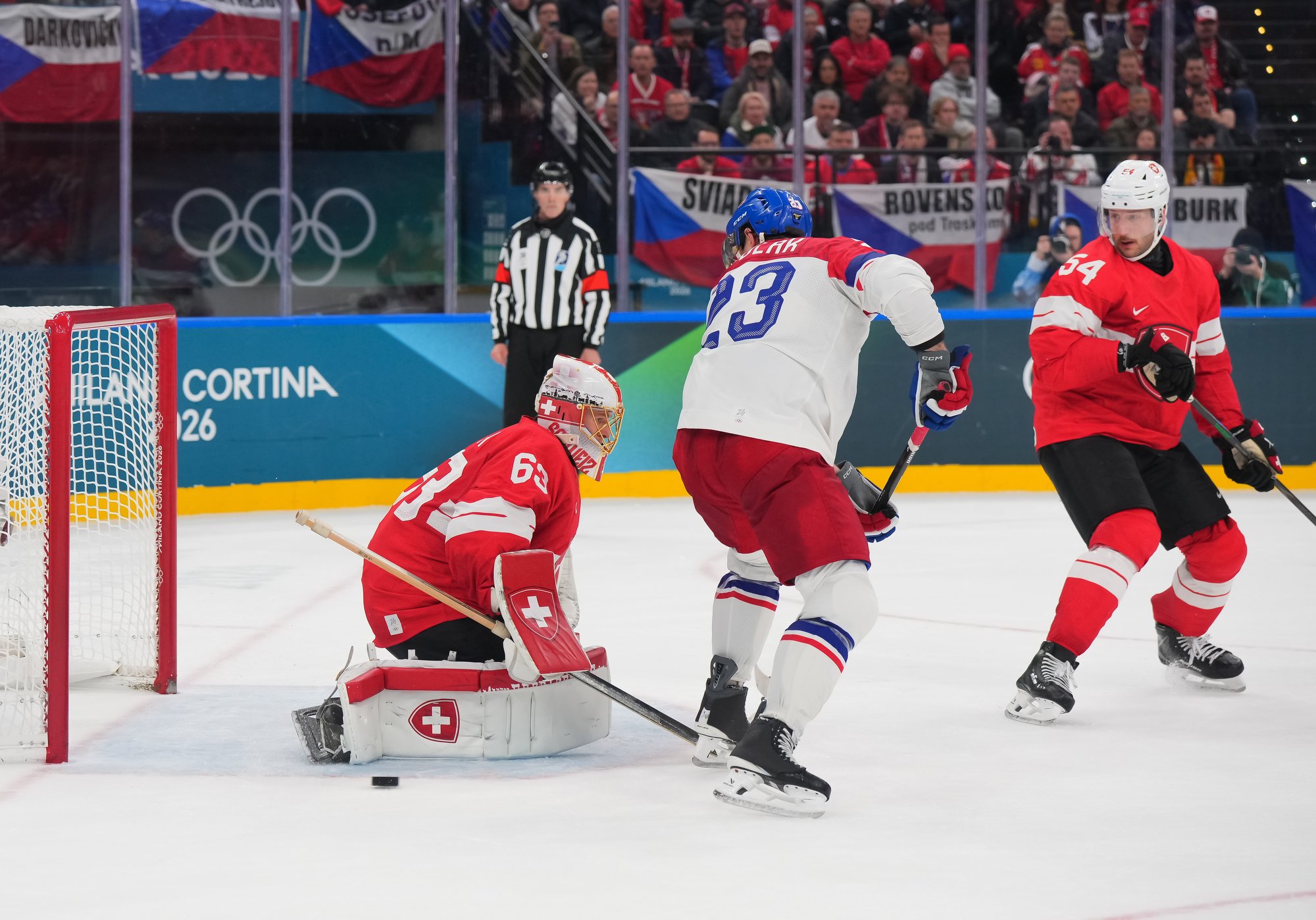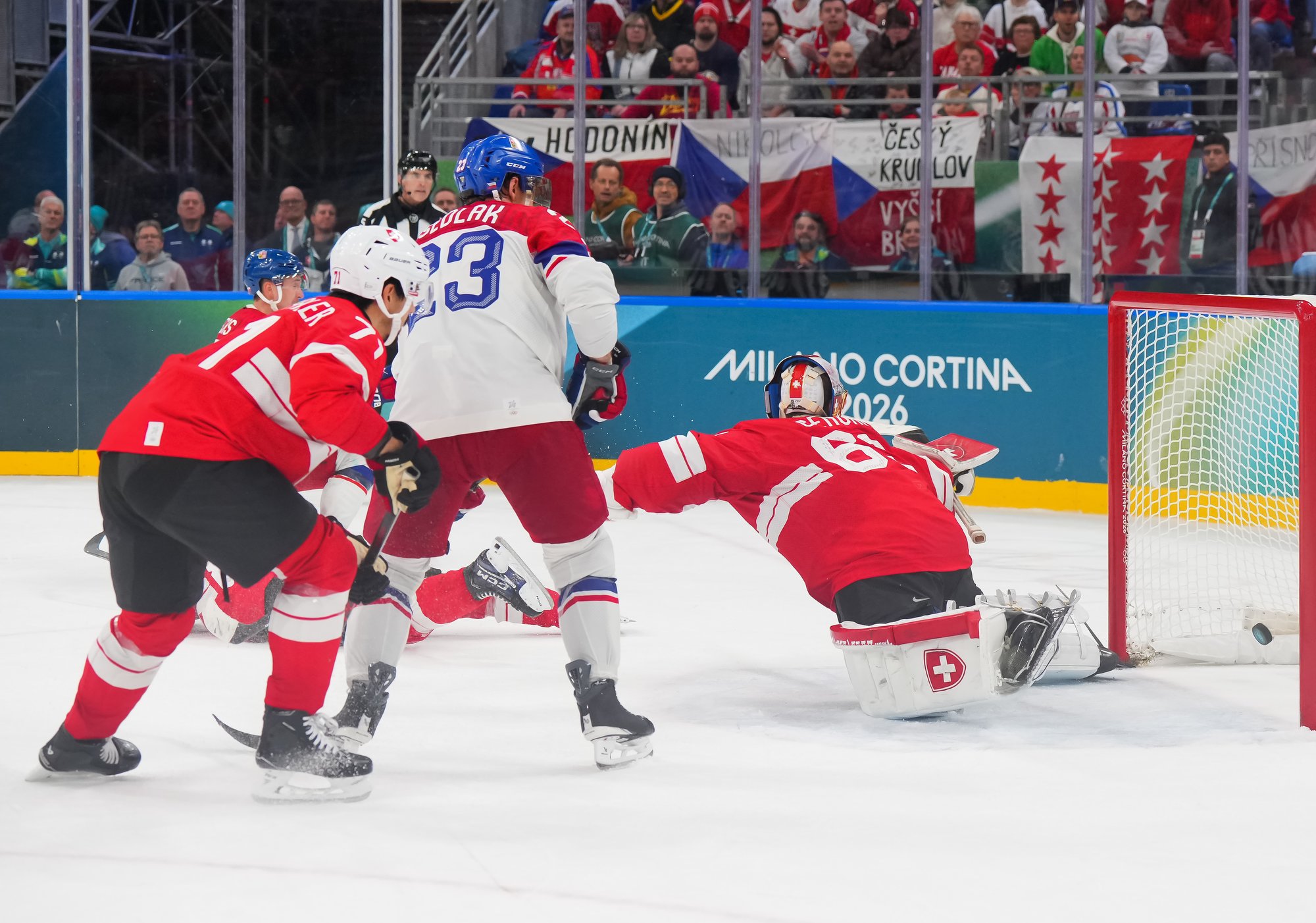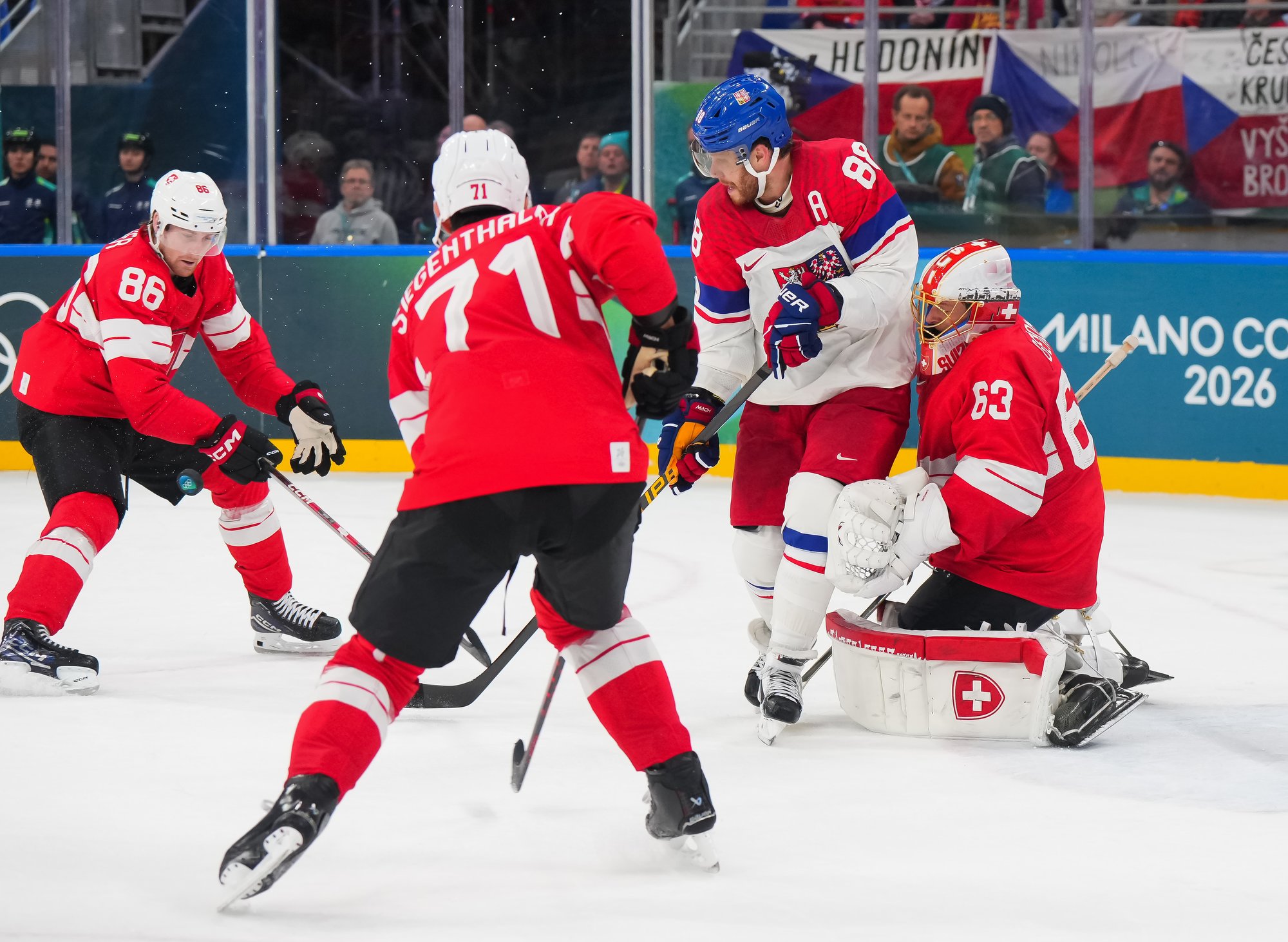Activating their defence, the Swiss finally got some puck luck with the equalizer at 16:53. Busting into the Czech zone, Josi tried to skim the puck left to Moser, but his pass deflected off the skate of Radko Gudas and past Dostal. The Swiss faithful at the Milano Santa Giulia Ice Hockey Arena burst into song.