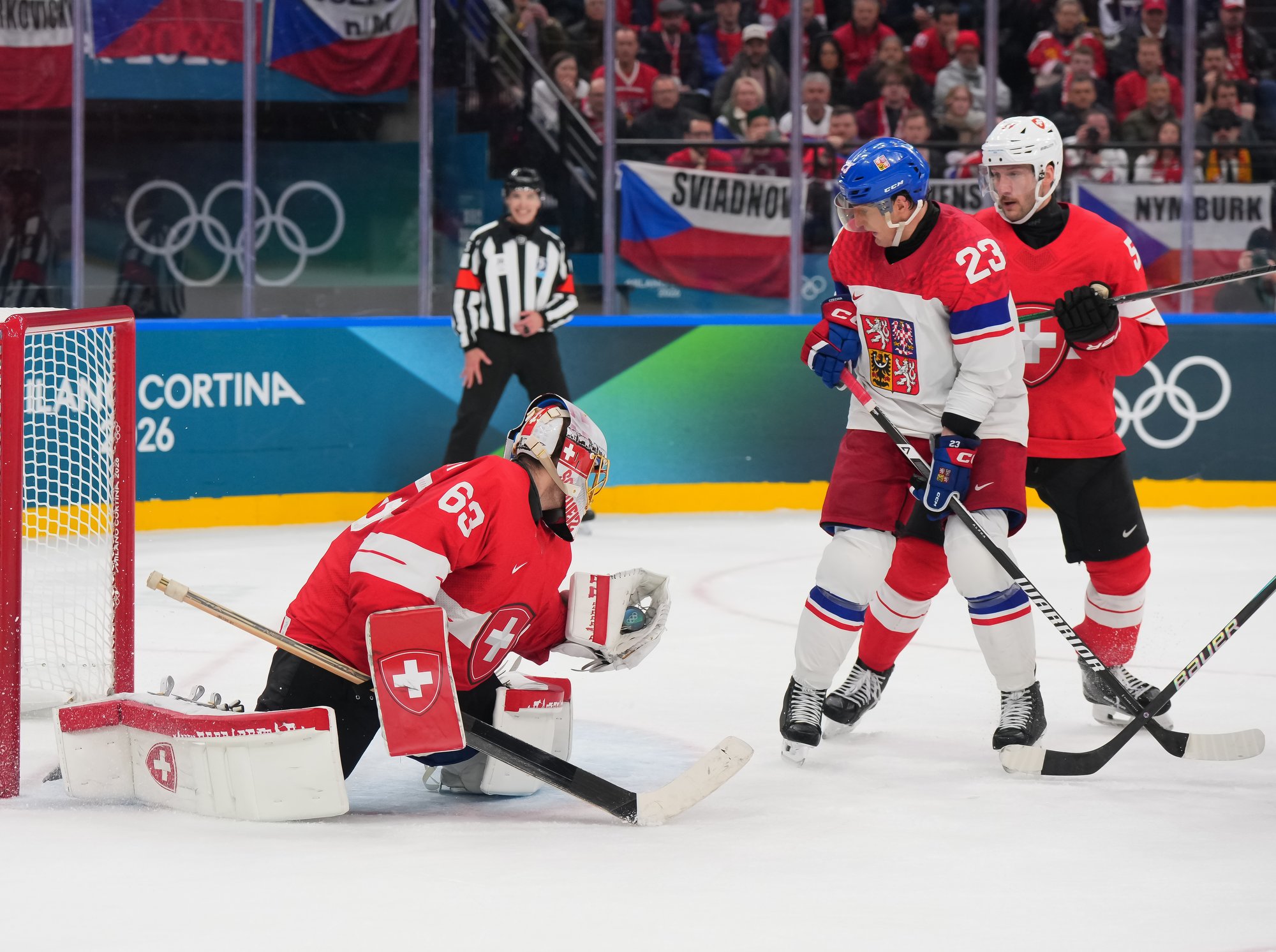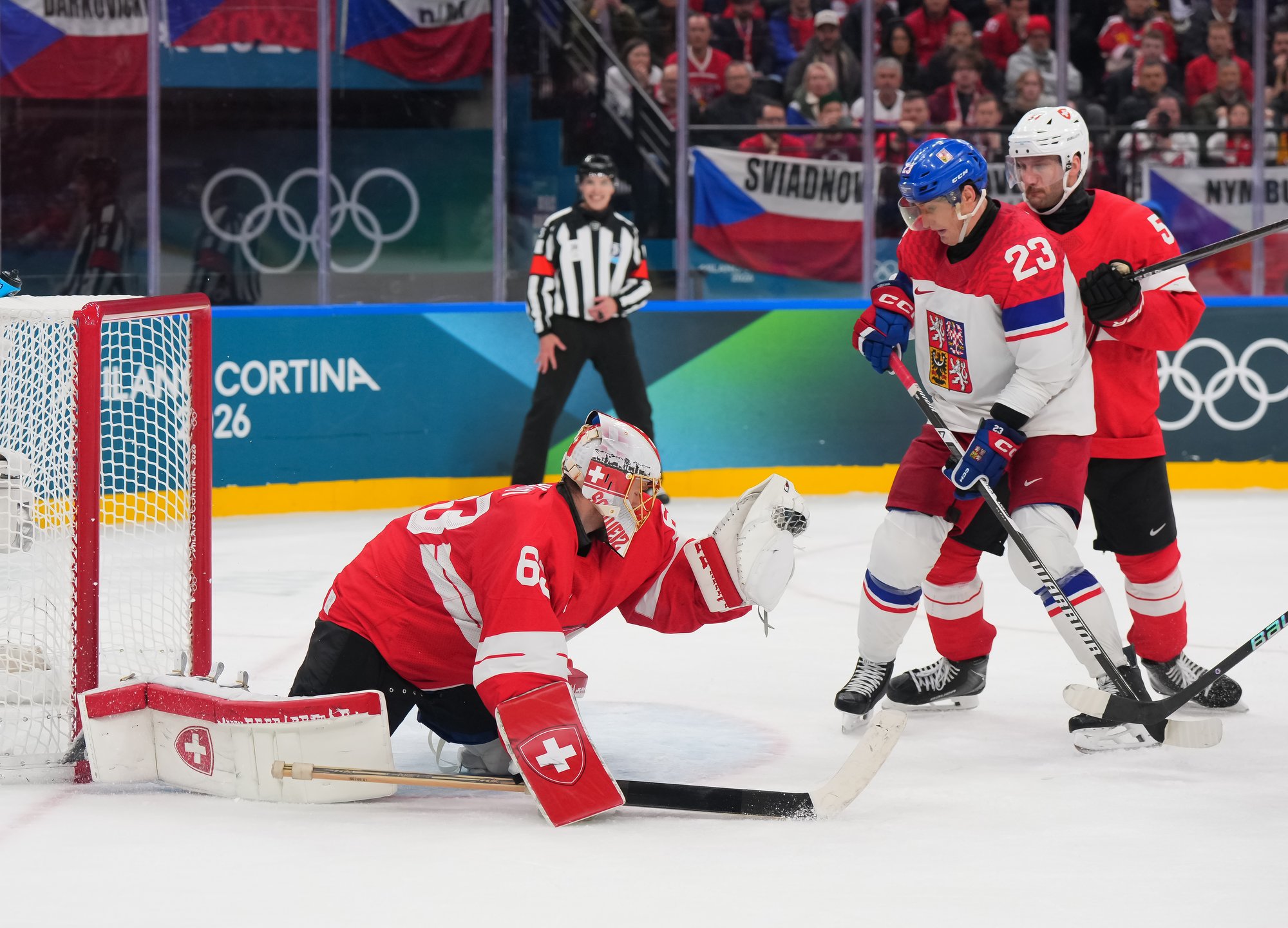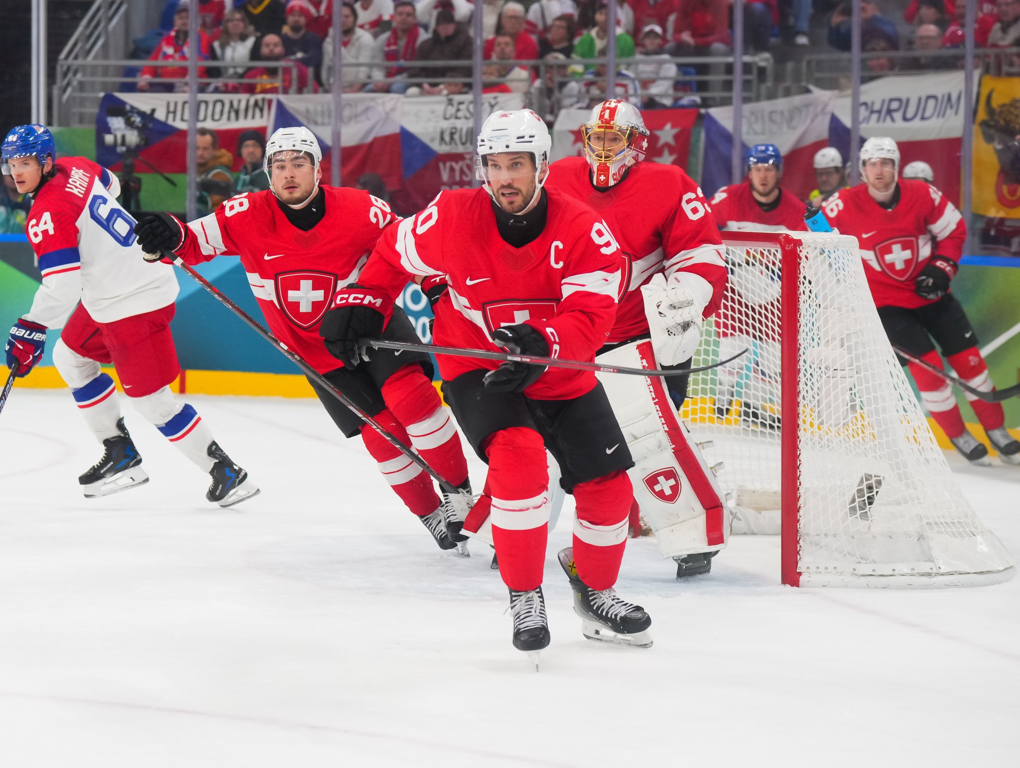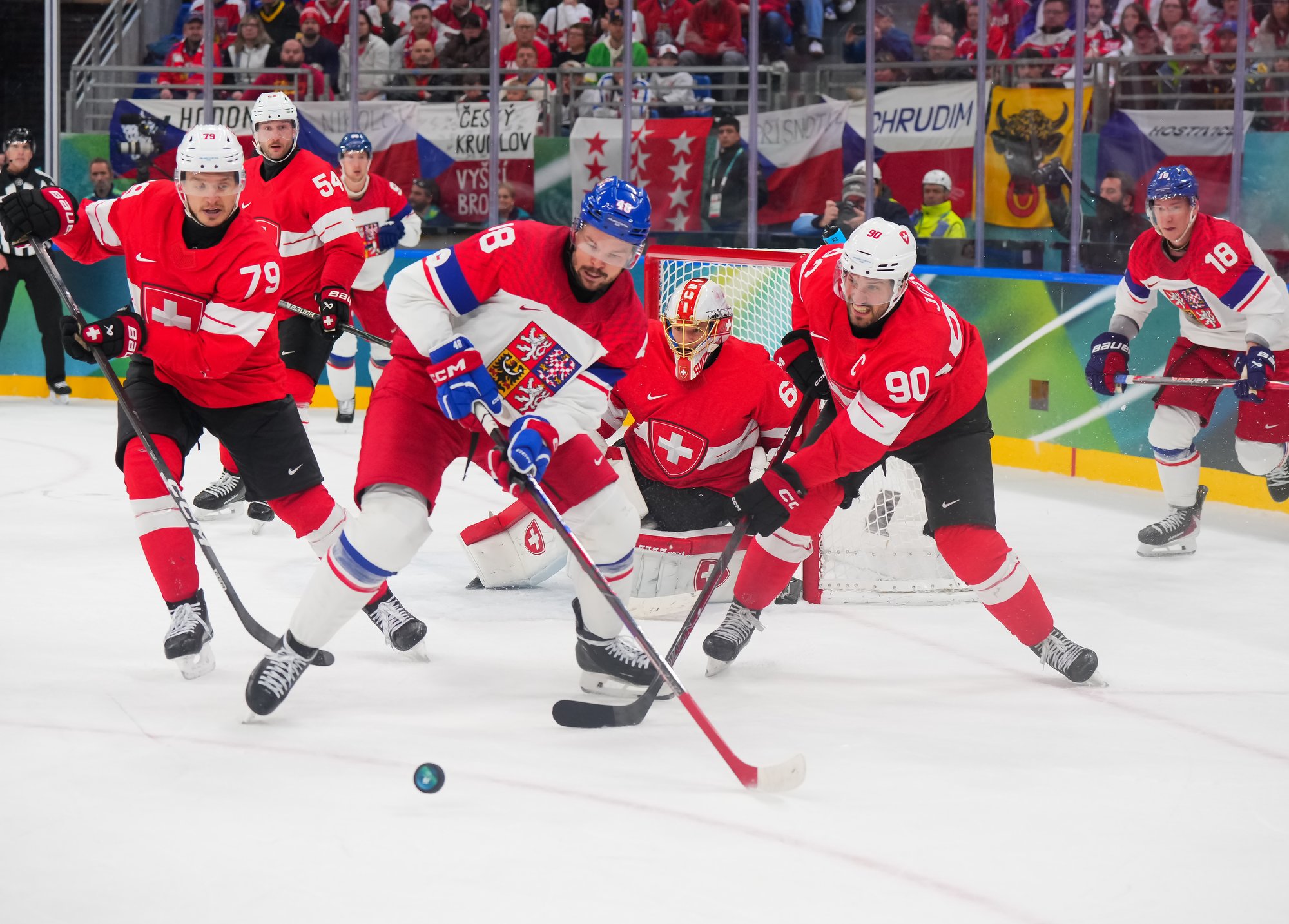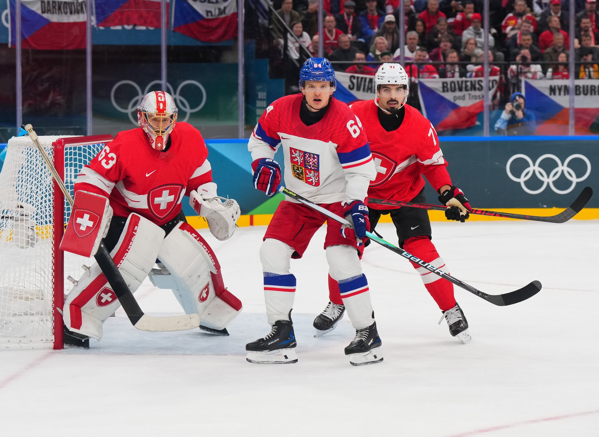 Activating their defence, the Swiss finally got some puck luck with the equalizer at 16:53. Busting into the Czech zone, Josi tried to skim the puck left to Moser, but his pass deflected off the skate of Radko Gudas and past Dostal. The Swiss faithful at the Milano Santa Giulia Ice Hockey Arena burst into song.
