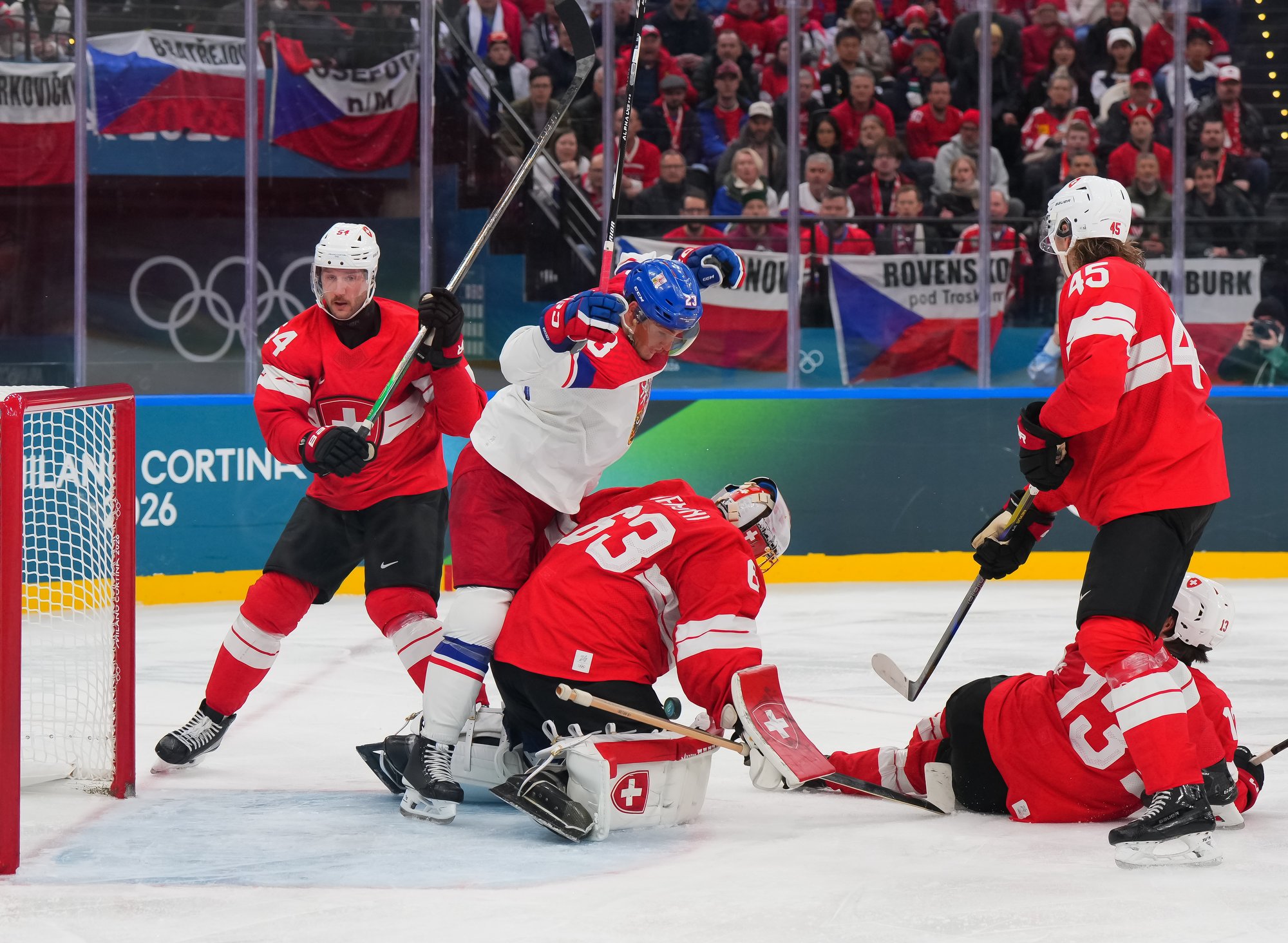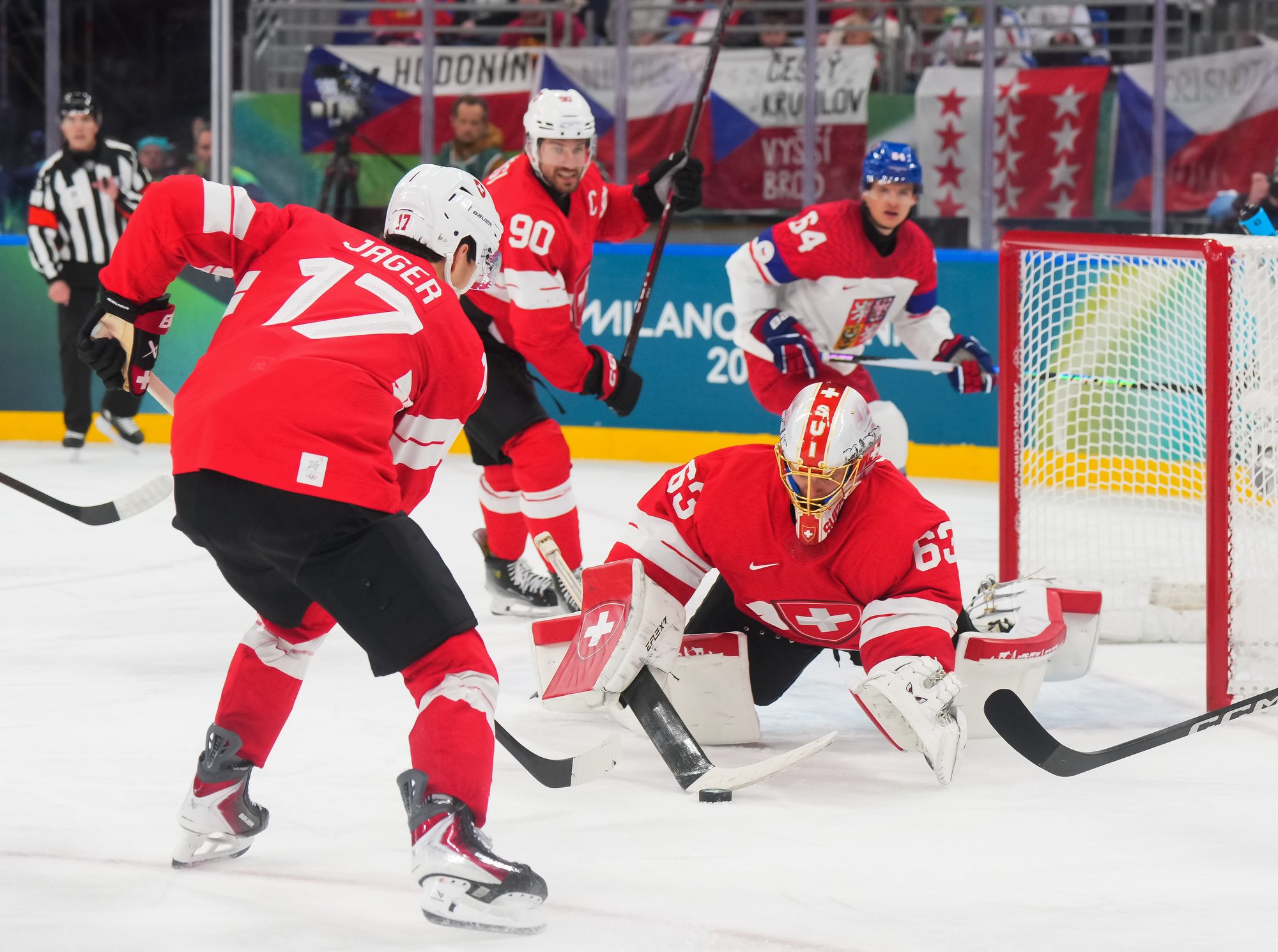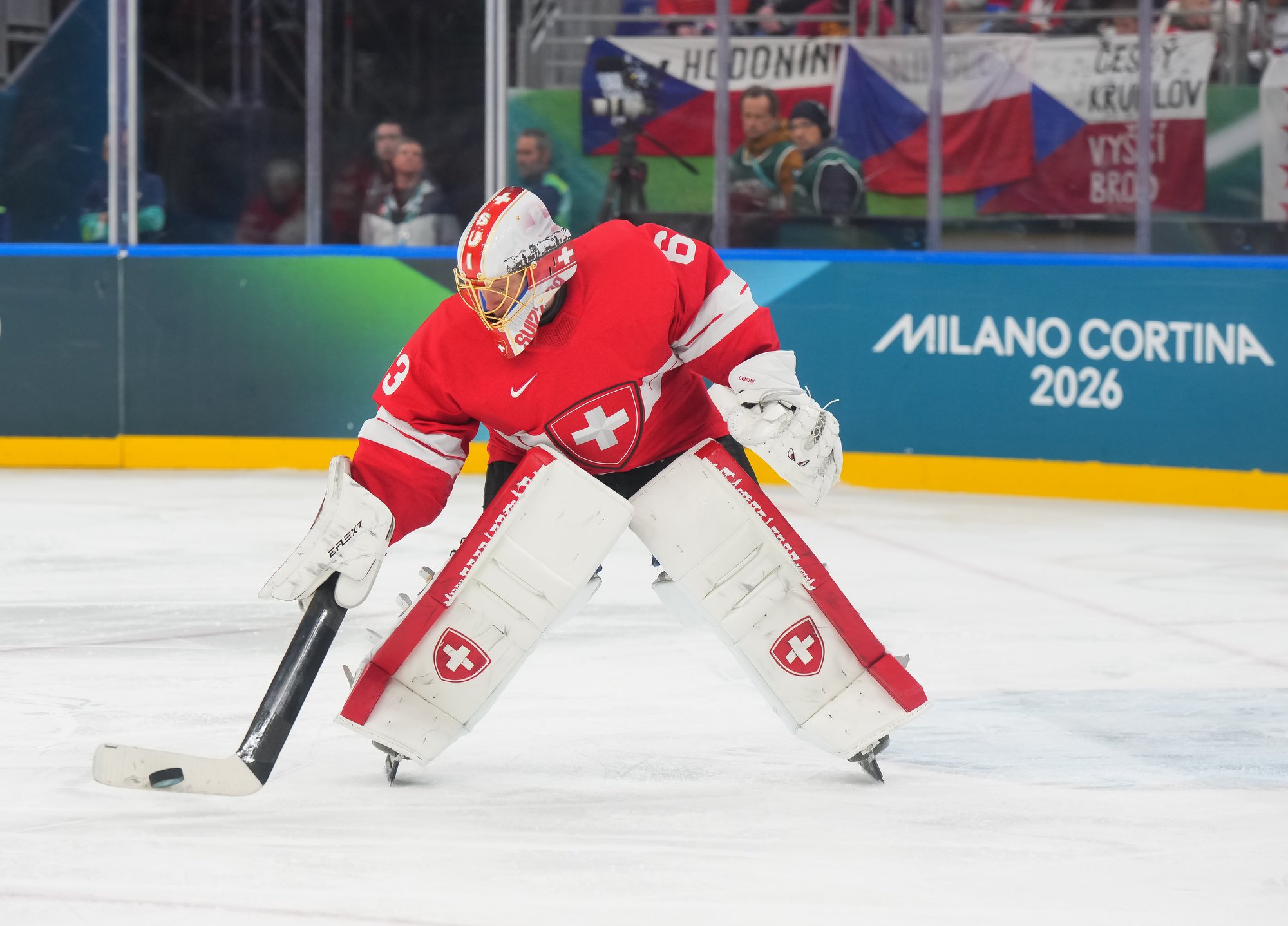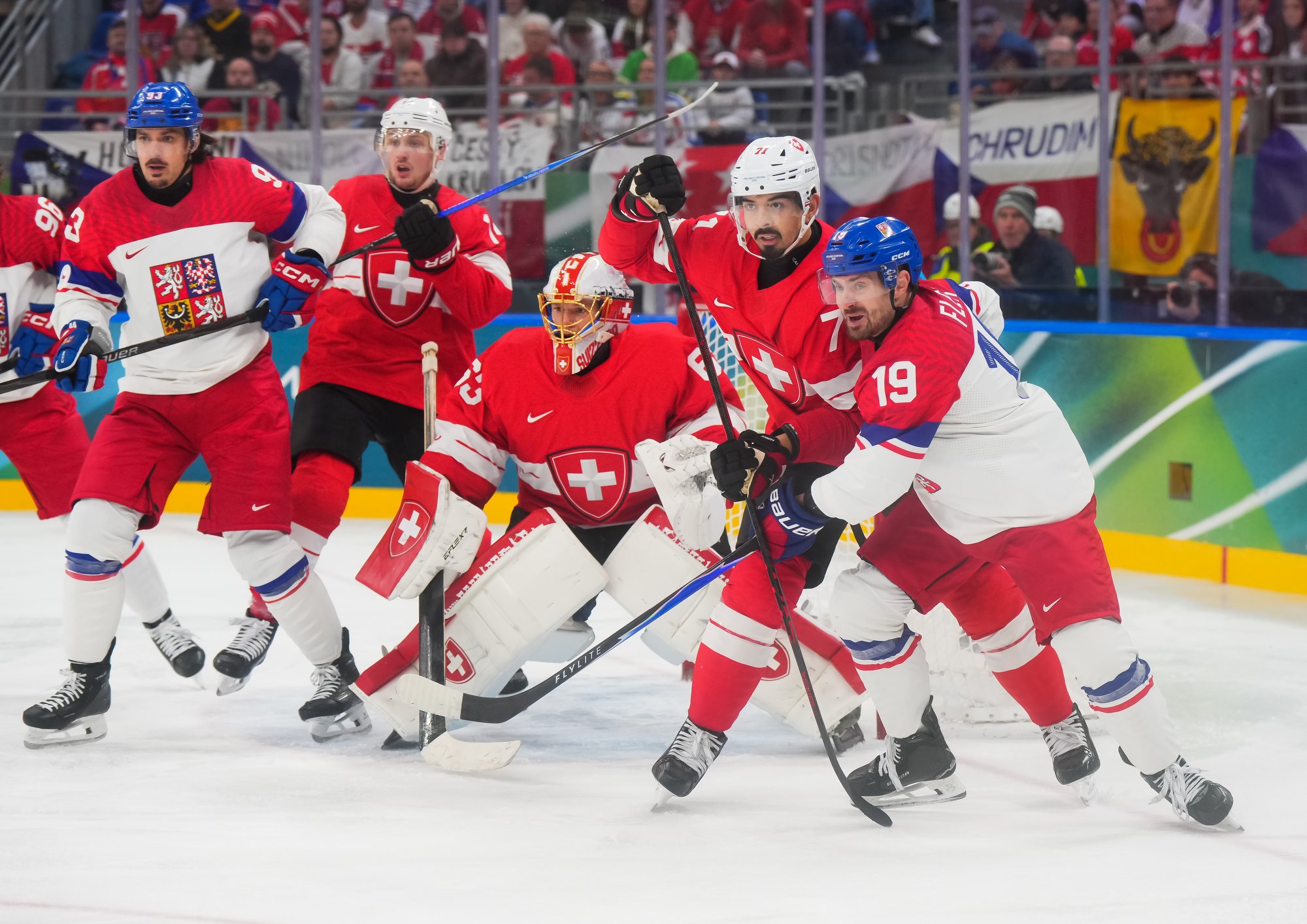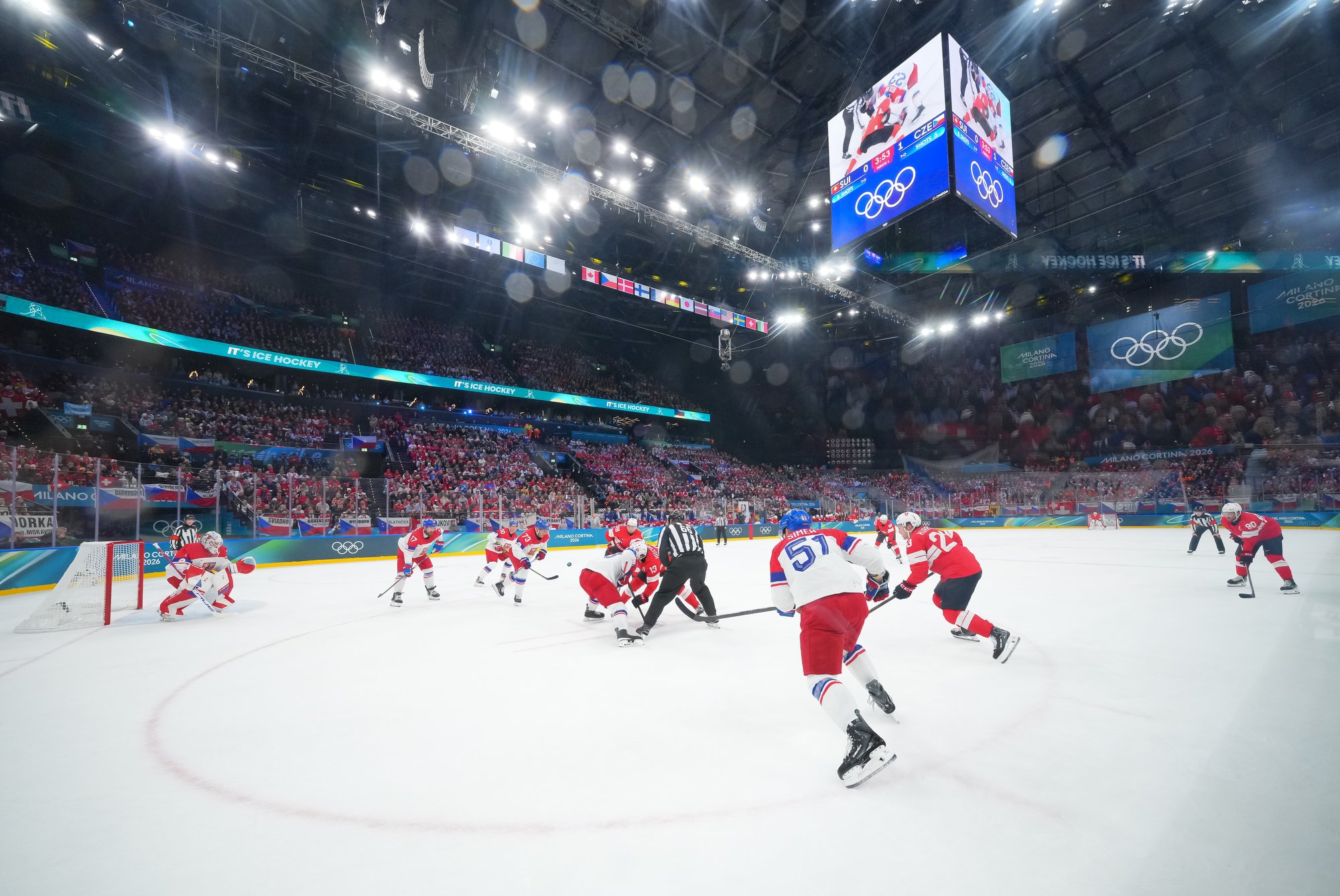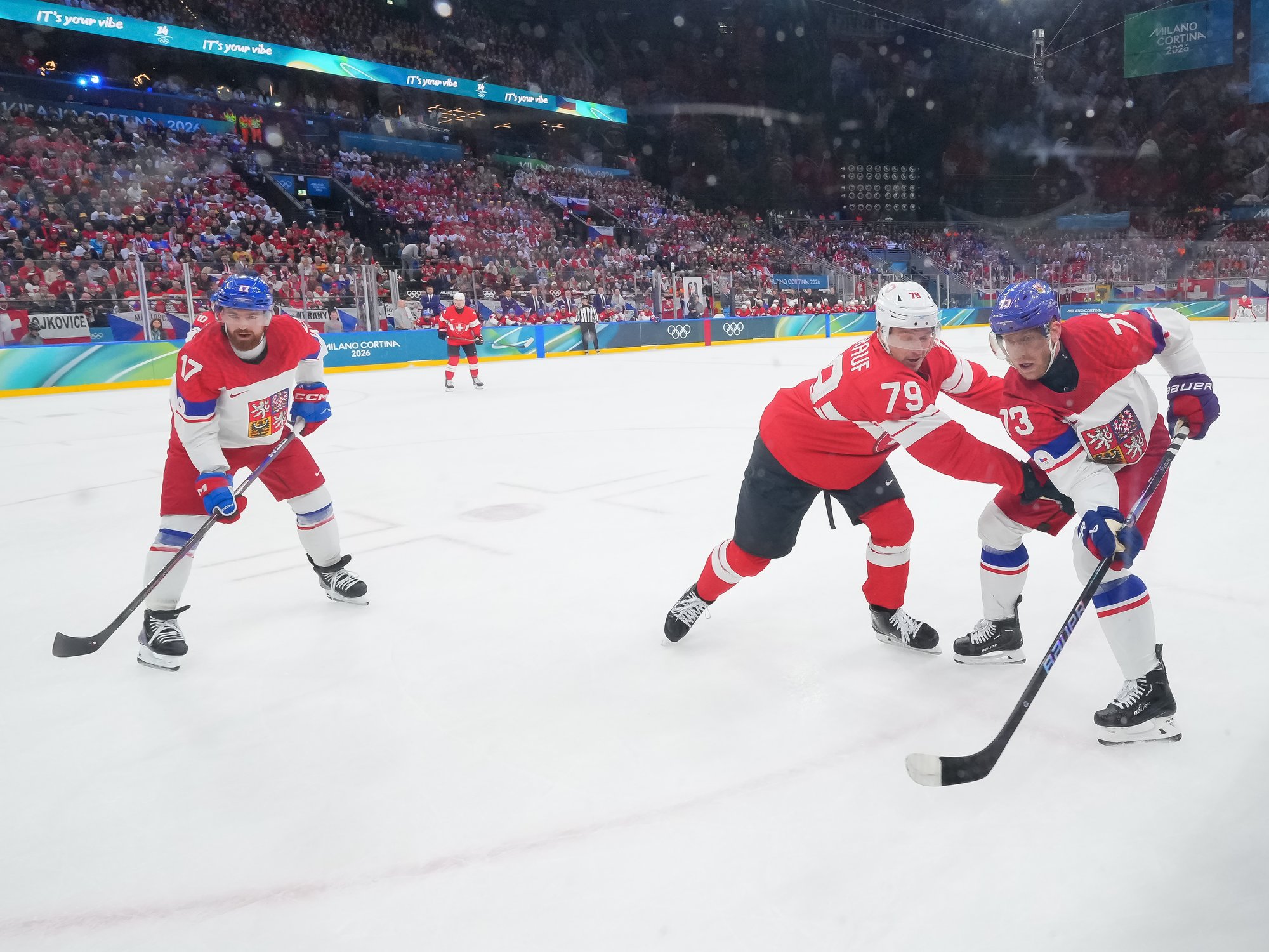 Activating their defence, the Swiss finally got some puck luck with the equalizer at 16:53. Busting into the Czech zone, Josi tried to skim the puck left to Moser, but his pass deflected off the skate of Radko Gudas and past Dostal. The Swiss faithful at the Milano Santa Giulia Ice Hockey Arena burst into song.