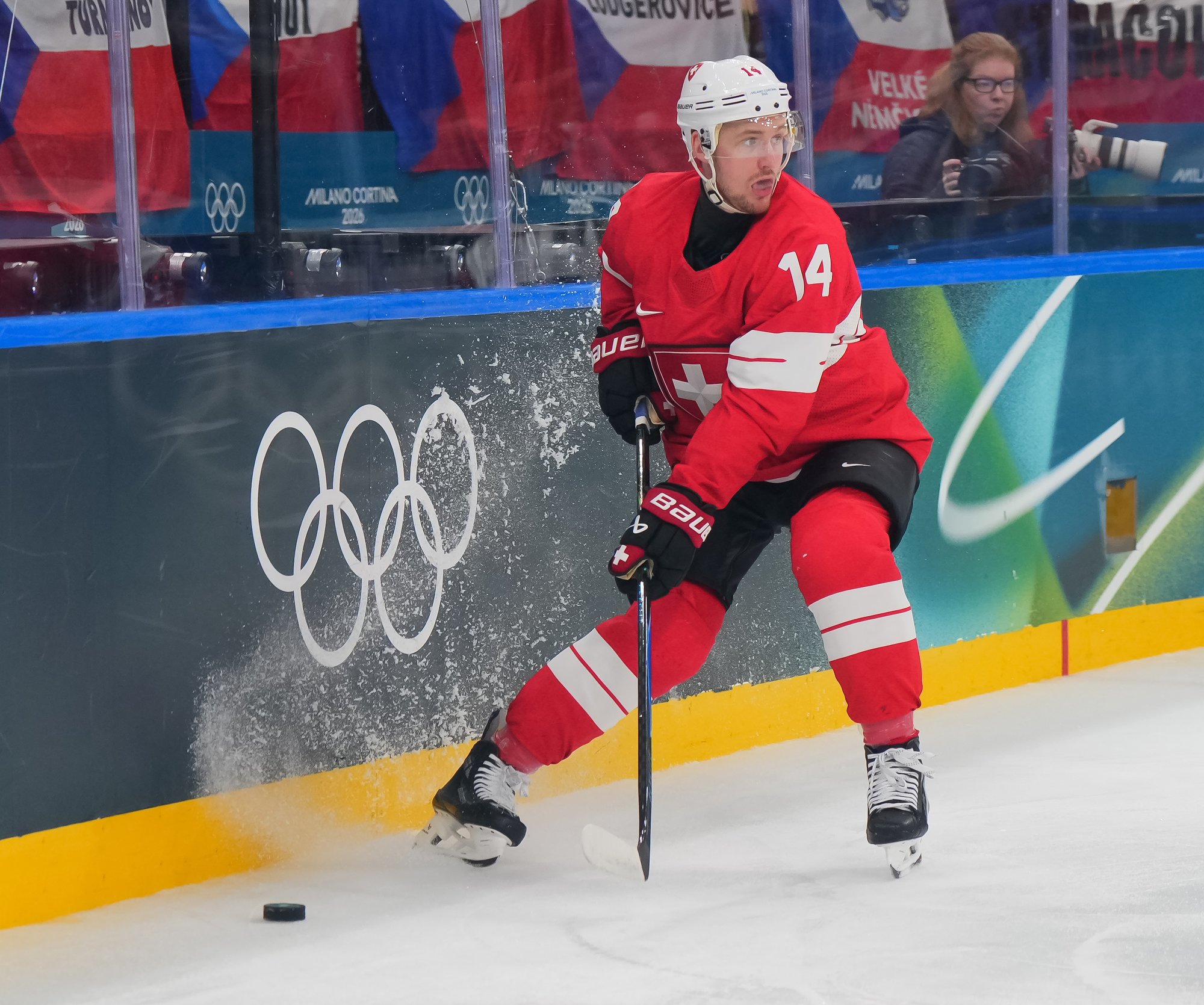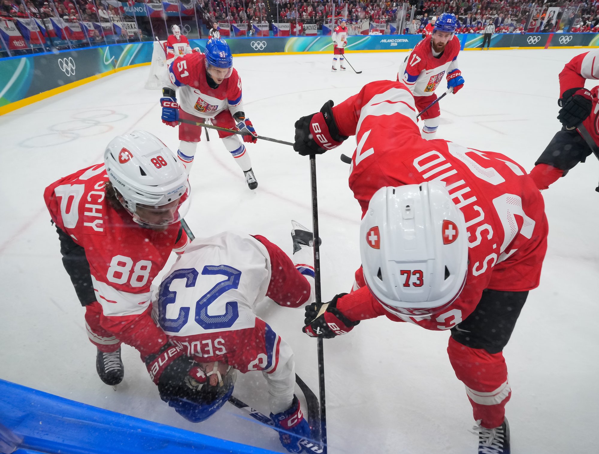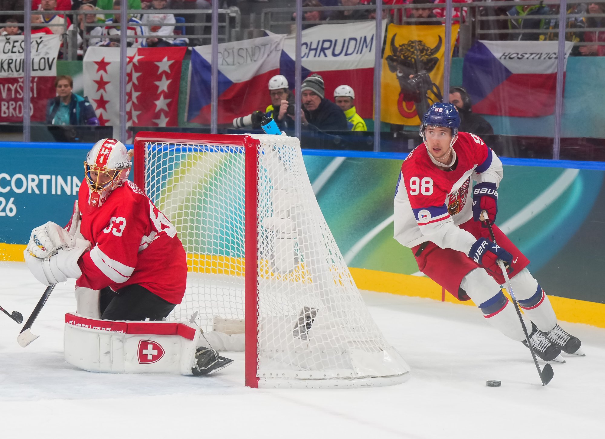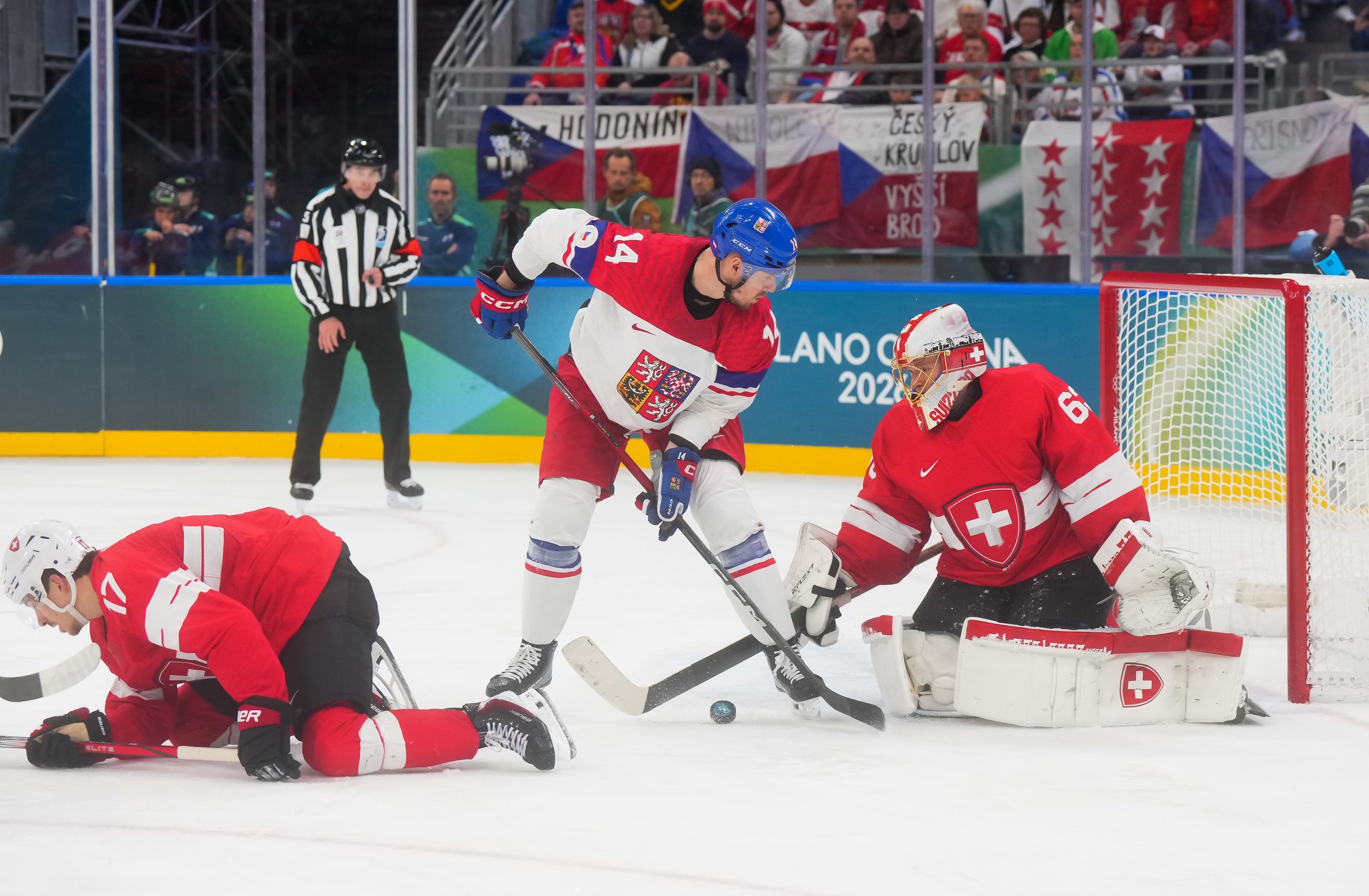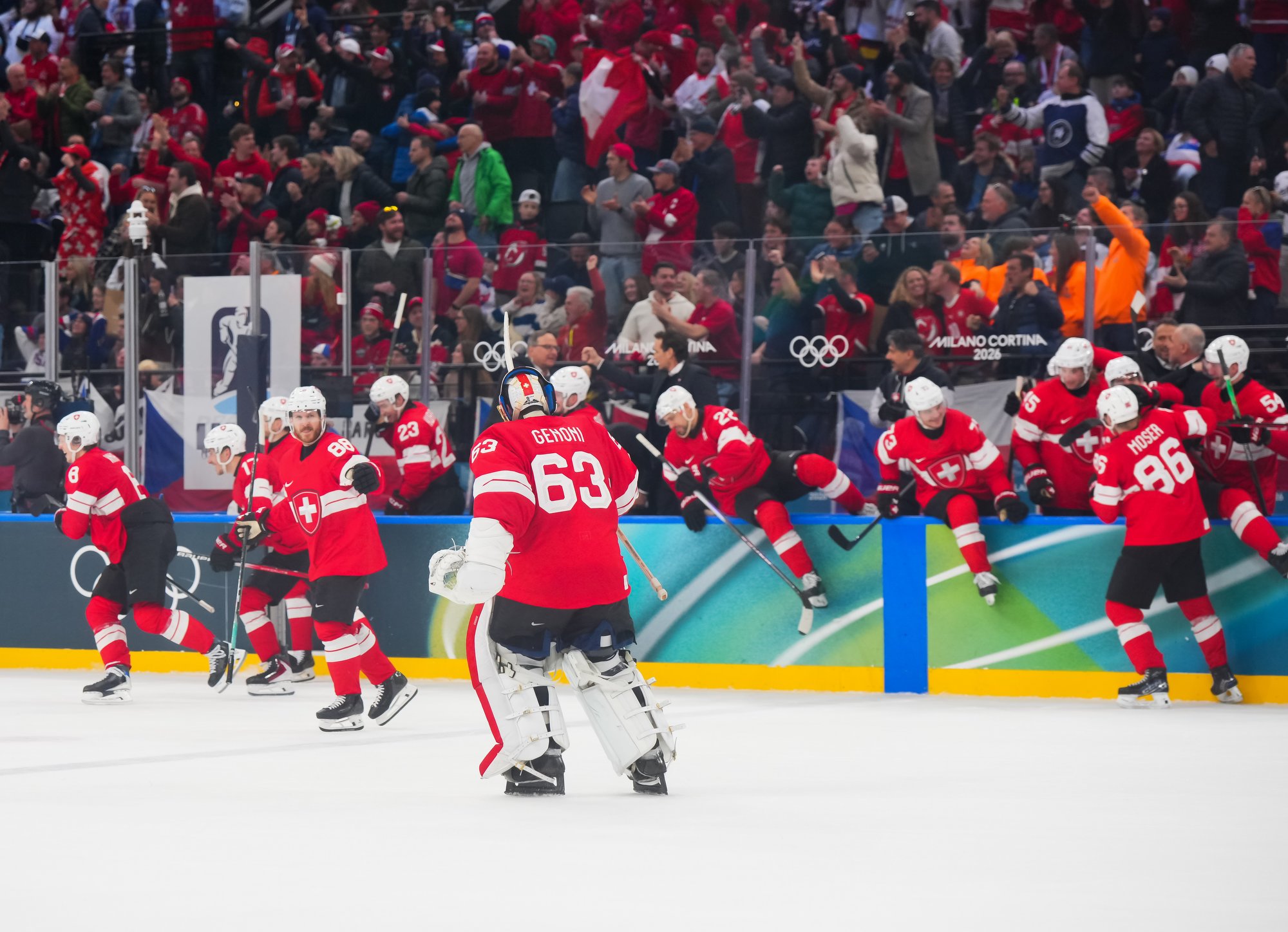 Activating their defence, the Swiss finally got some puck luck with the equalizer at 16:53. Busting into the Czech zone, Josi tried to skim the puck left to Moser, but his pass deflected off the skate of Radko Gudas and past Dostal. The Swiss faithful at the Milano Santa Giulia Ice Hockey Arena burst into song.