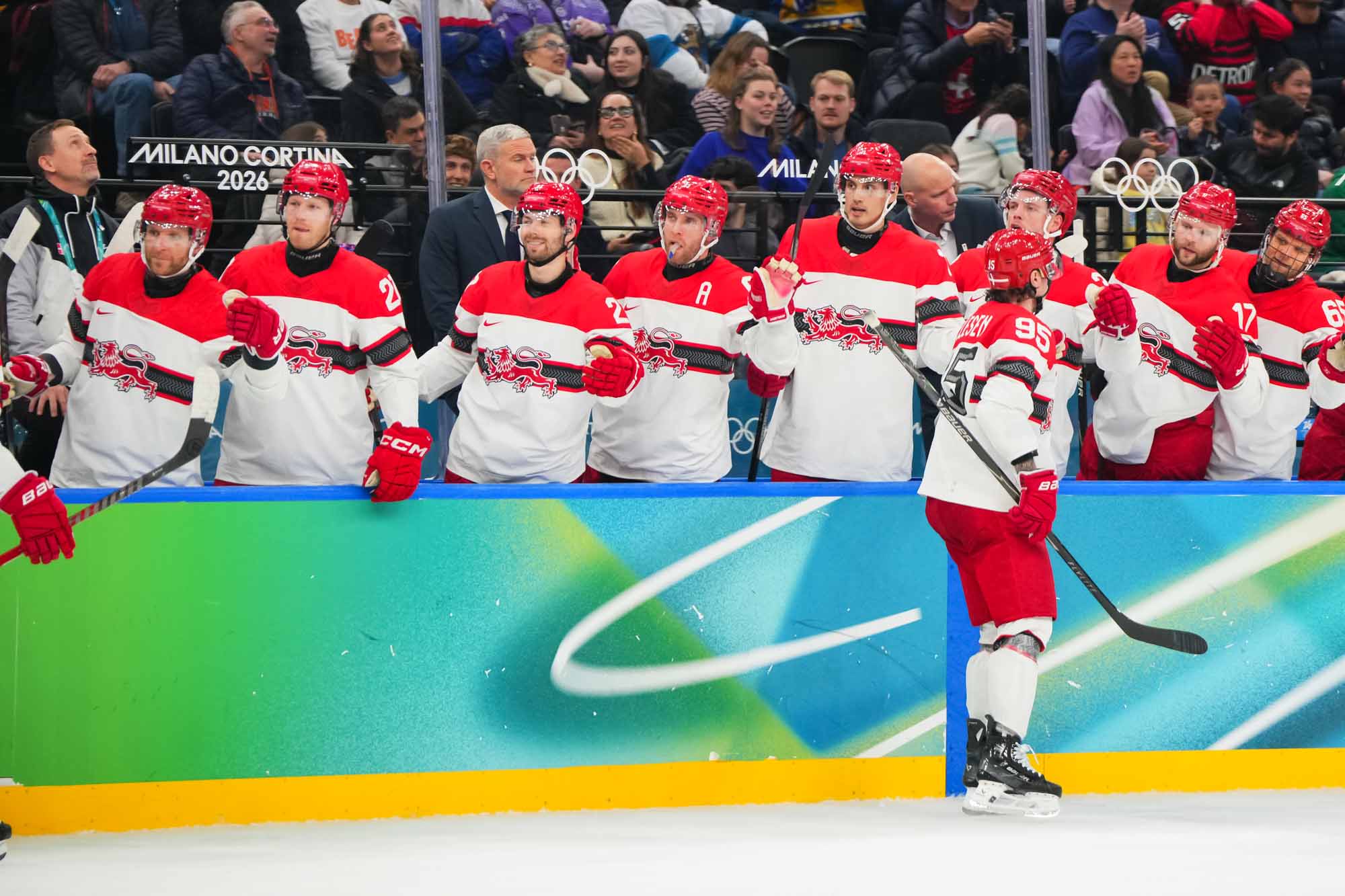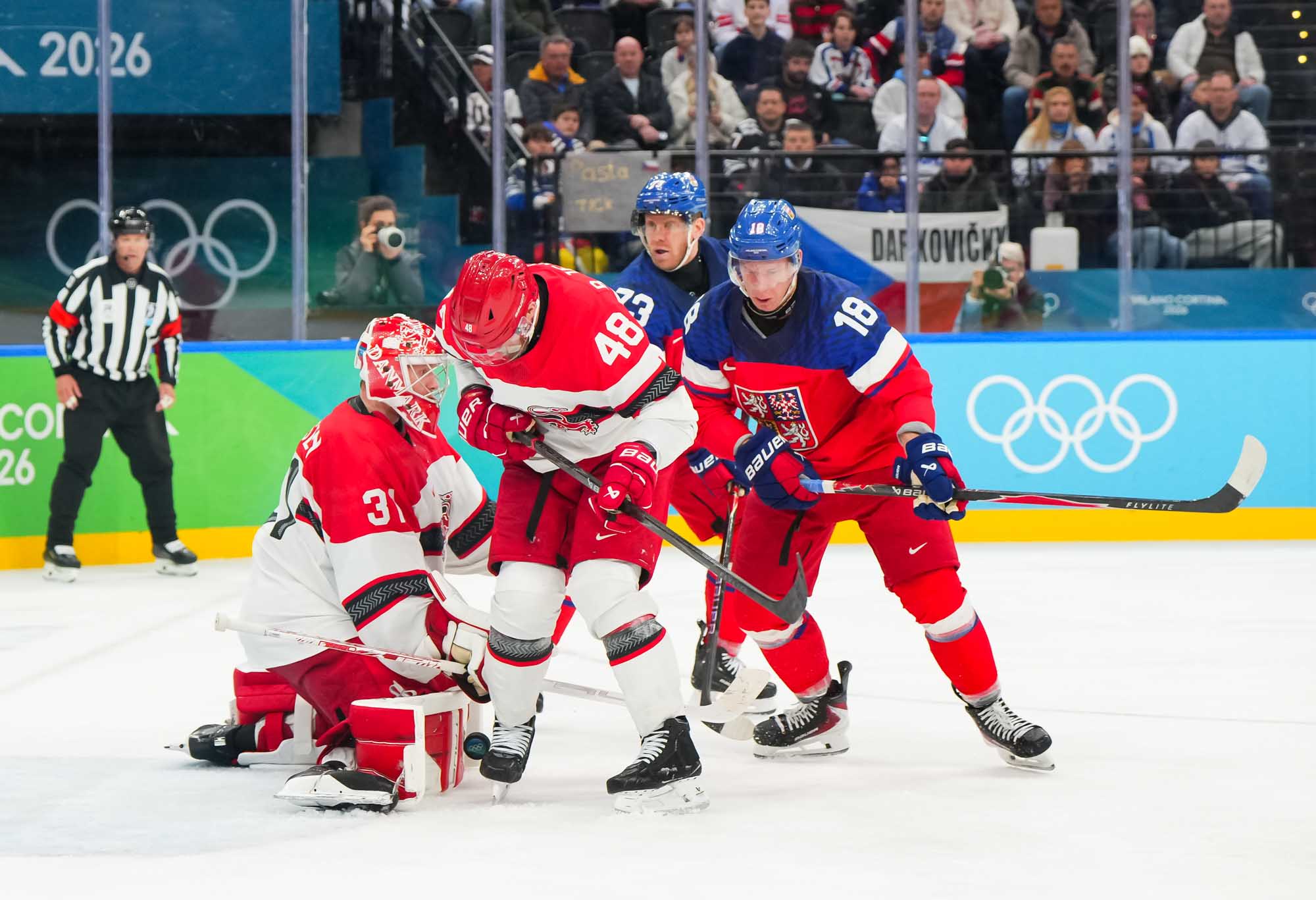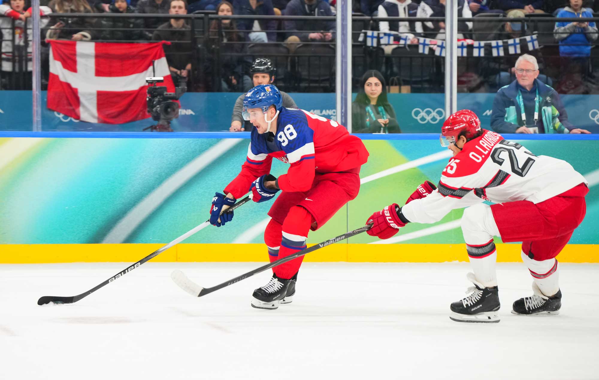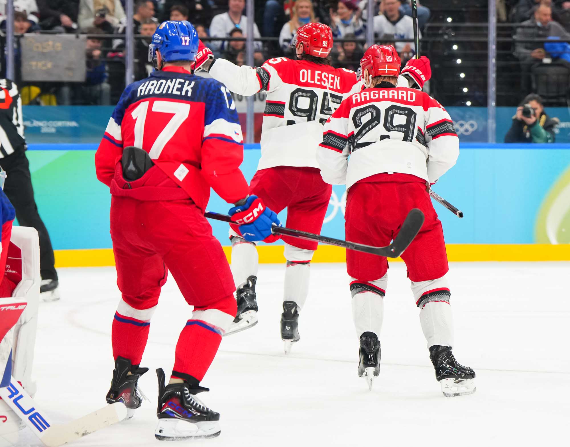 But only a fool would think Denmark had given up. Nick Olesen scored on the power play on a nifty move from the goal line, backing up to the front of the net and beating Dostal with a wrister top shelf, assisted by Oskar Moelgaard and Blichfeld.