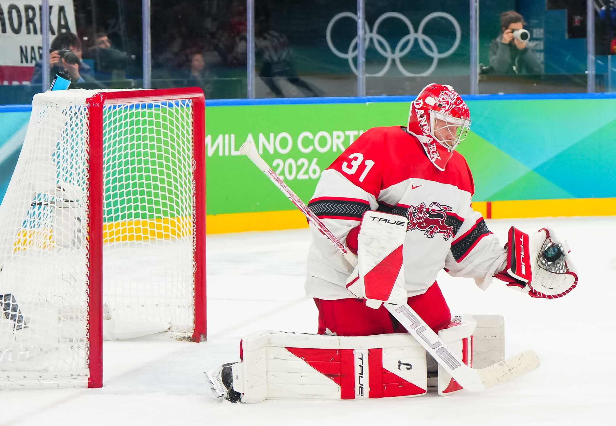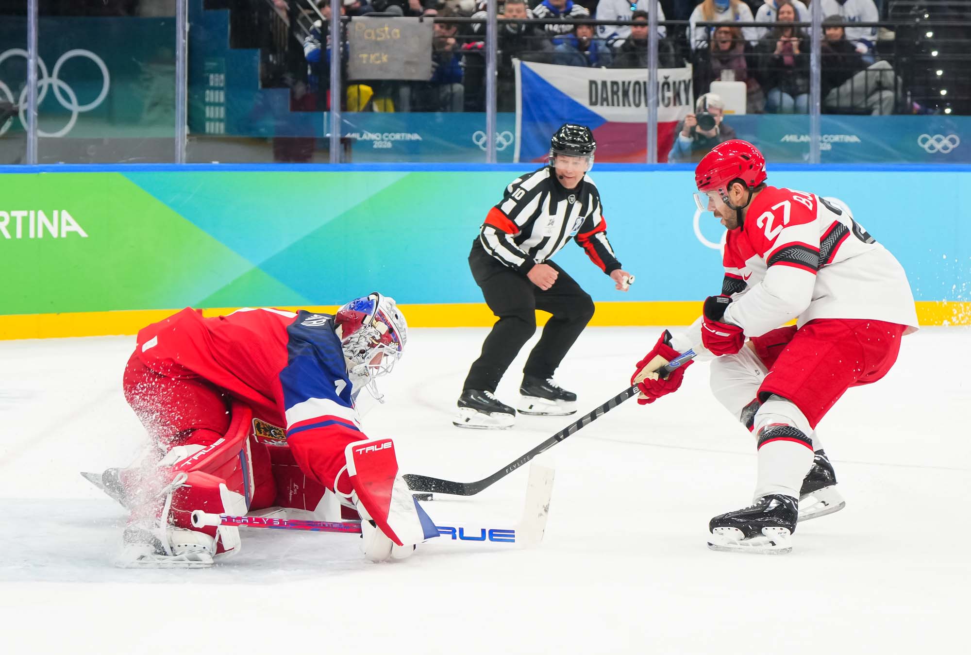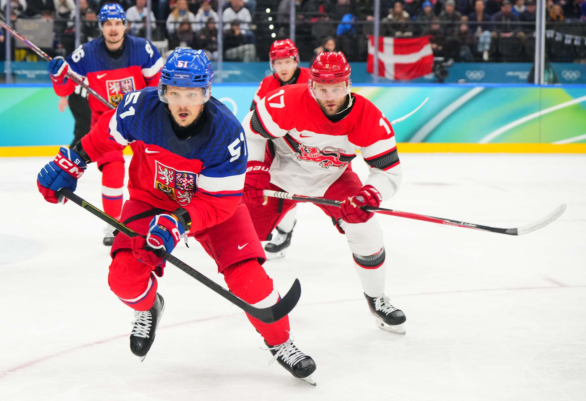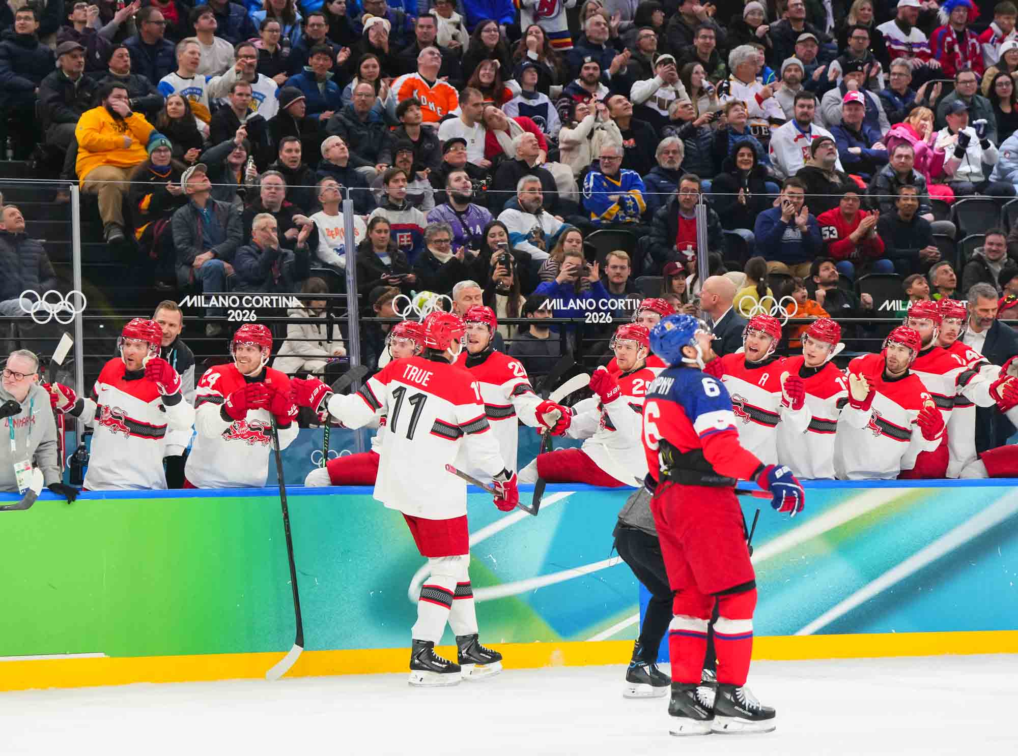 But only a fool would think Denmark had given up. Nick Olesen scored on the power play on a nifty move from the goal line, backing up to the front of the net and beating Dostal with a wrister top shelf, assisted by Oskar Moelgaard and Blichfeld.
