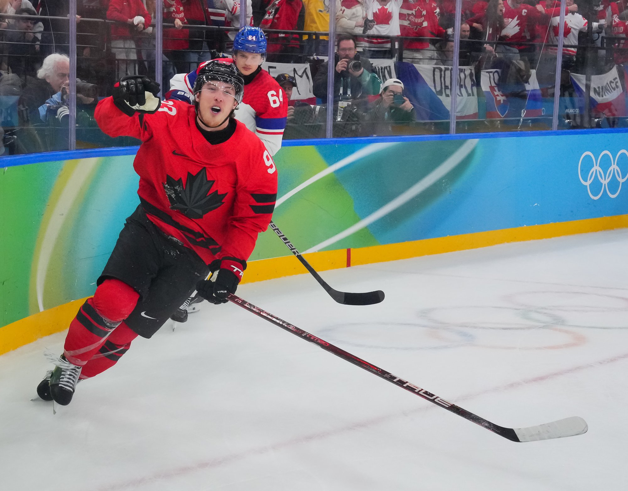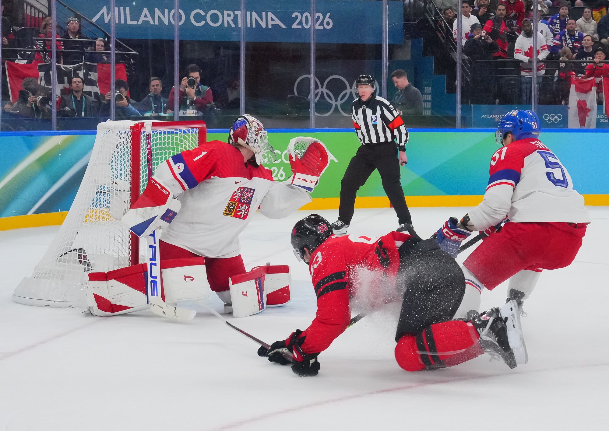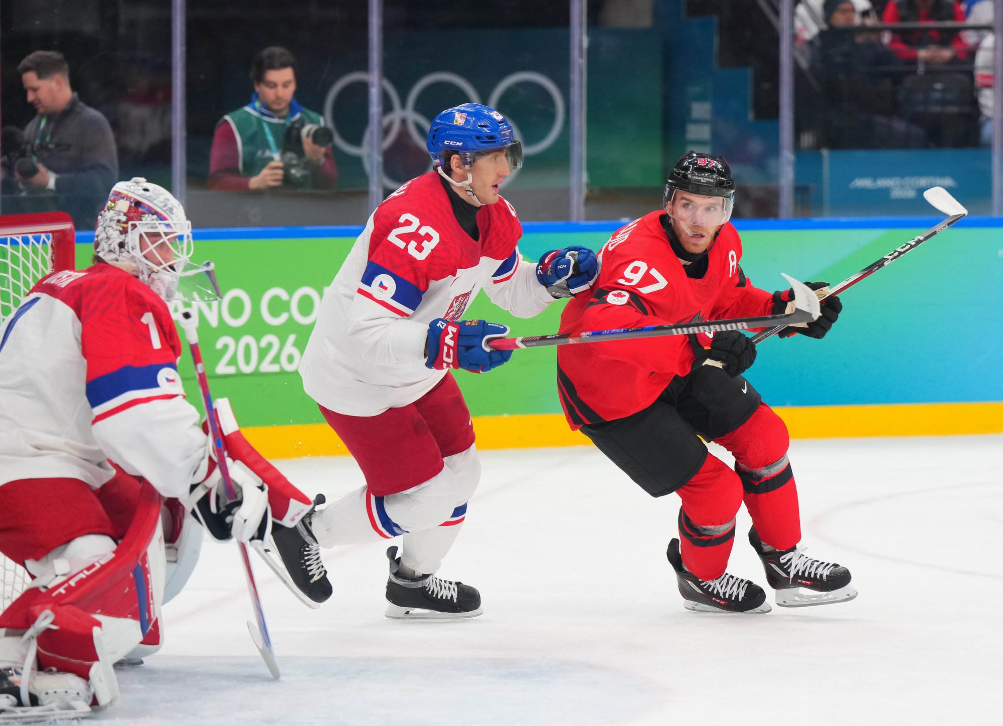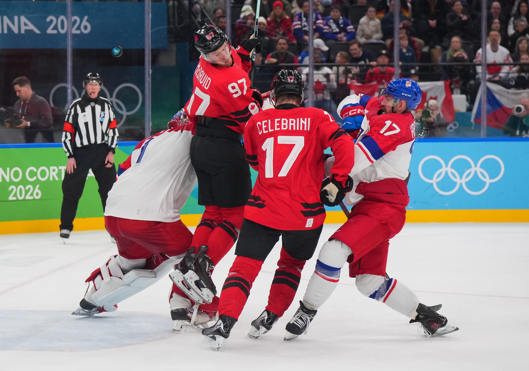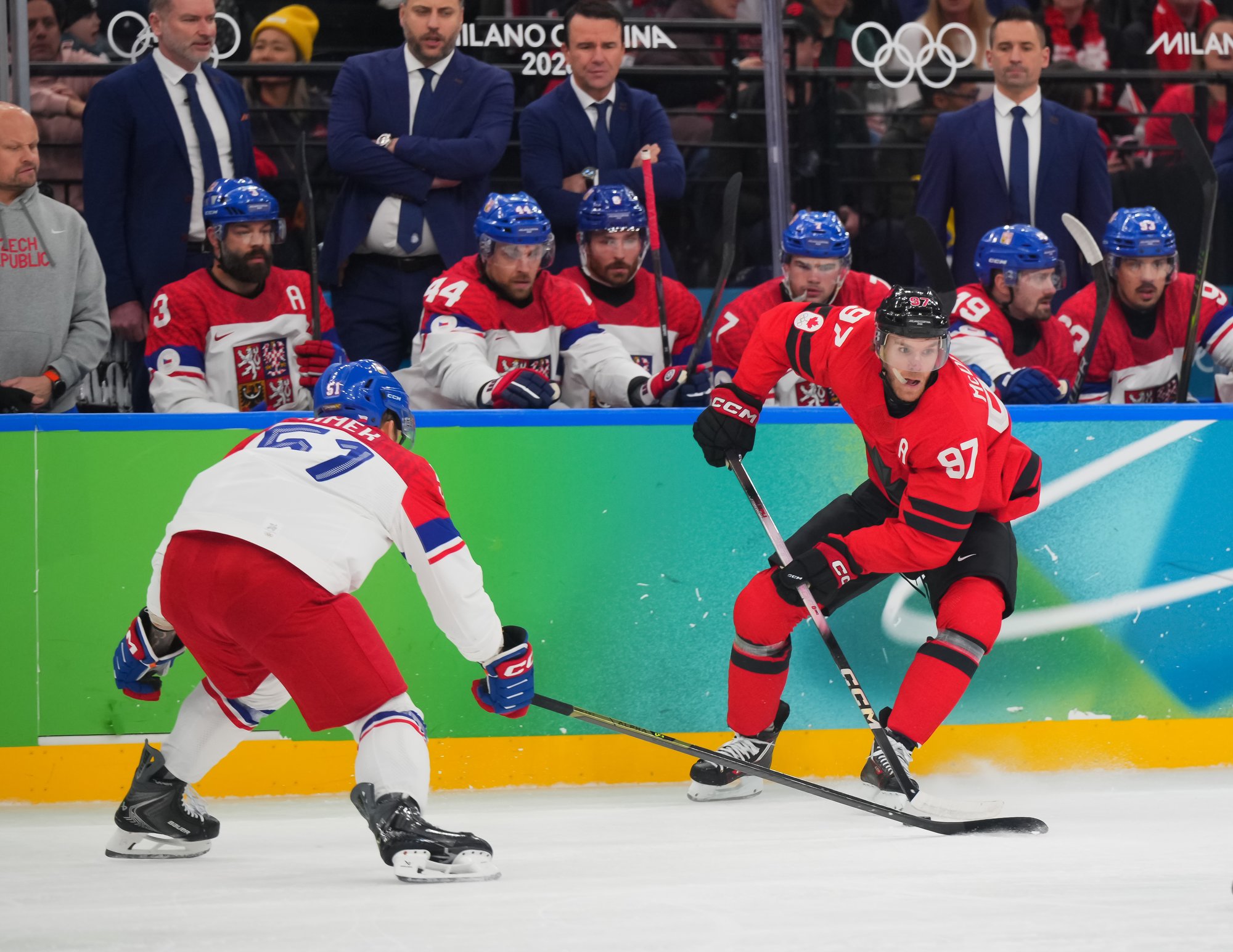 The Czechs showed some early nerves puckhandling-wise. It bit them when McDavid stole the puck from Pastrnak inside the Czech blue line and then sent it back in the slot to Celebrini, who zinged home his tournament-leading fifth goal at 3:05.