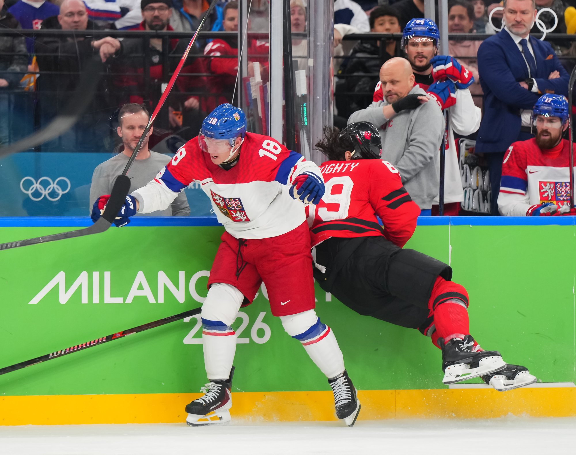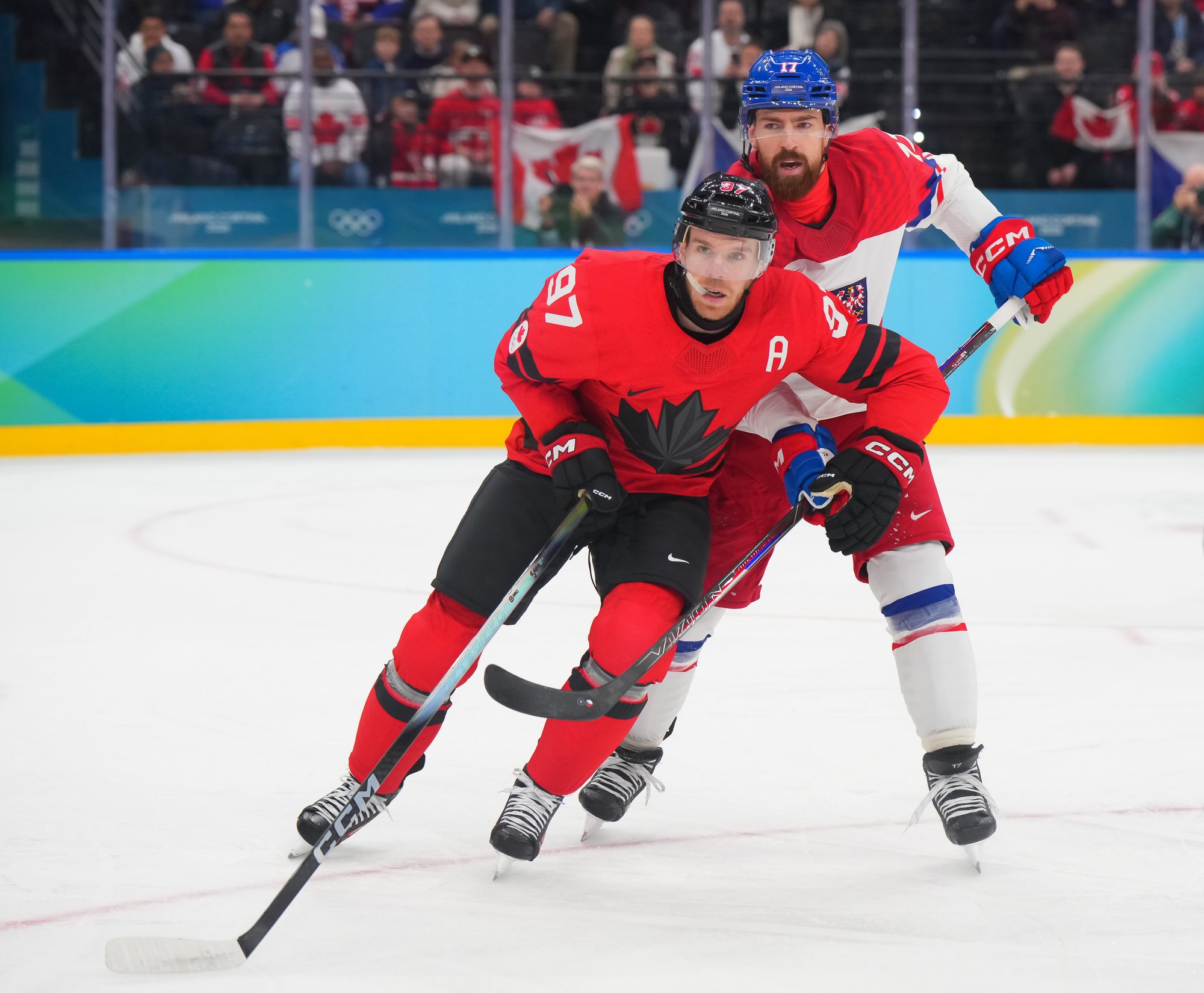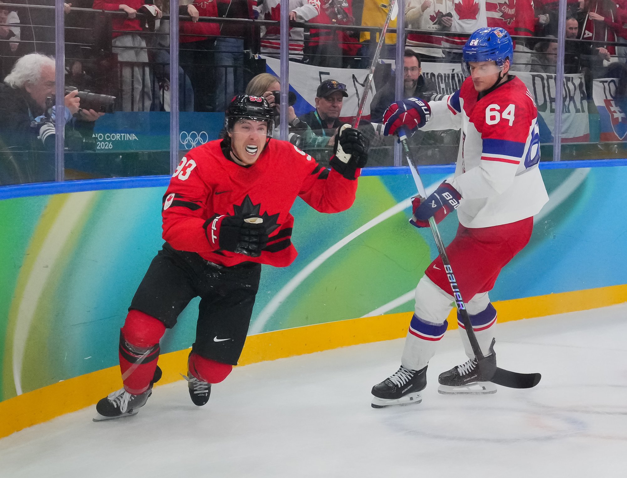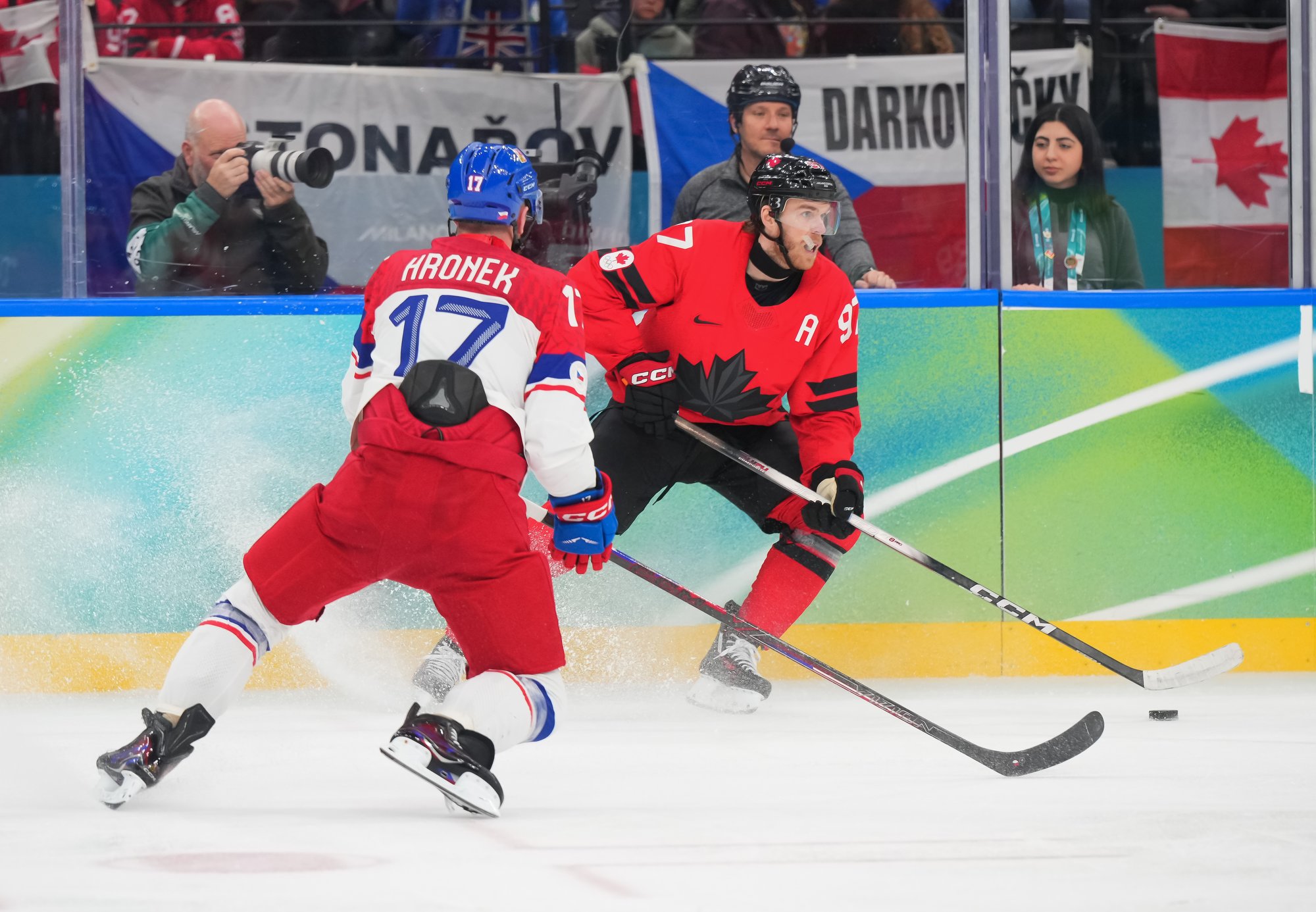 The Czechs showed some early nerves puckhandling-wise. It bit them when McDavid stole the puck from Pastrnak inside the Czech blue line and then sent it back in the slot to Celebrini, who zinged home his tournament-leading fifth goal at 3:05.