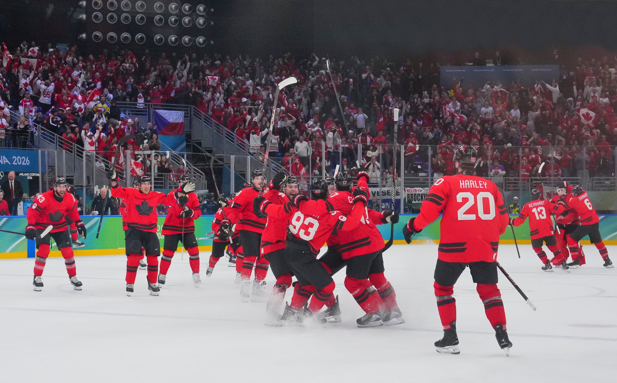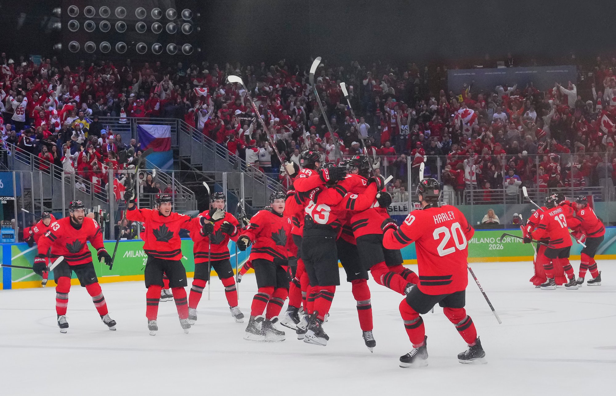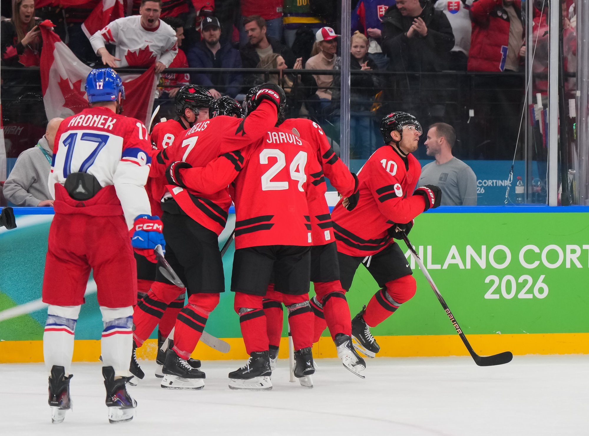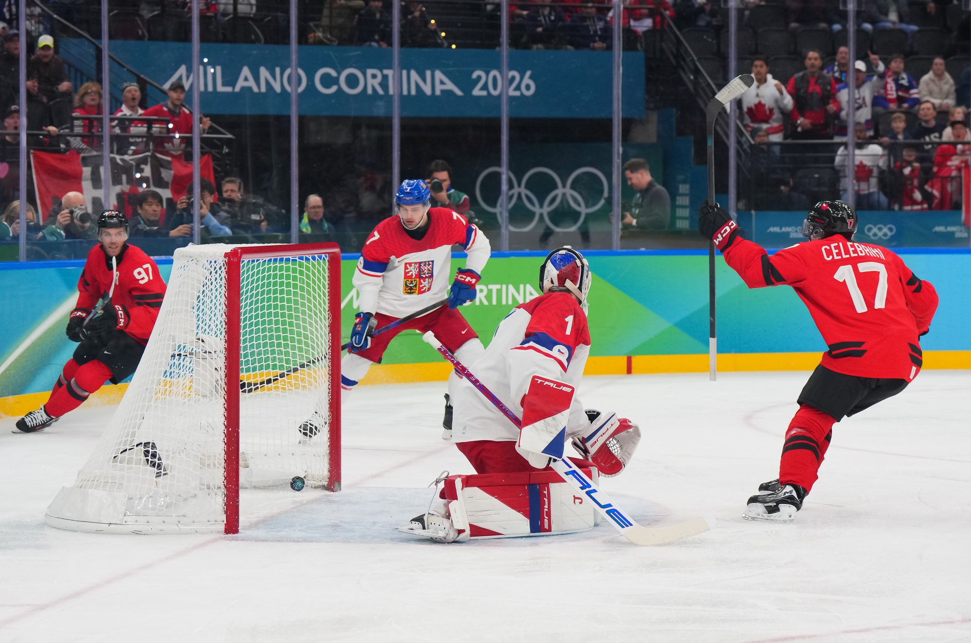 Canada's Mitch Marner (#17) celebrates after scoring the overtime winner in a hard-fought 4-3 victory over Czechia in the 2026 Olympic quarter-finals.