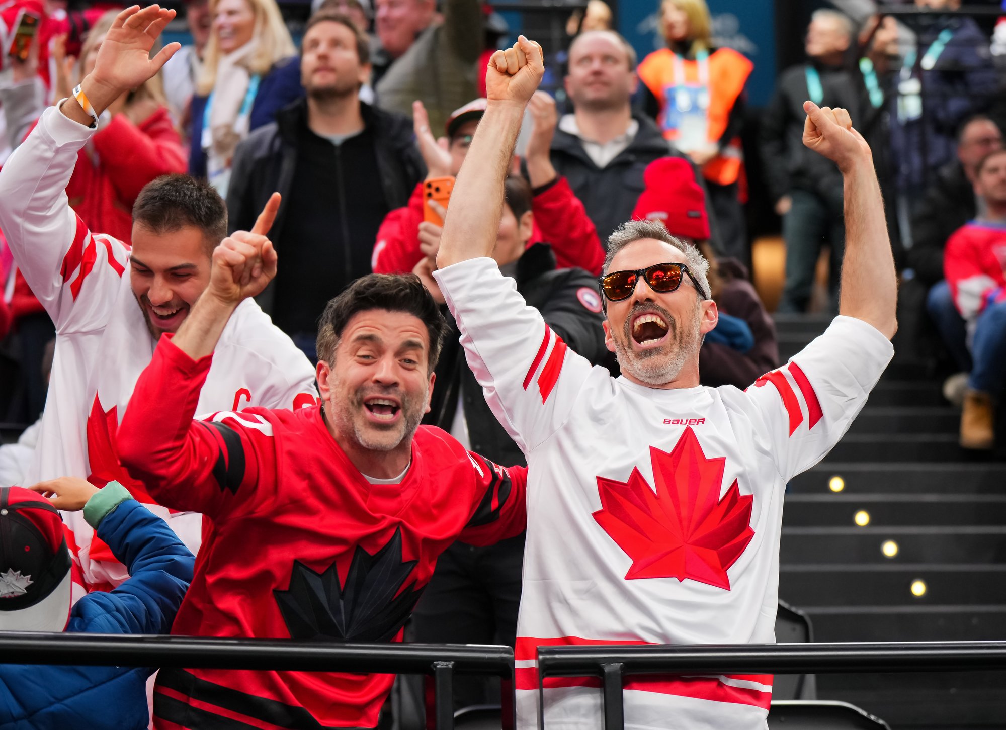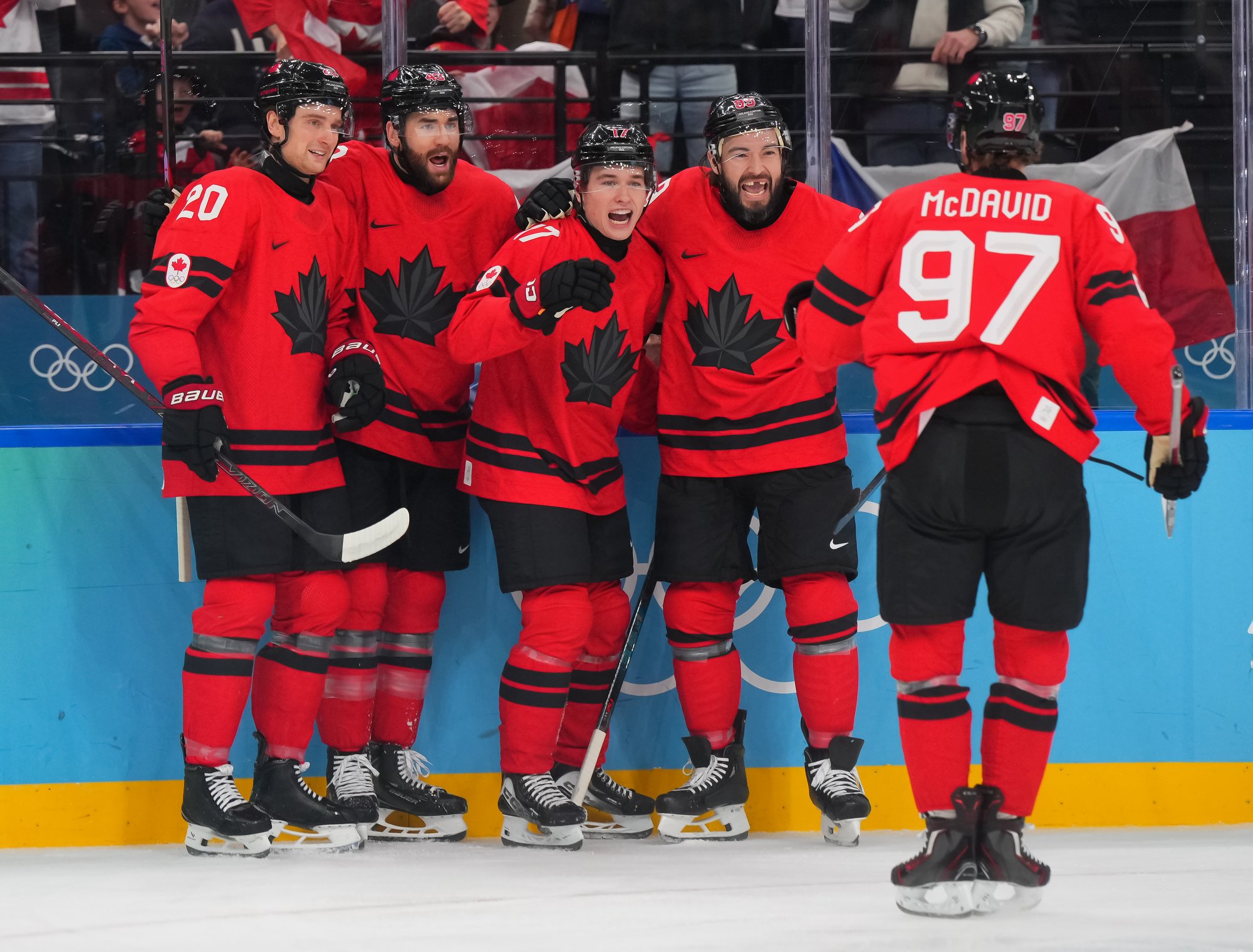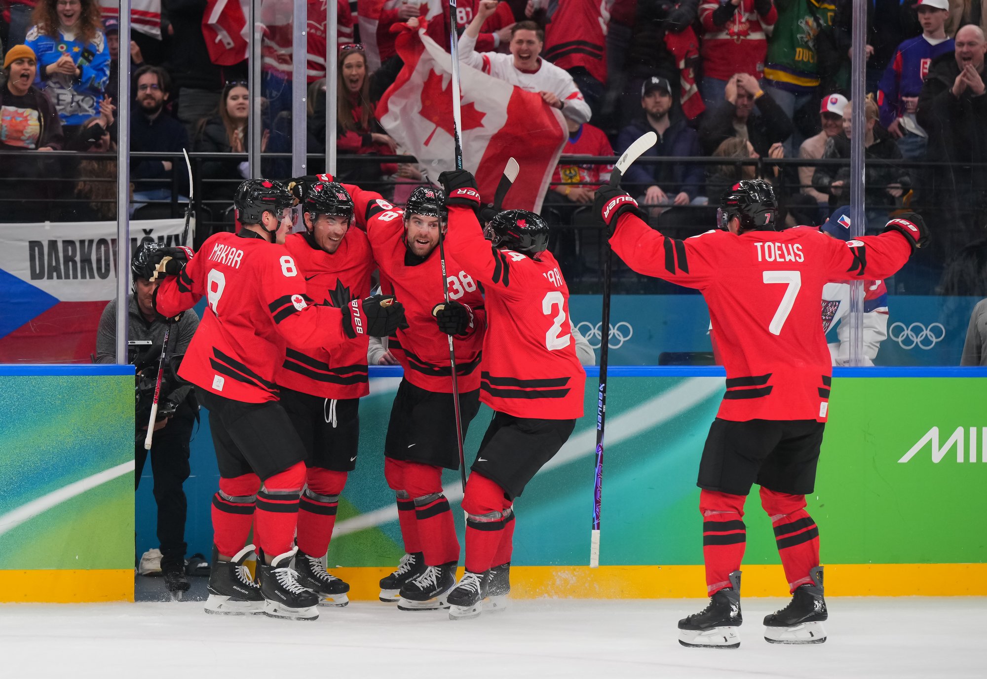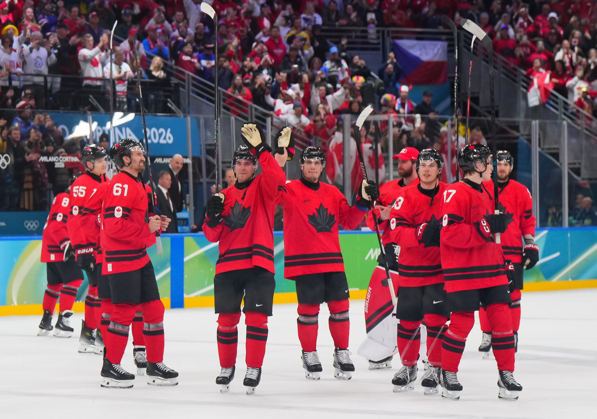 Canada's Mitch Marner (#17) celebrates after scoring the overtime winner in a hard-fought 4-3 victory over Czechia in the 2026 Olympic quarter-finals.