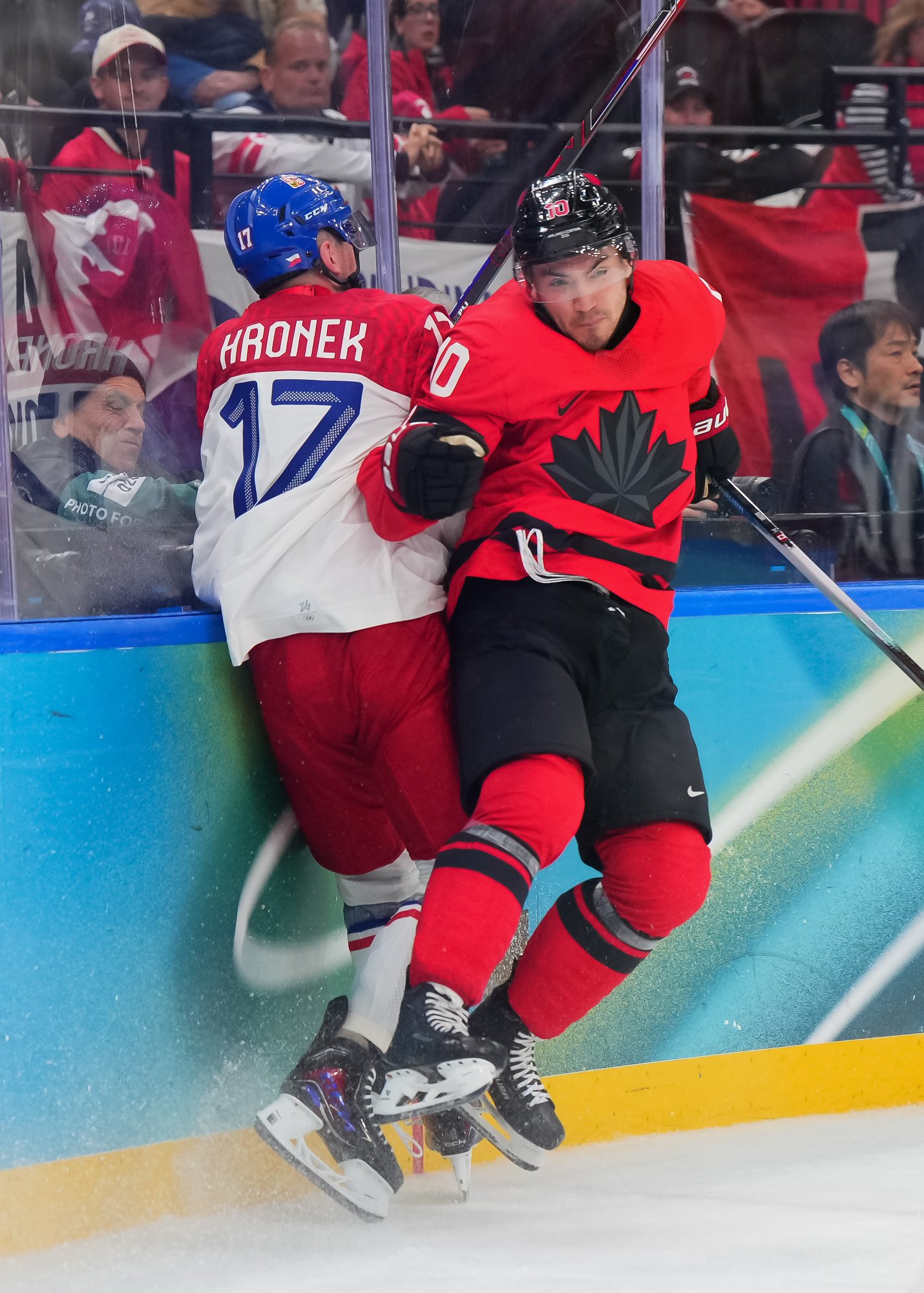 Canada was carrying the play and picking up the hitting, as Drew Doughty laid out Pastrnak with a shoulder-to-chest crusher. But the Czechs hadn't lost their belief, as David Kampf rattled one off Binnington's right post. Suzuki then hit the iron moments later with a wide-open net. Shots were 17-5 Canada in the middle frame.