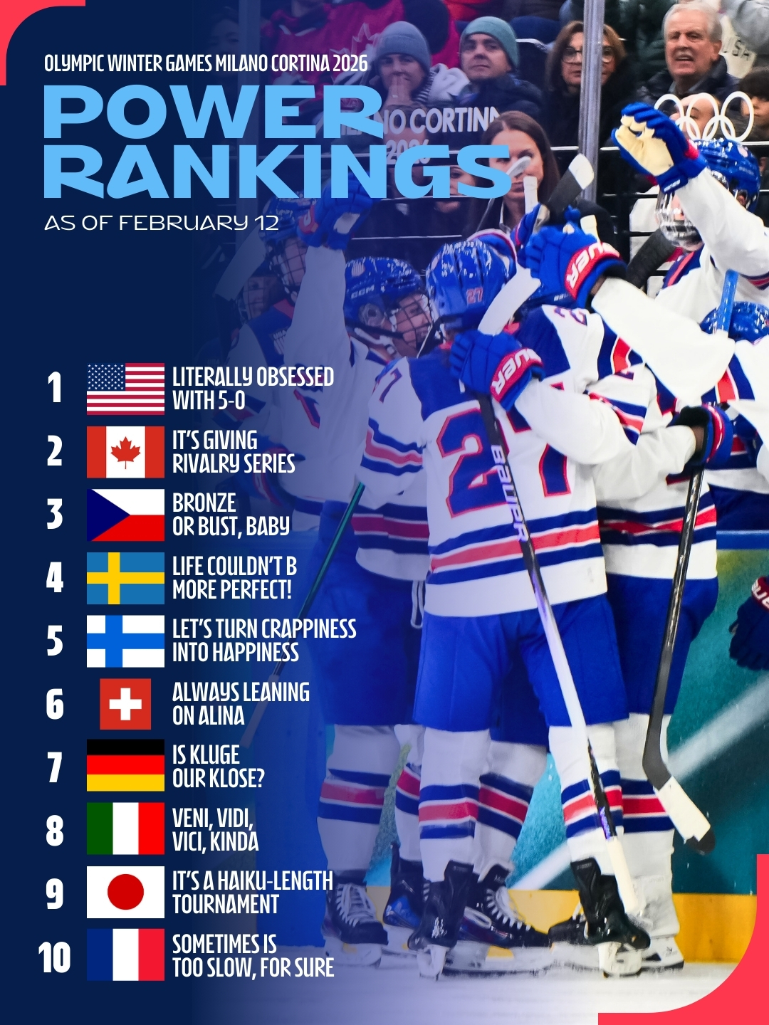During the preliminary round, it was a pure celebration in Milan for the powerful American women's hockey team, which tops our second Power Rankings of these Olympics.