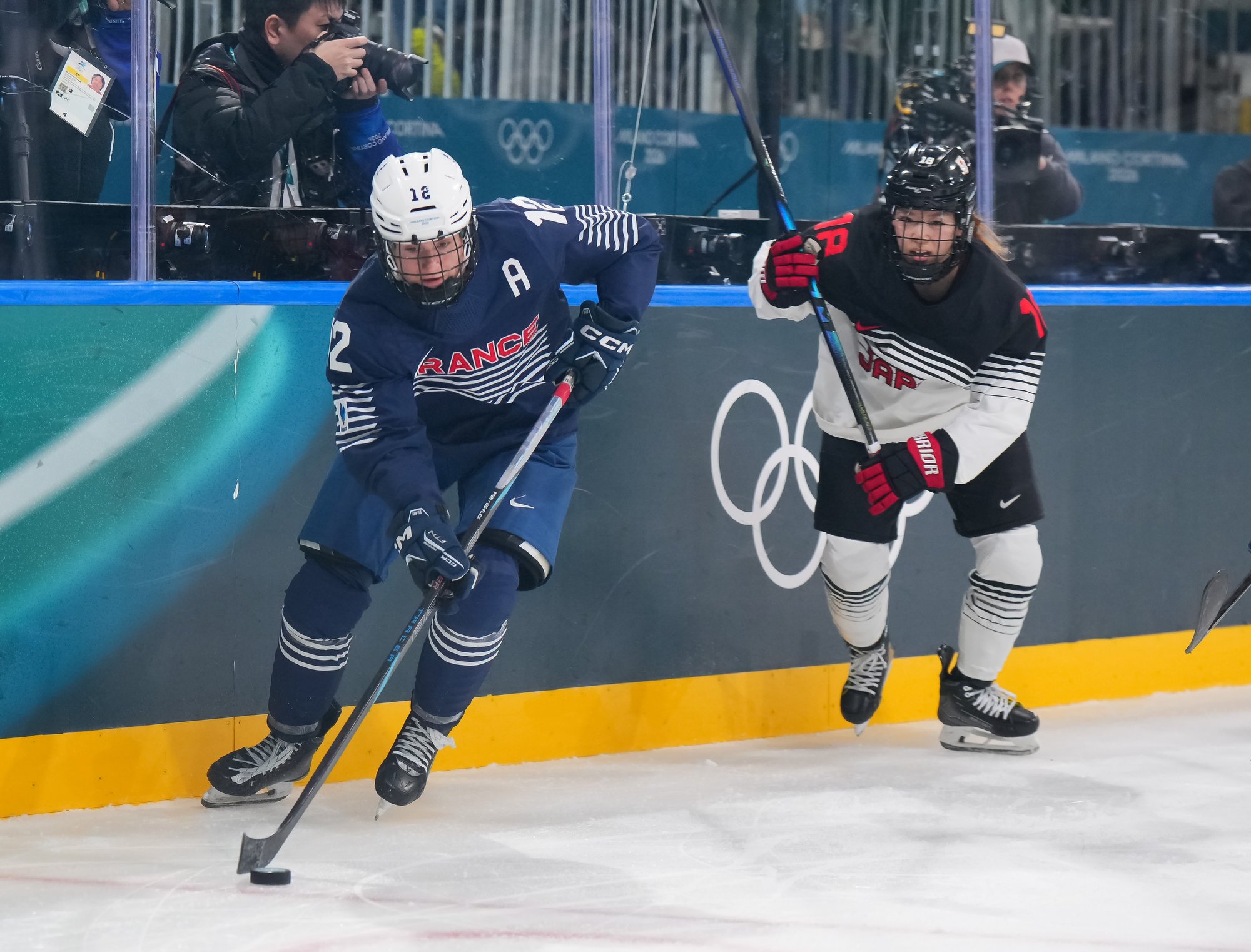 France, however, struck back with a less elegant but equally legitimate goal. Manon le Scodan brought the puck over the line and got past defender Kanami Seki. Le Scodan lost control of the puck, but big captain Lore Baudrit took a swipe at it. It bounced off Ayaka Hitosato in the crease and rolled over the goal line with only 17.7 seconds left in the period, making it a 1-1 game.