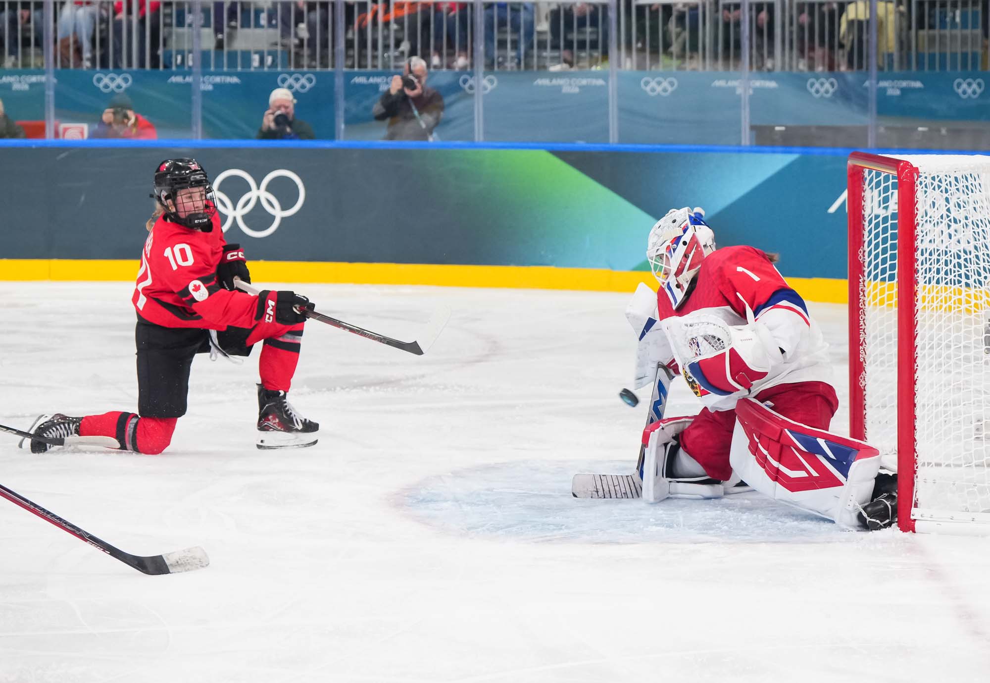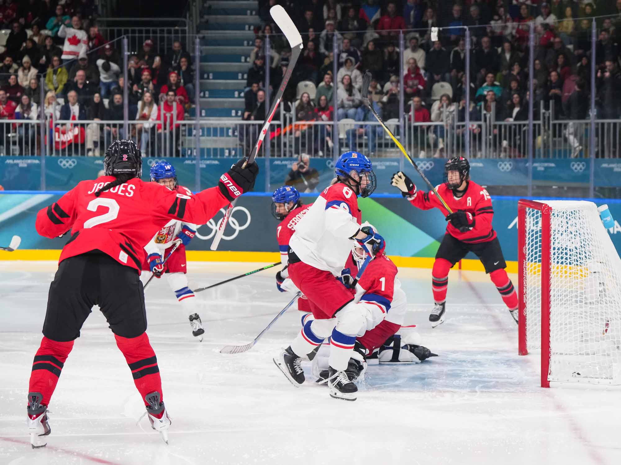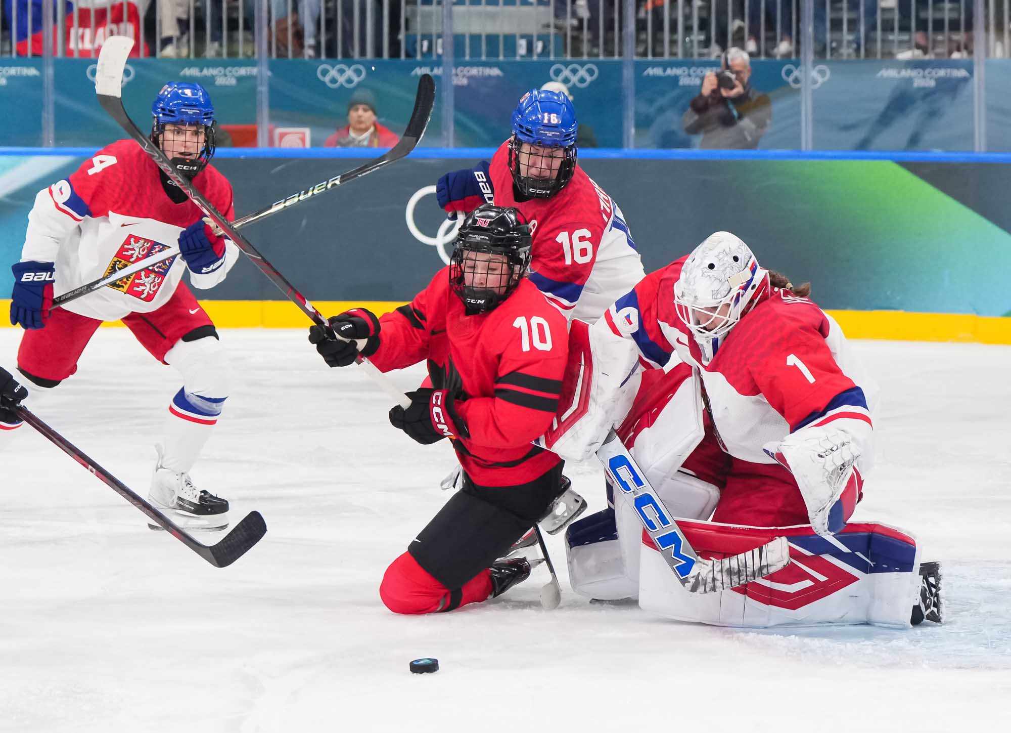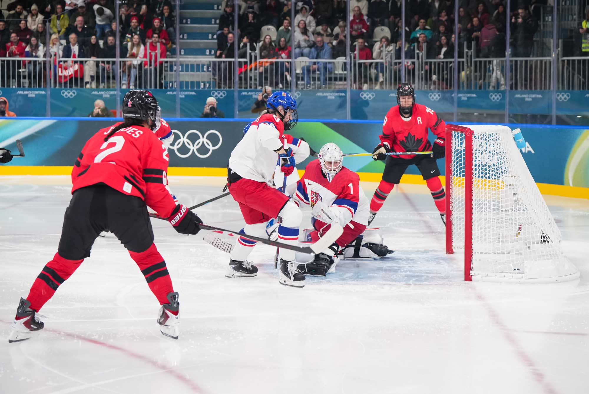 Early in the game, the Czechs went from having a great chance to trailing 1-0. They had a five-on-three for 64 seconds, but they couldn’t convert on the golden opportunity. Instead, when Renata Fast came out of the box to finish the second penalty, she got the puck and drove to the net on a partial break. Julie Pejsova made the save, but Kristin O’Neill batted in the rebound at 5:44 to give Canada the early lead.