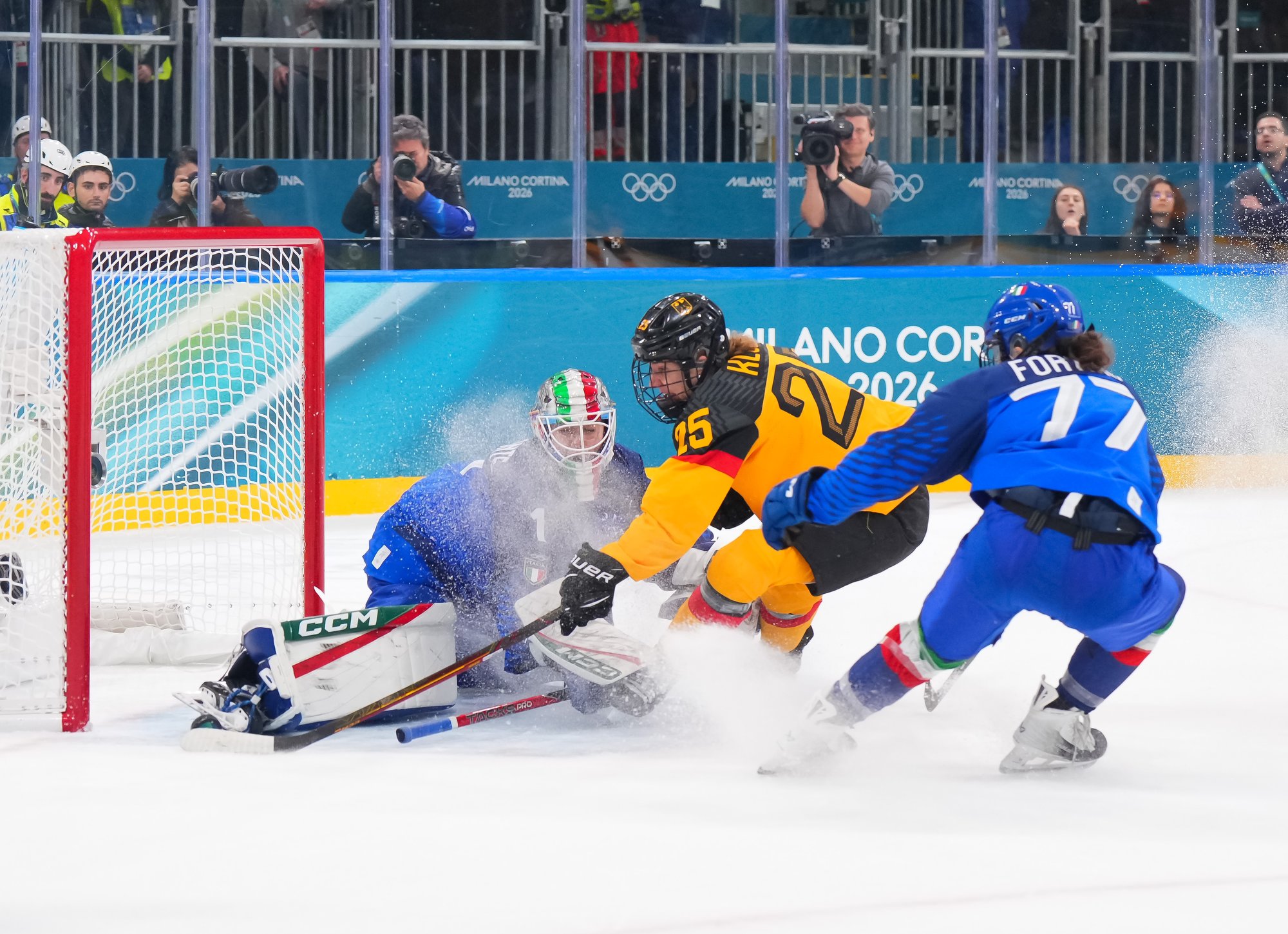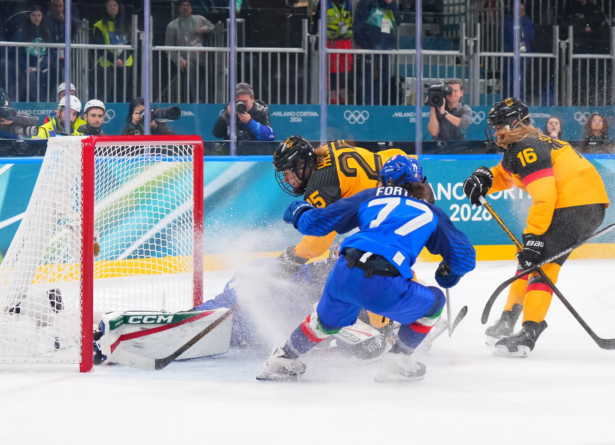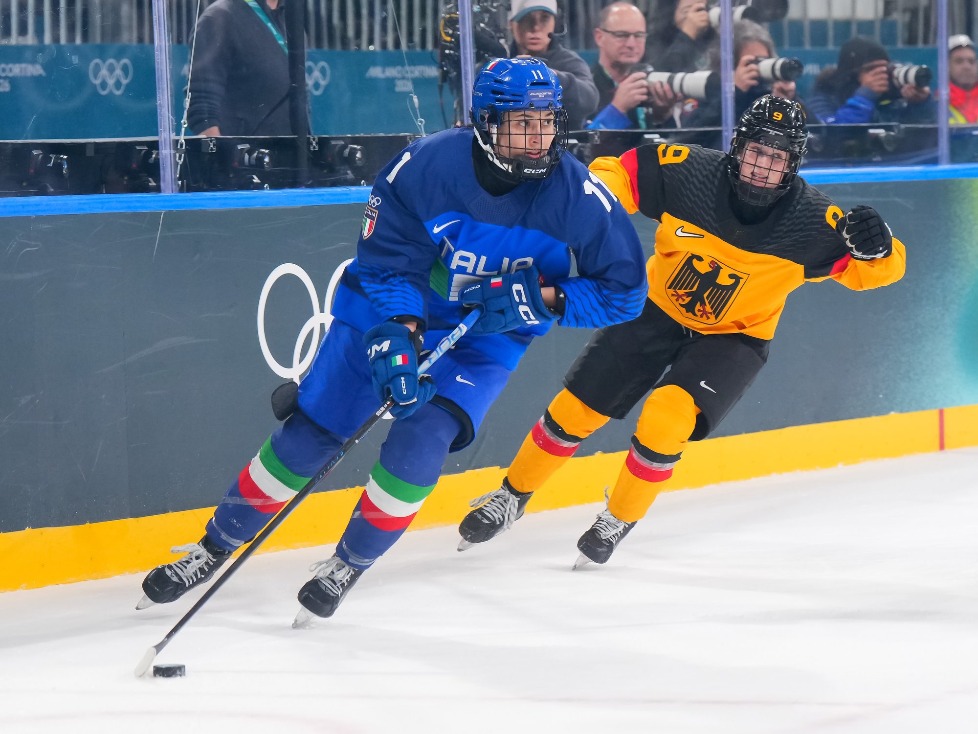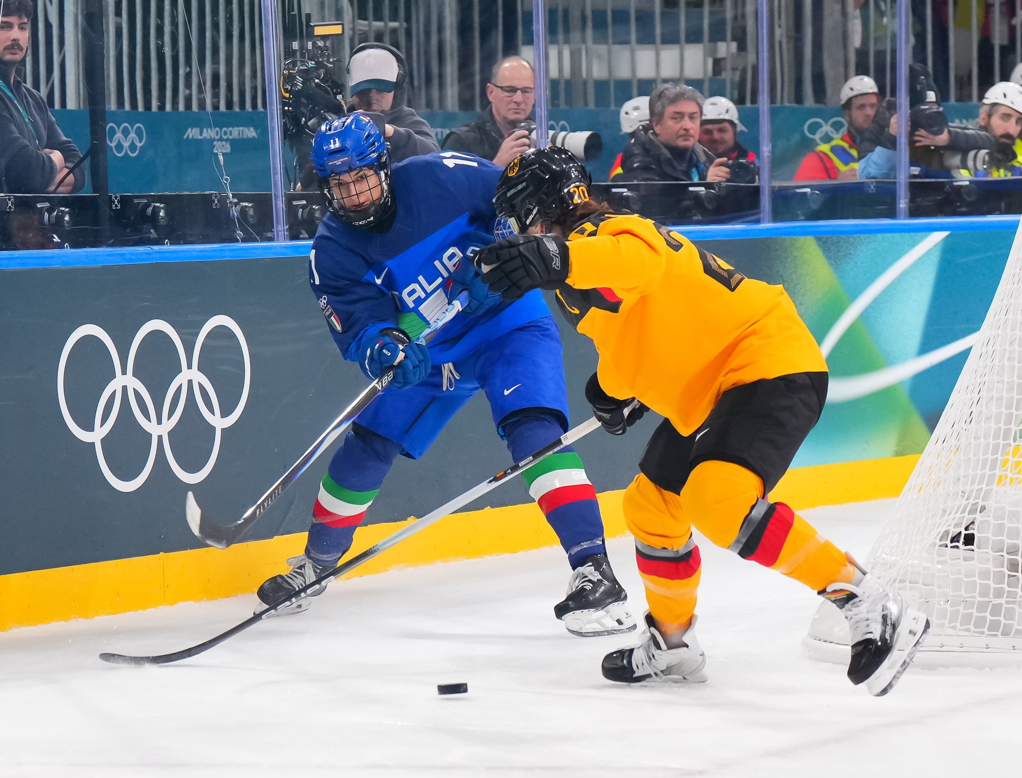 In a scoreless first period, Italy and Germany played hard and gritty from the drop of the puck. Durante foiled Svenja Voigt’s breakaway attempt in the first minute. It got physical early on as well. Italy's Anna Caumo was left gasping when Kluge tumbled on top of her in open ice. The packed rink rocked with chants of “Italia!”