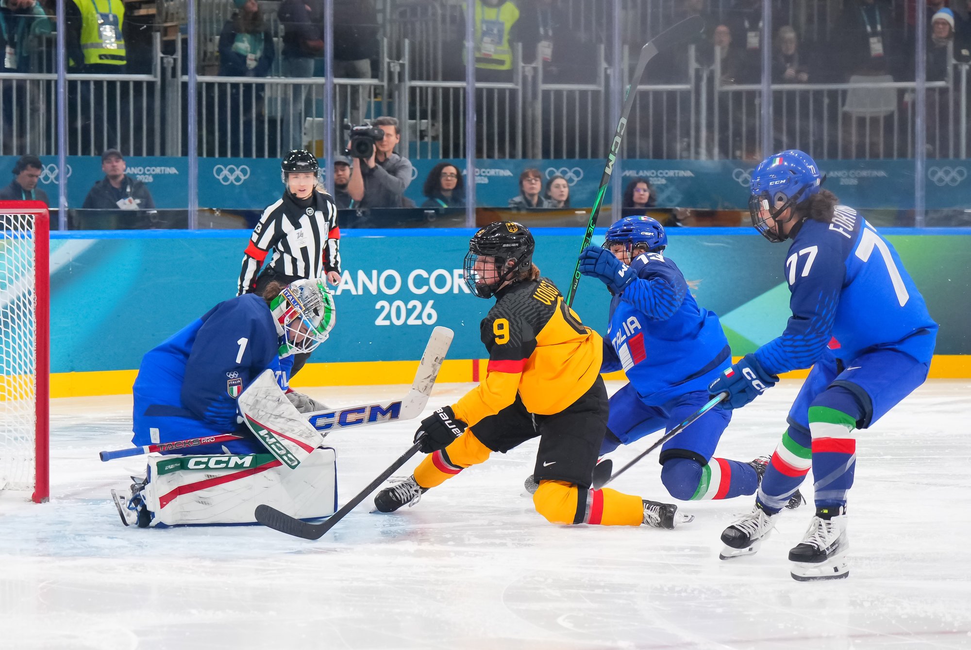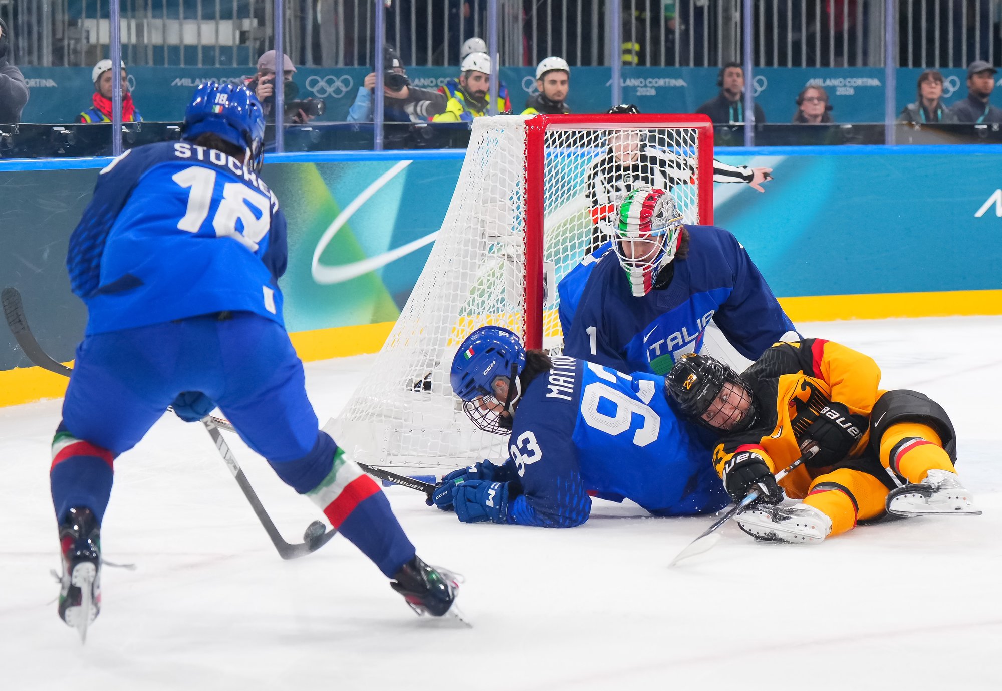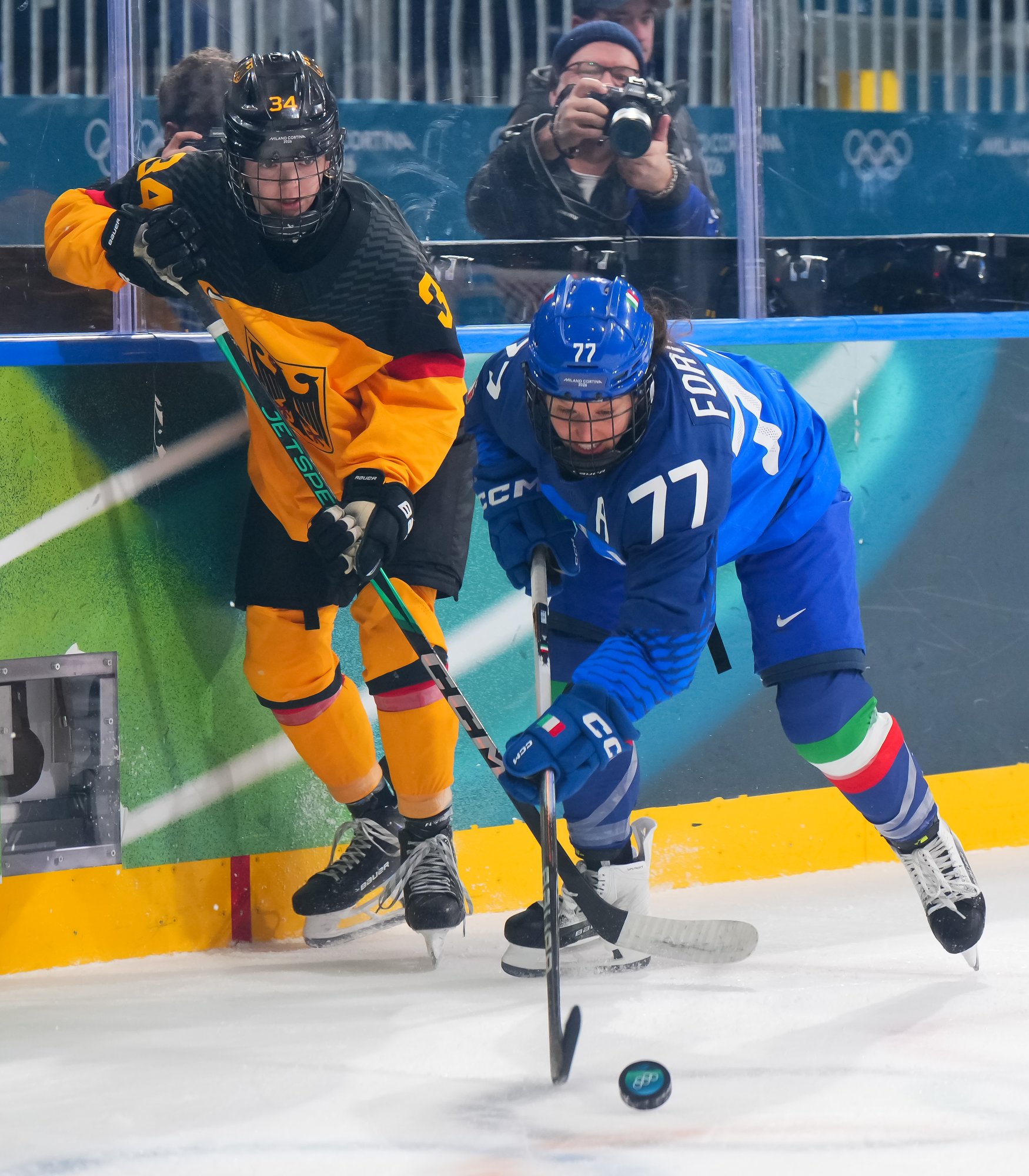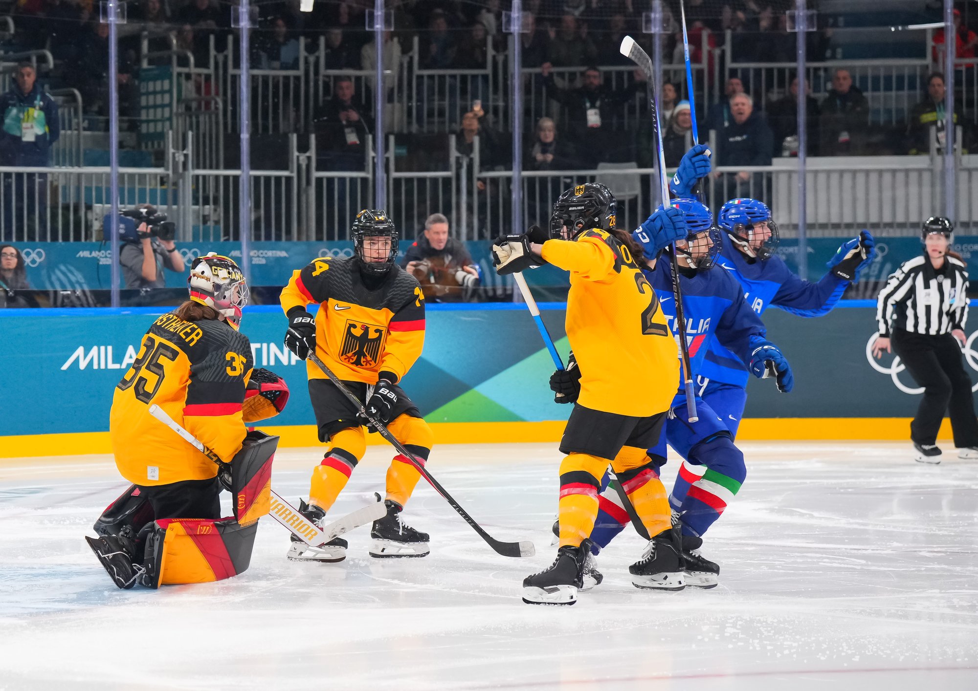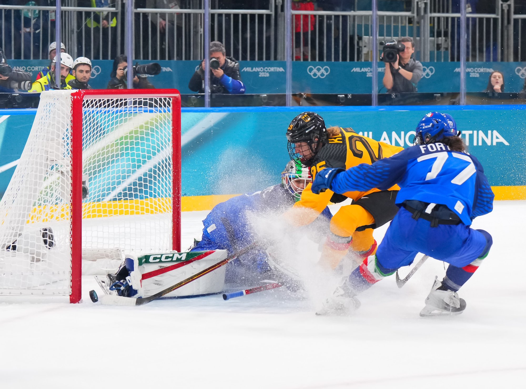 In a scoreless first period, Italy and Germany played hard and gritty from the drop of the puck. Durante foiled Svenja Voigt’s breakaway attempt in the first minute. It got physical early on as well. Italy's Anna Caumo was left gasping when Kluge tumbled on top of her in open ice. The packed rink rocked with chants of “Italia!”