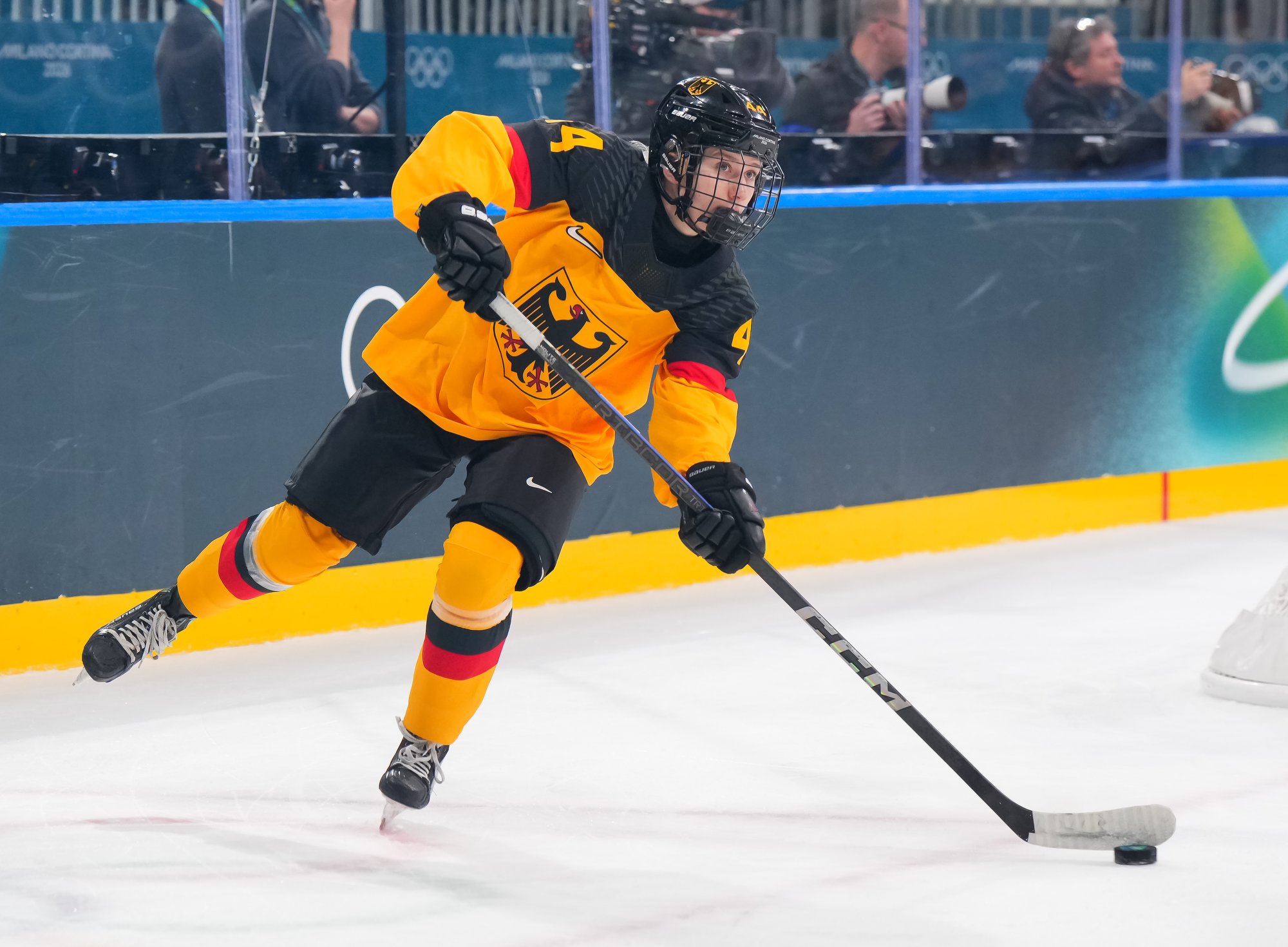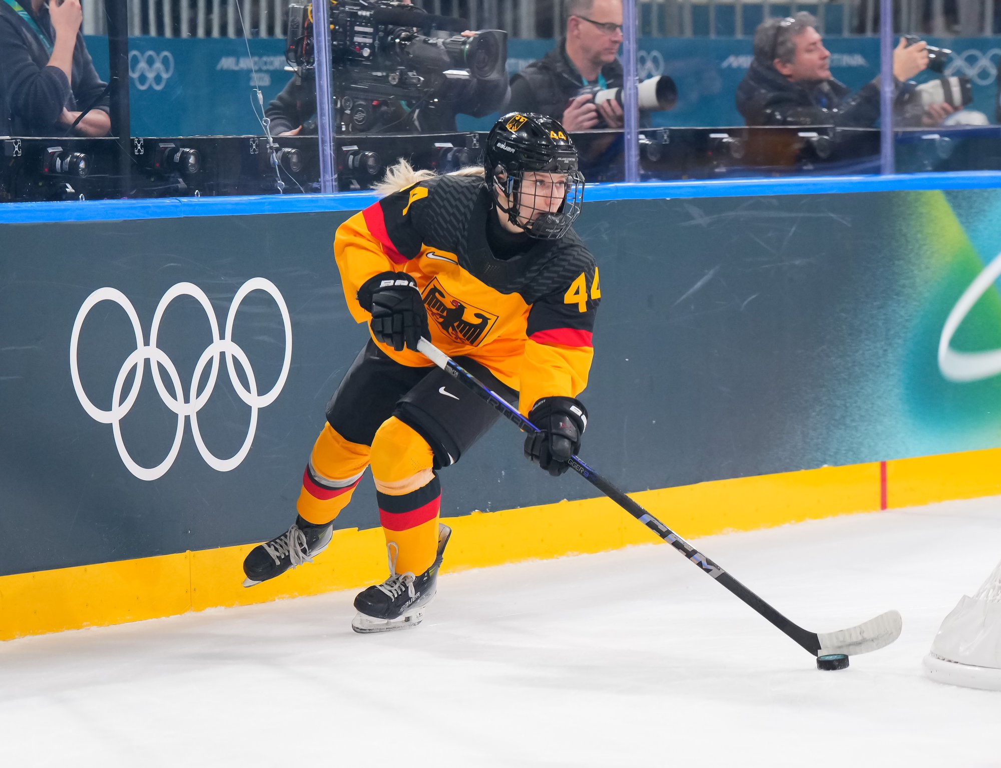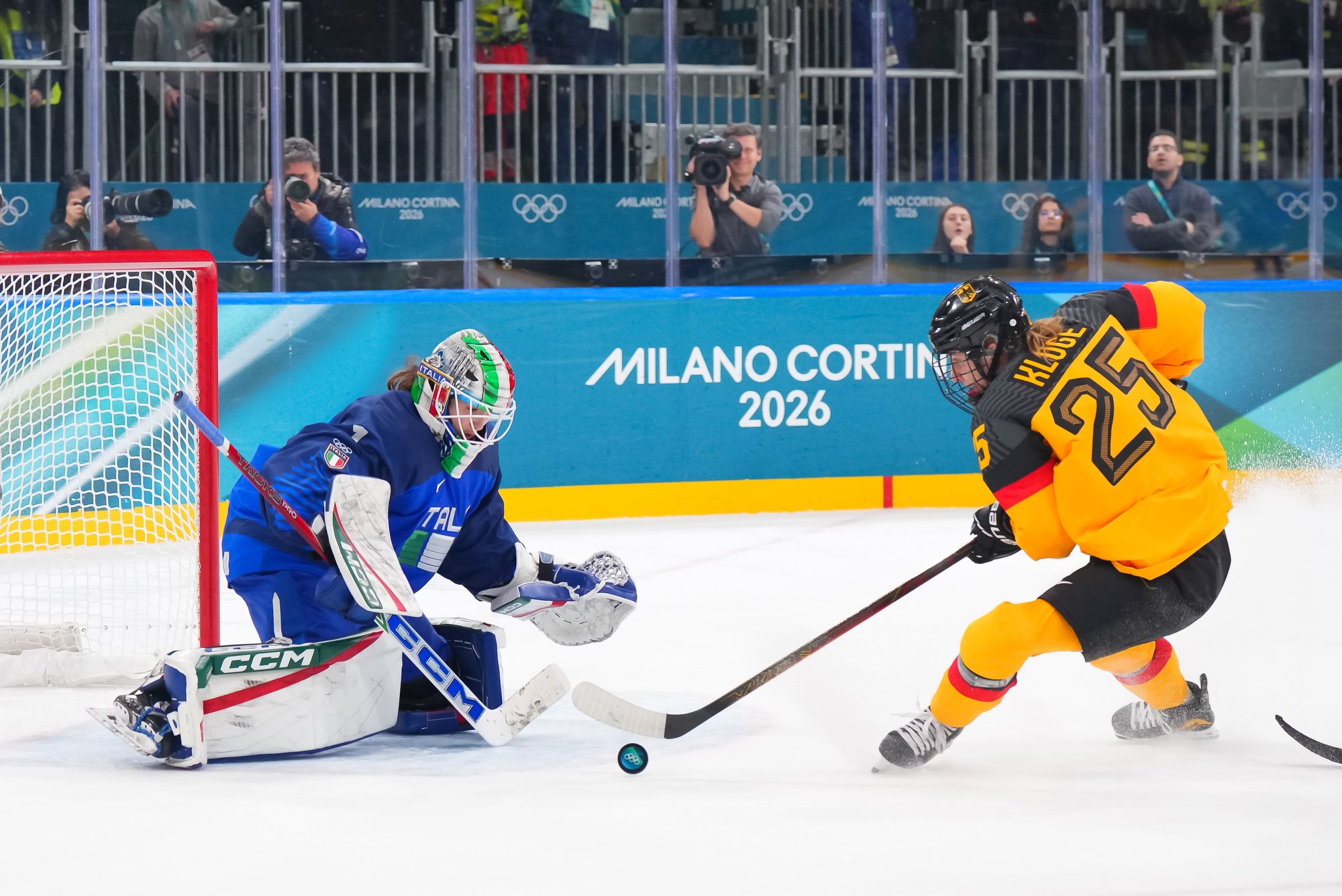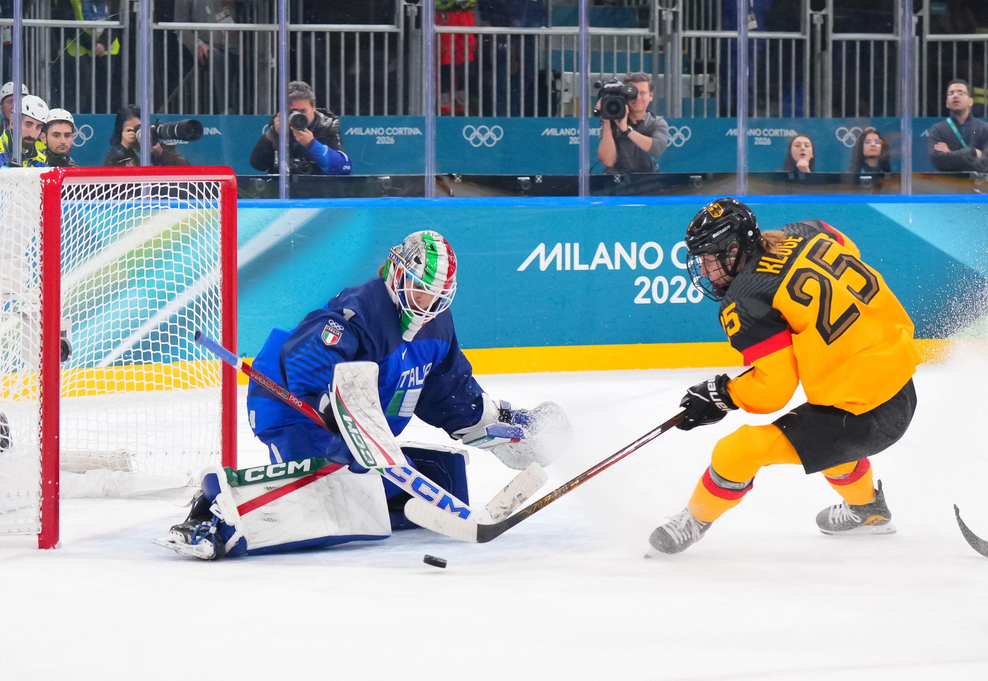 In a scoreless first period, Italy and Germany played hard and gritty from the drop of the puck. Durante foiled Svenja Voigt’s breakaway attempt in the first minute. It got physical early on as well. Italy's Anna Caumo was left gasping when Kluge tumbled on top of her in open ice. The packed rink rocked with chants of “Italia!”