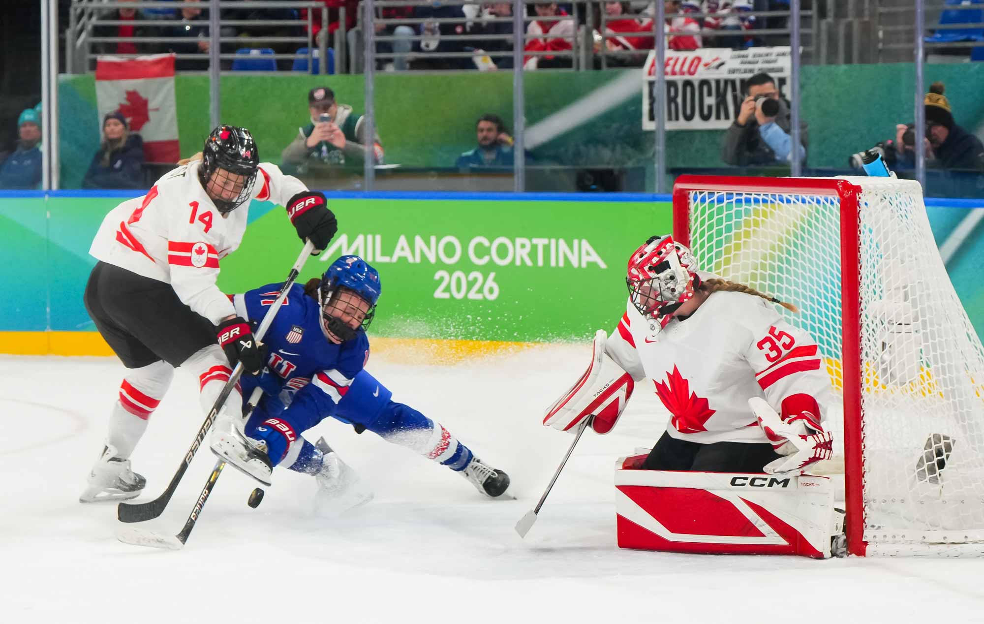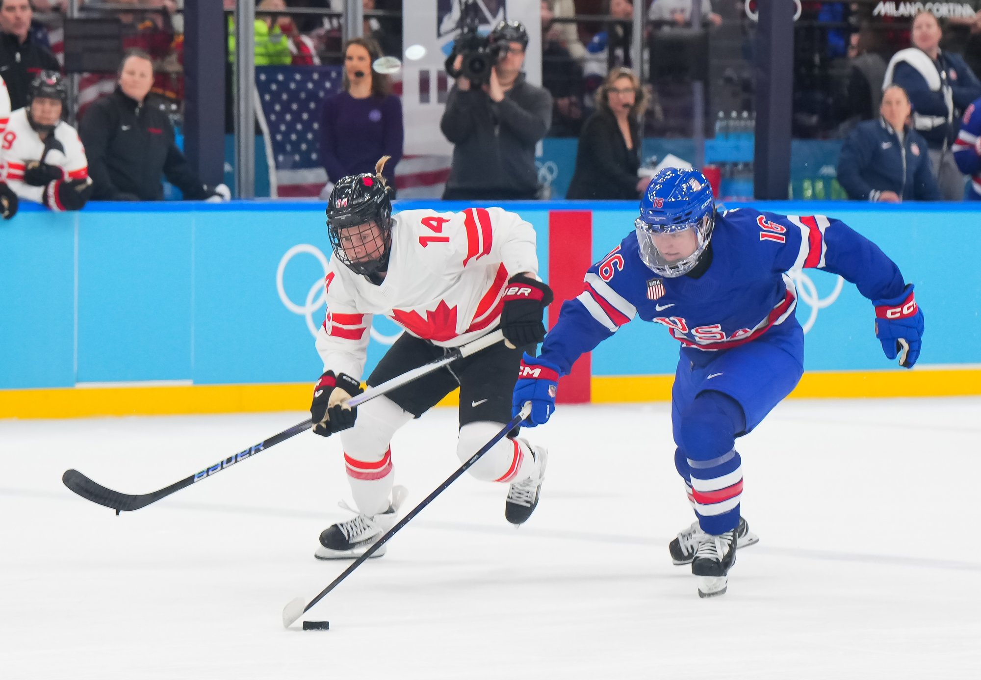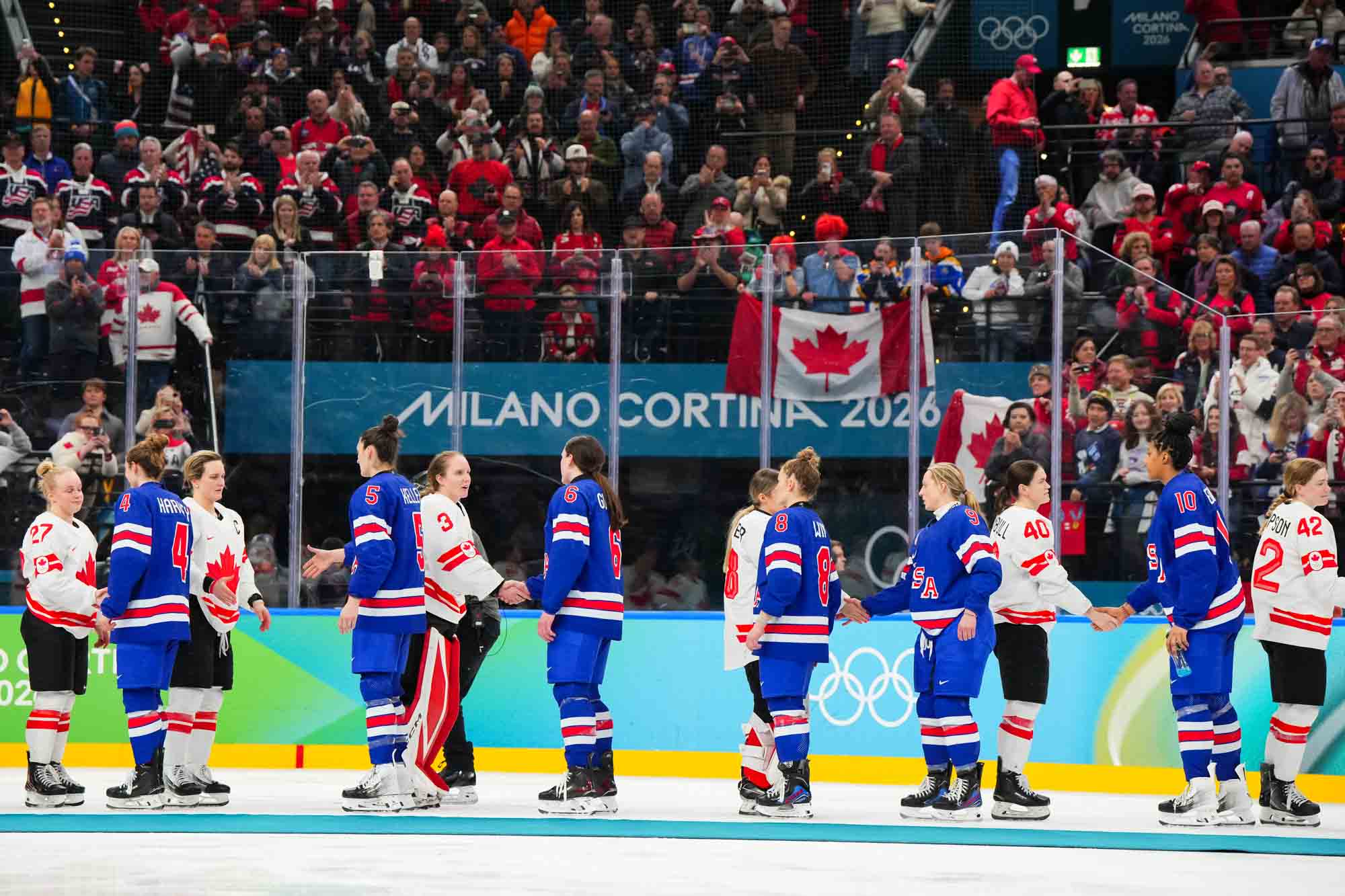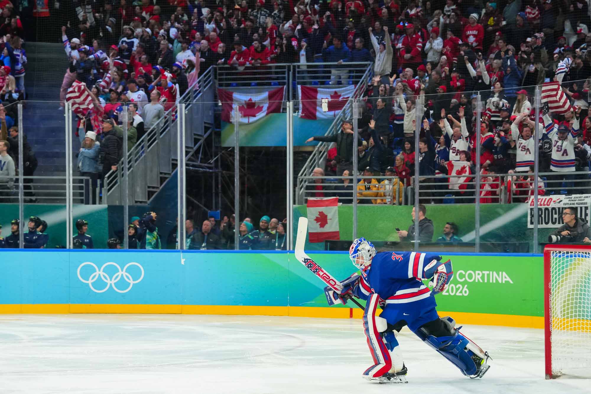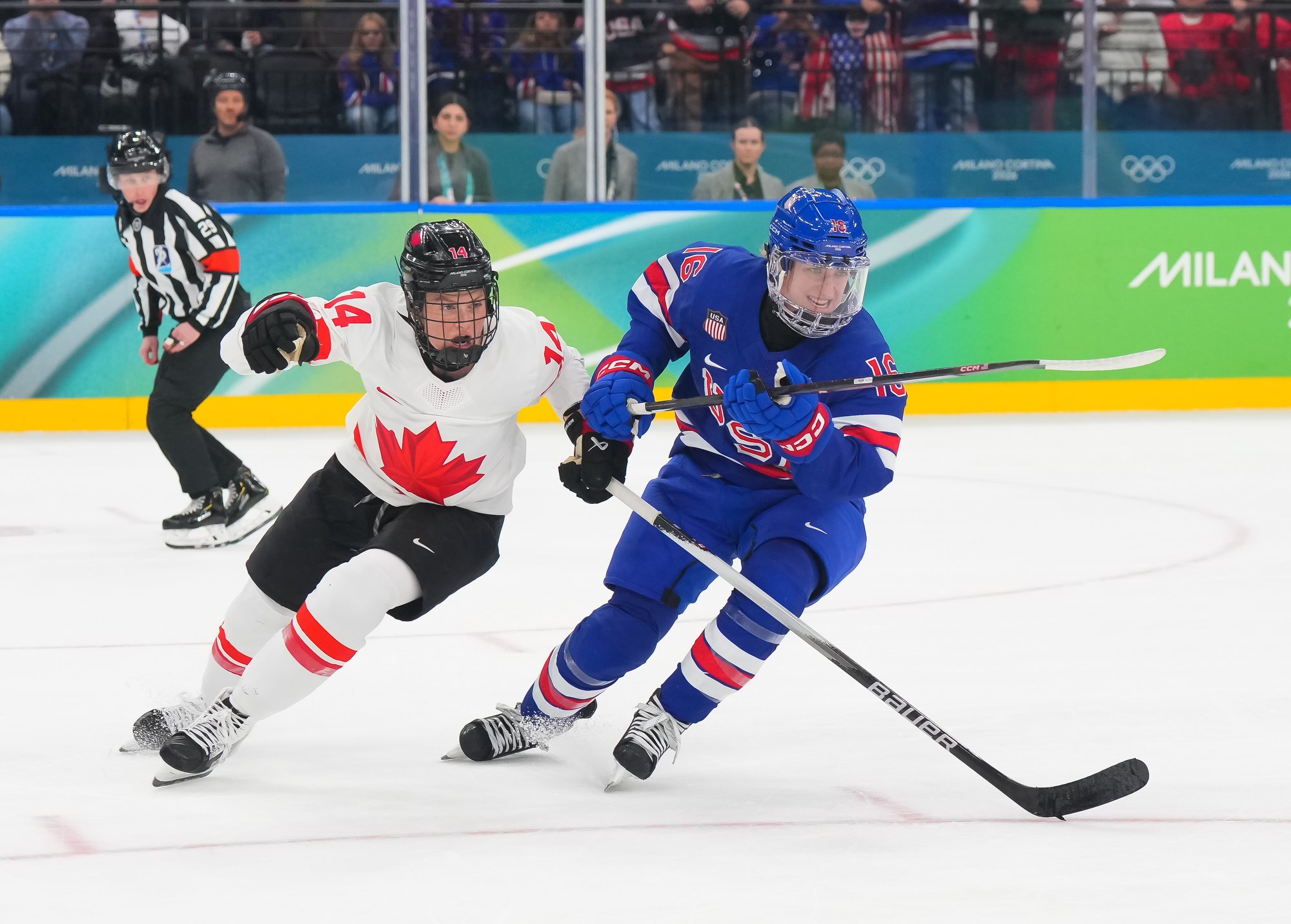 Santagiulia was packed with screaming fans, split more or less evenly between the two nations, and they had plenty to cheer for right from the get-go. Canada’s biggest challenge was to negate the U.S.’s flow and speed. To that end, they dumped the puck in and made the American defence chase the puck. In trouble in their own end, they cleared the puck to open ice, again forcing the Americans to chase down every loose puck. One-on-one battles along the boards? Not so much. Canada wasn’t interested.