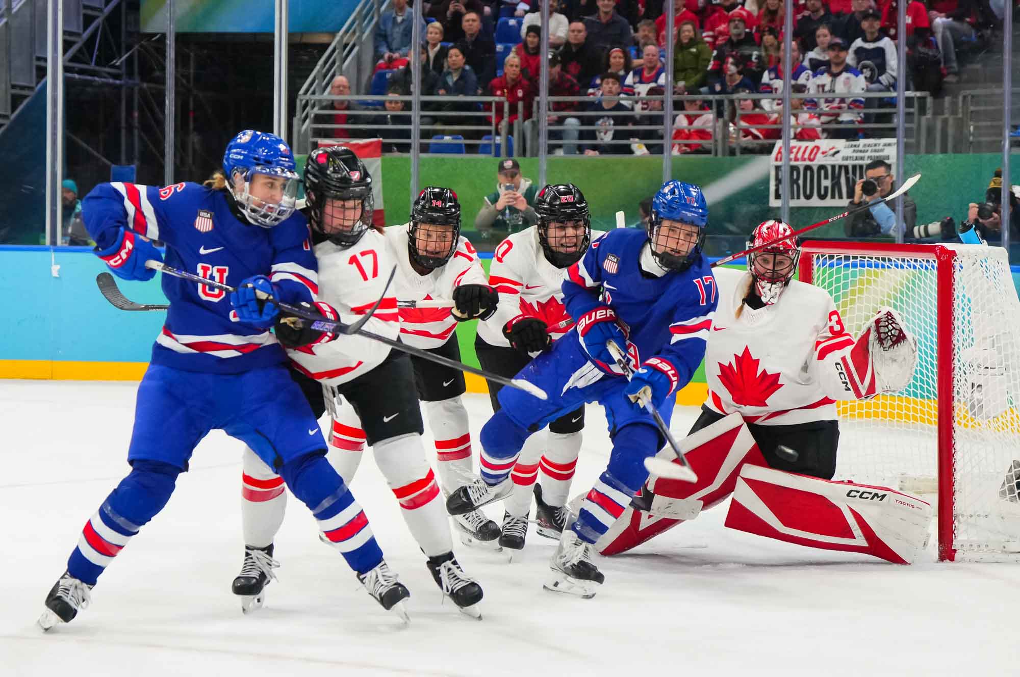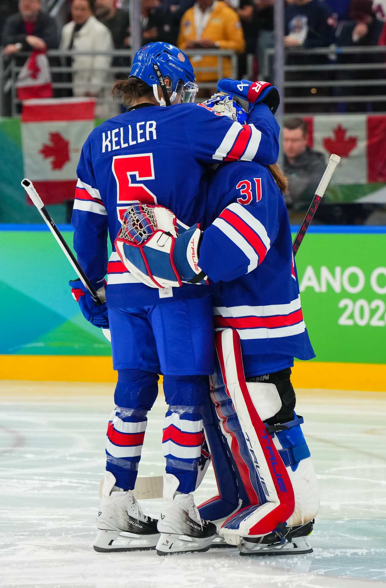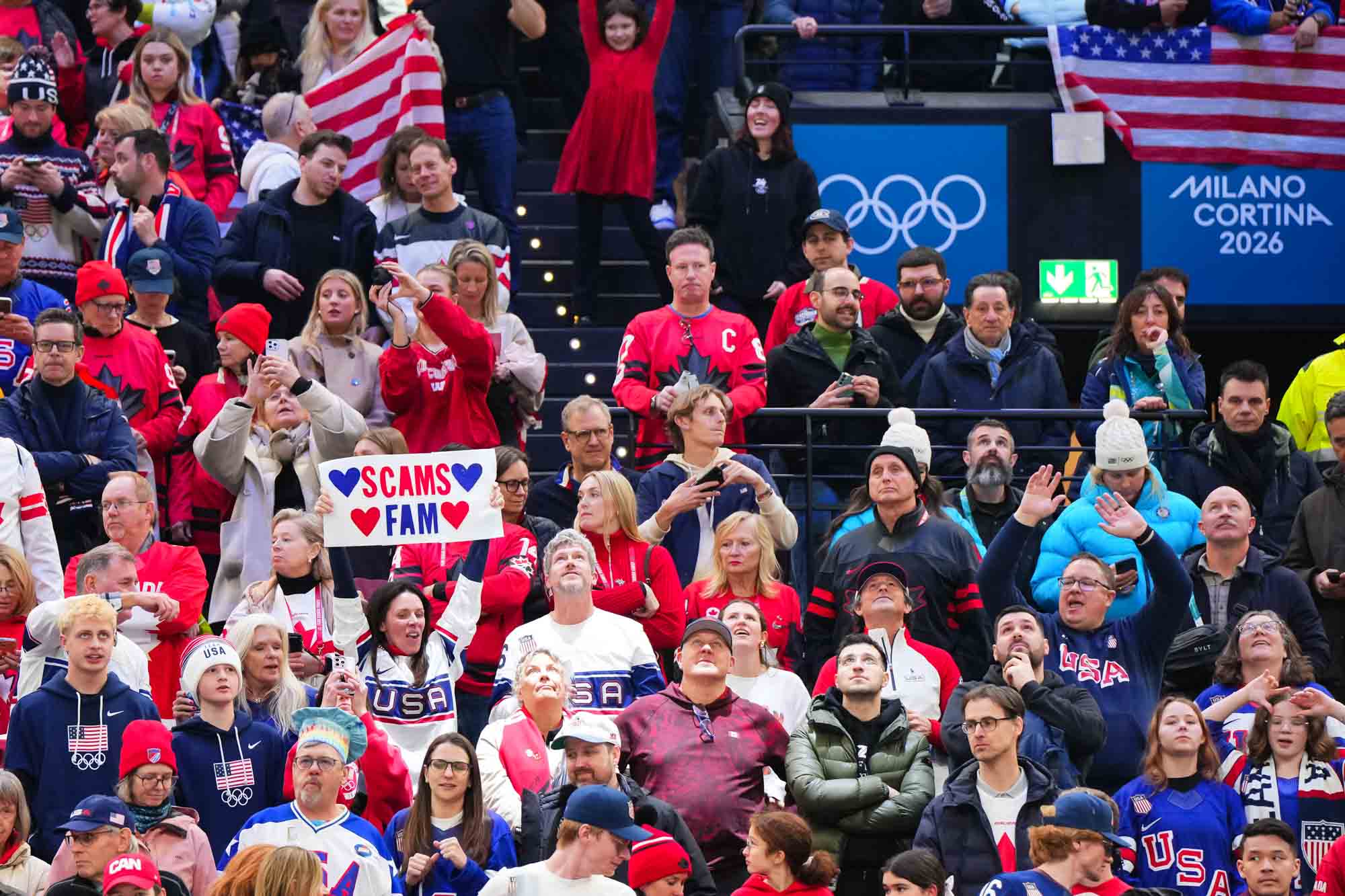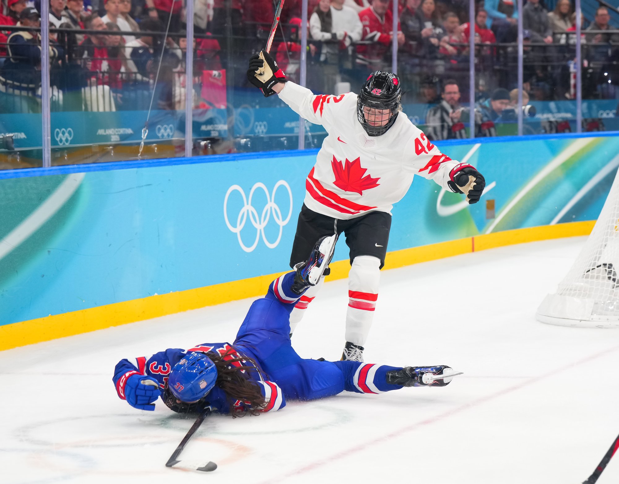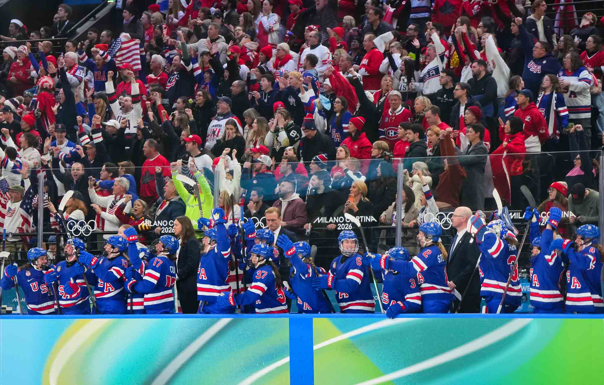 Santagiulia was packed with screaming fans, split more or less evenly between the two nations, and they had plenty to cheer for right from the get-go. Canada’s biggest challenge was to negate the U.S.’s flow and speed. To that end, they dumped the puck in and made the American defence chase the puck. In trouble in their own end, they cleared the puck to open ice, again forcing the Americans to chase down every loose puck. One-on-one battles along the boards? Not so much. Canada wasn’t interested.