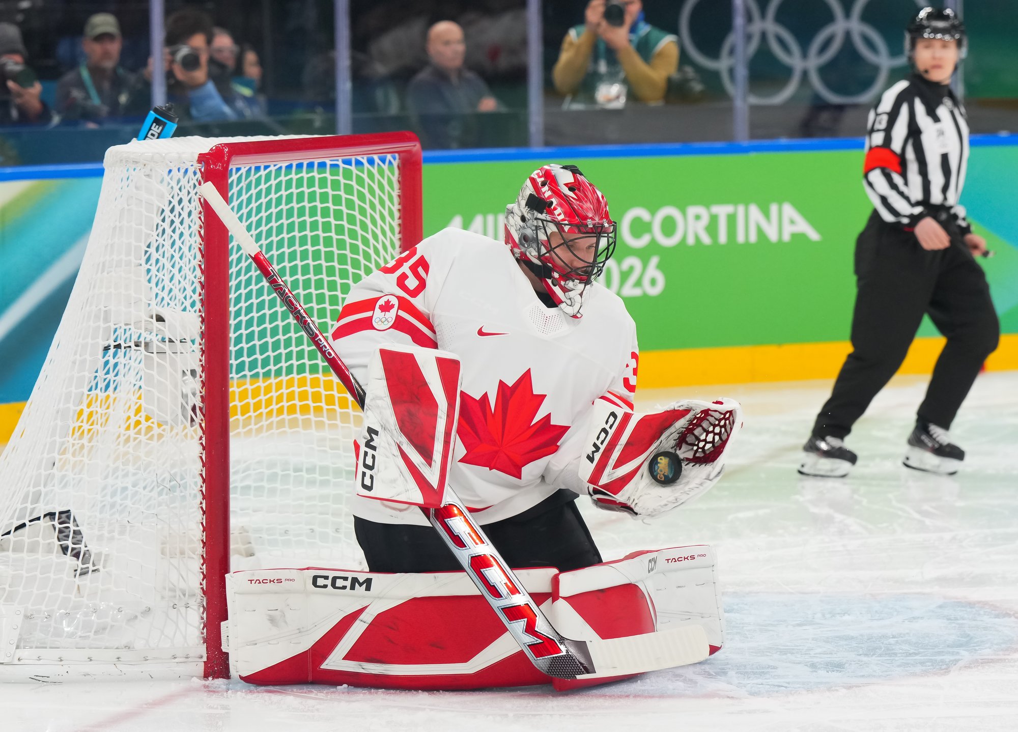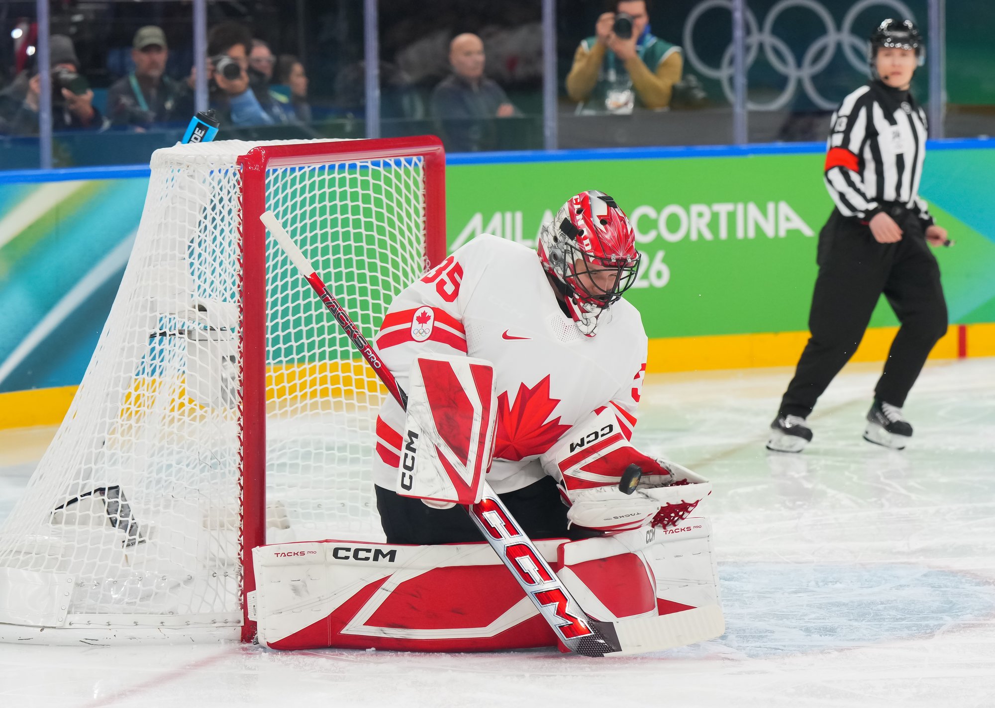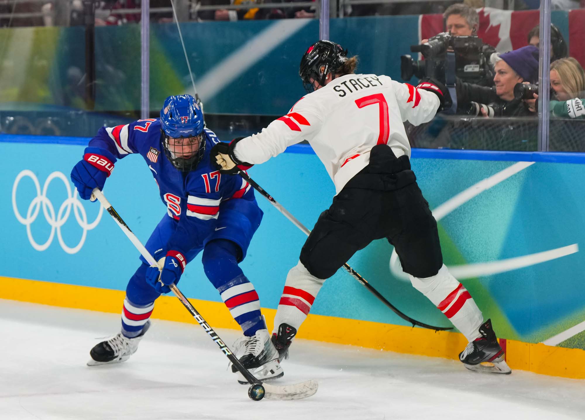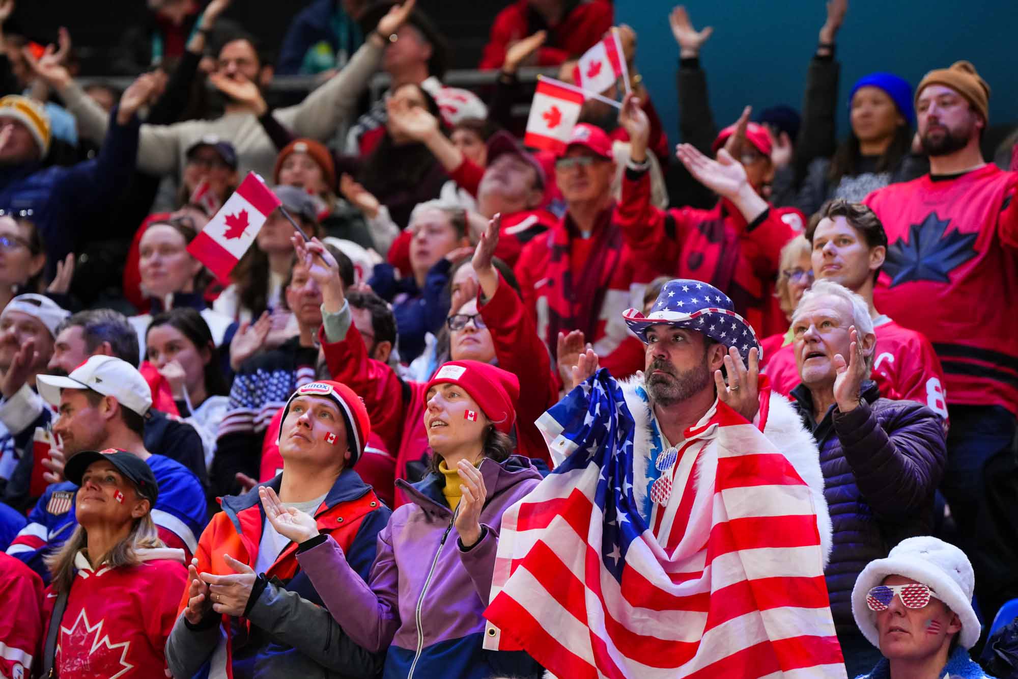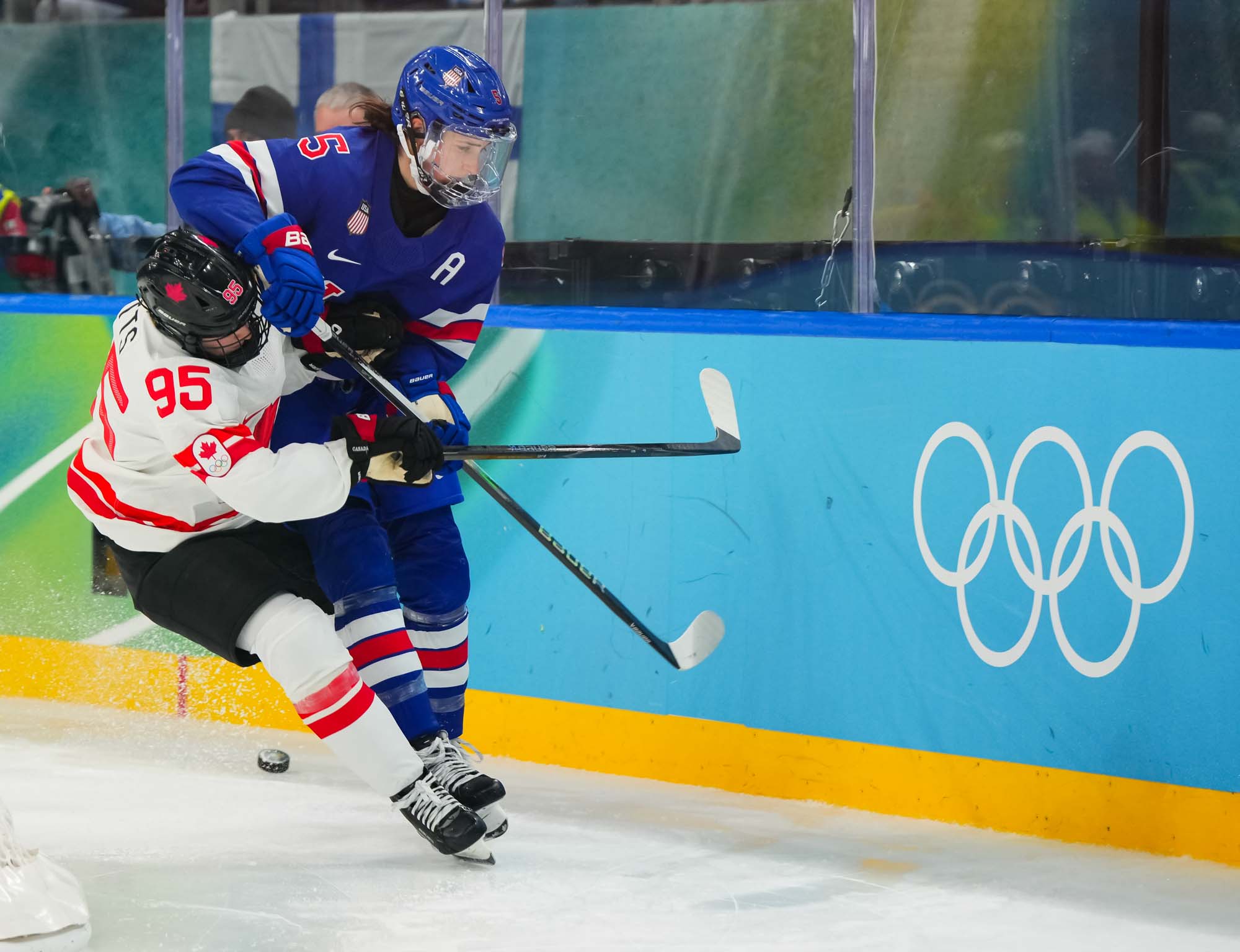 Santagiulia was packed with screaming fans, split more or less evenly between the two nations, and they had plenty to cheer for right from the get-go. Canada’s biggest challenge was to negate the U.S.’s flow and speed. To that end, they dumped the puck in and made the American defence chase the puck. In trouble in their own end, they cleared the puck to open ice, again forcing the Americans to chase down every loose puck. One-on-one battles along the boards? Not so much. Canada wasn’t interested.