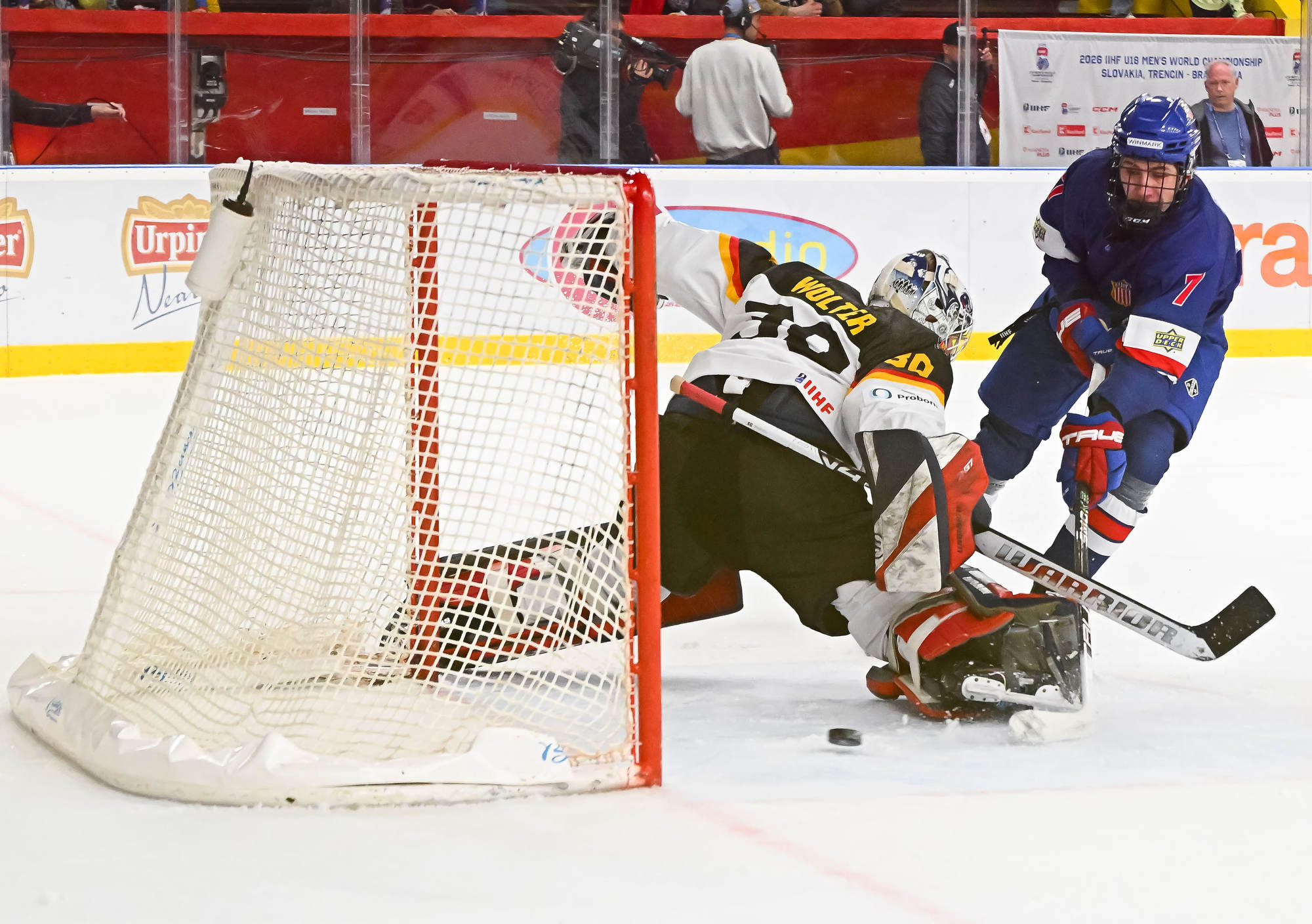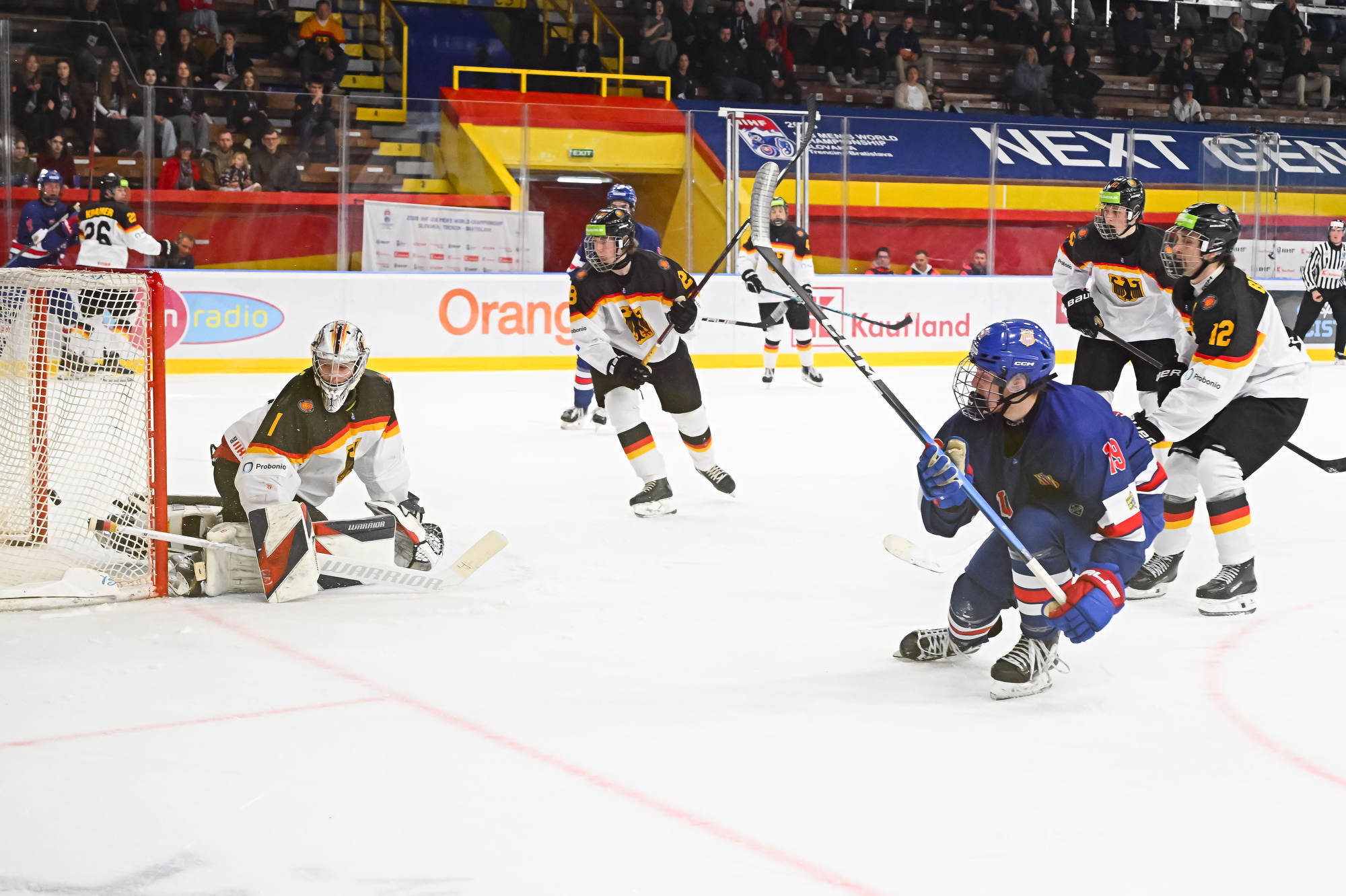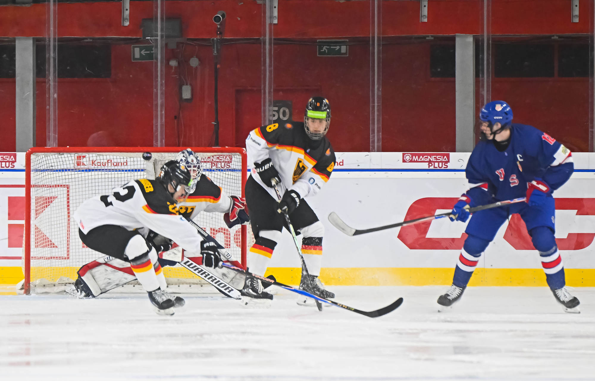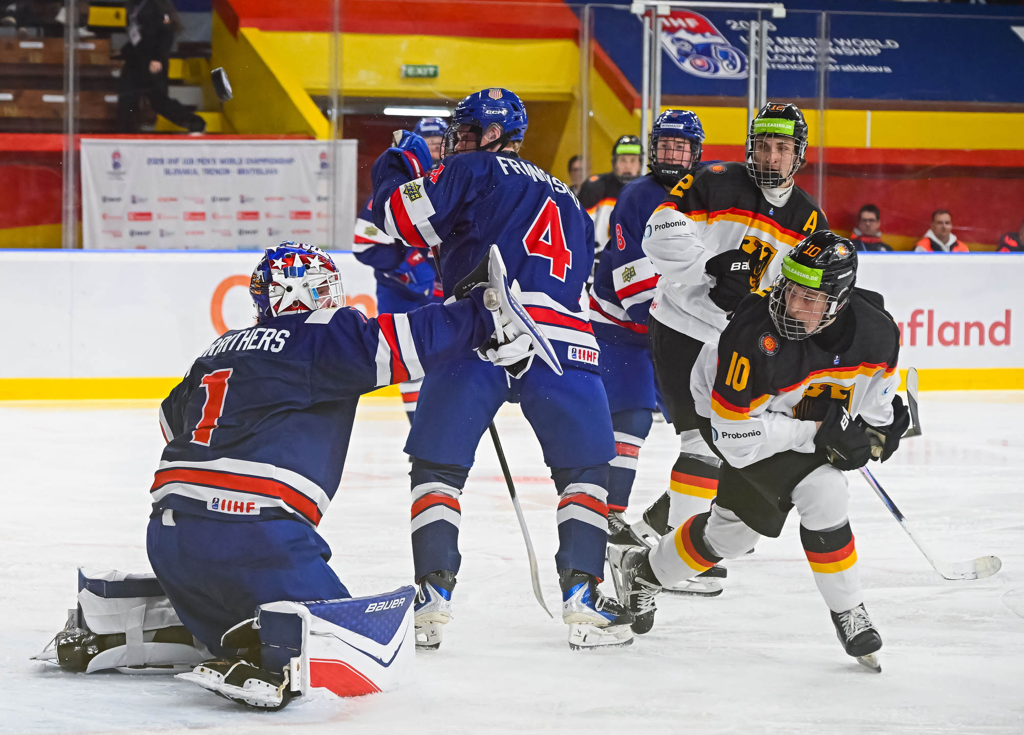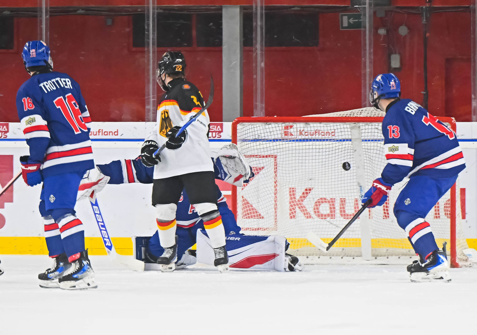 With the score 10-1 with 13:14 remaining in the third period, the German power play struck for the second time. Carrithers stopped Darian Rolsing’s shot from the point, but Luis Becker was in position to put in the rebound.